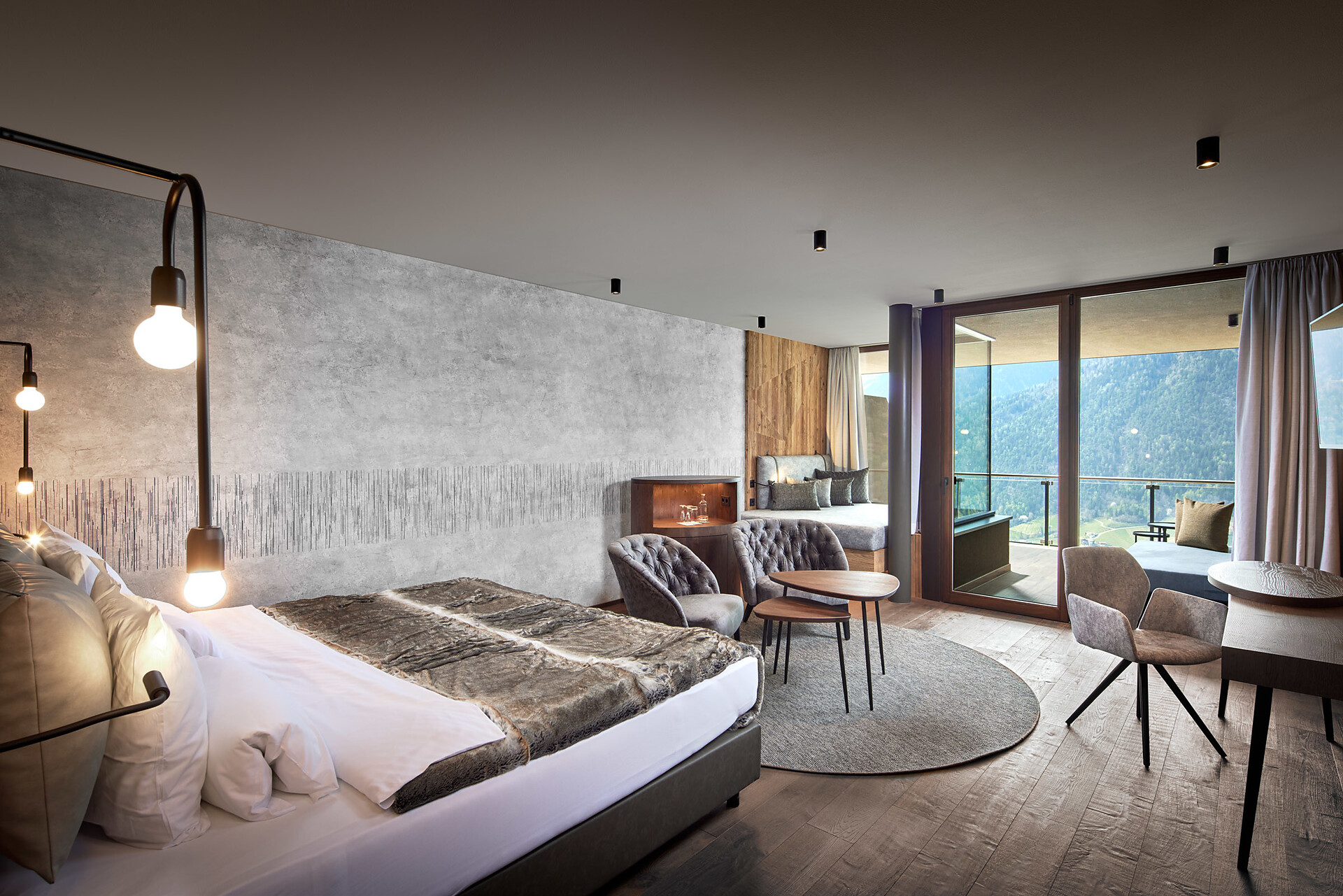 Suite "Sonnentraum Wellness & Spa" (ca. 36m²), nichtraucher, im alpinen Style eingerichtet, mit elegantem Altholz, Schlaf-Wohnraum, große Fensterfront zur Südseite, mit traumhaftem Ausblick, klimatisiert, Physiotherm Infrarotkabine, Bad, Dusche, Badewanne, getrenntes WC & Bidet, Kosmetikspiegel, Haarfoen, Flachbild-SAT-TV, Frigobar, WLAN, Tel, Safe, Südbalkon mit Sitzgarnitur, Dachgarten mit Liegen, Finnische Panoramasauna und exklusivem Whirlpool (der Whirlpool ist von 09.00 Uhr bis 22.00 Uhr nutzbar). Hunde nicht erlaubt. Tiefgaragenstellplatz inklusive.