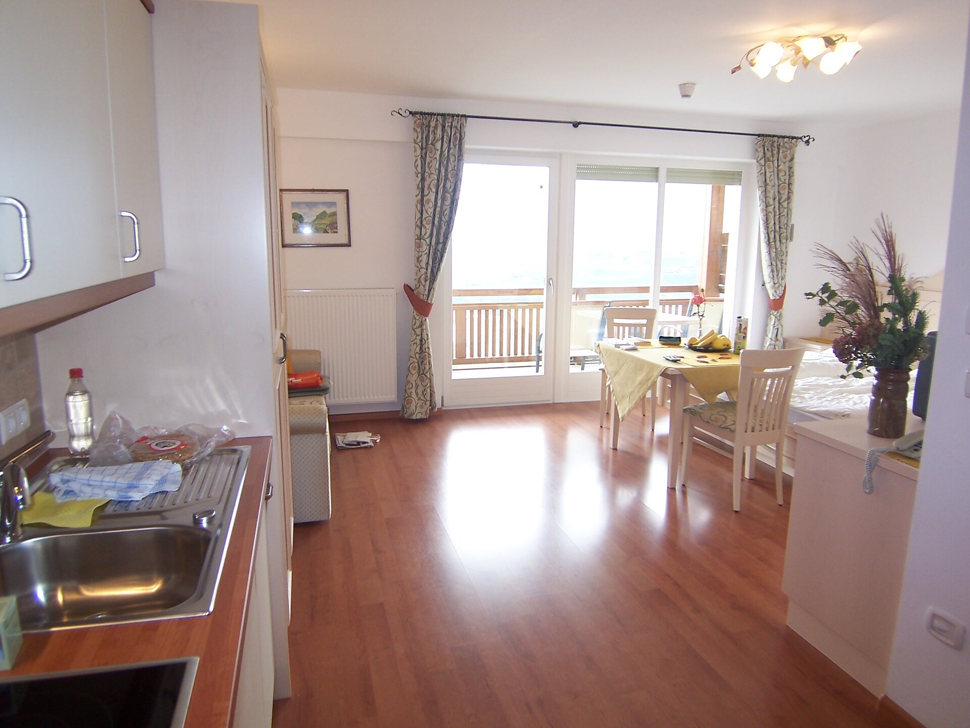 Miniappartment im Haus "Tschivon" (ca. 15m²- Maximalbelegung 2 Pers.) mit Ostfenster, bestehend aus einem Wohnschlafraum mit Doppelbett, Tisch und 2 Stühle, Küchenzeile (Ceran- Herd, Kühlschrank, Kaffeemaschine, Toaster, Wasserkocher), Dusche und WC. Handtücher und Bettwäsche werden gestellt. Parkplatz, Pool im Garten.