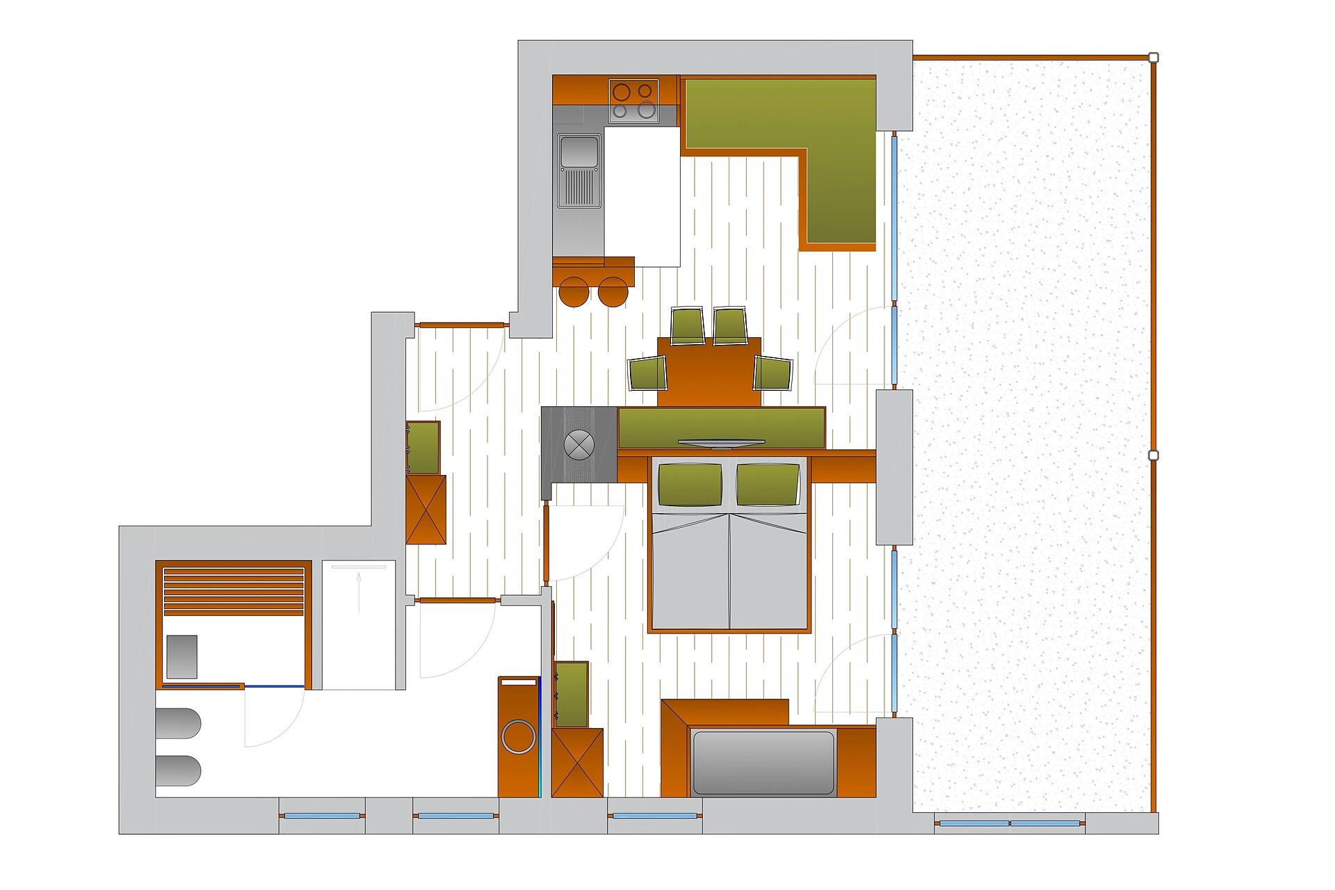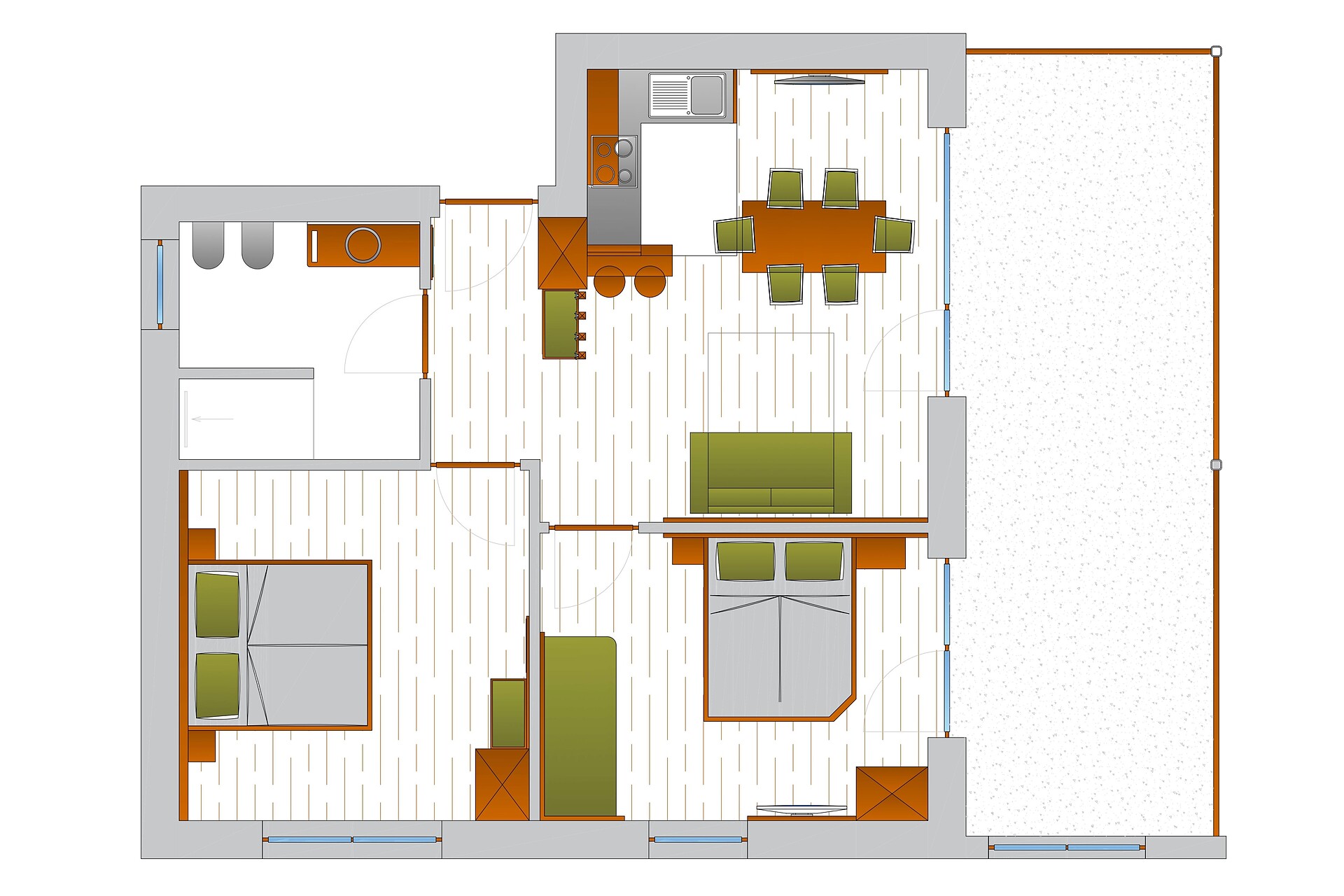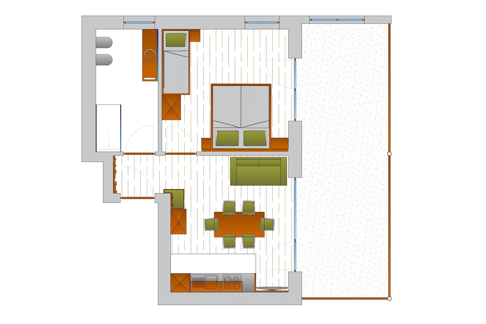 Unser Apartment öffnet seine Türen für alle, die dem Alltag entfliehen und die Dolomiten genießen möchten. Zwei Schlafzimmer mit Doppelbett, eines zusätzlich mit Liegelounge für eine weitere Person. Die große, private Panoramaloggia schenkt weite Ausblicke auf Wälder und Berge – ein Ort zum Staunen, Entspannen und Wohlfühlen.