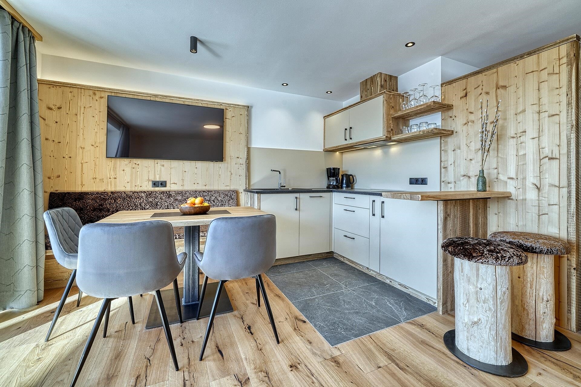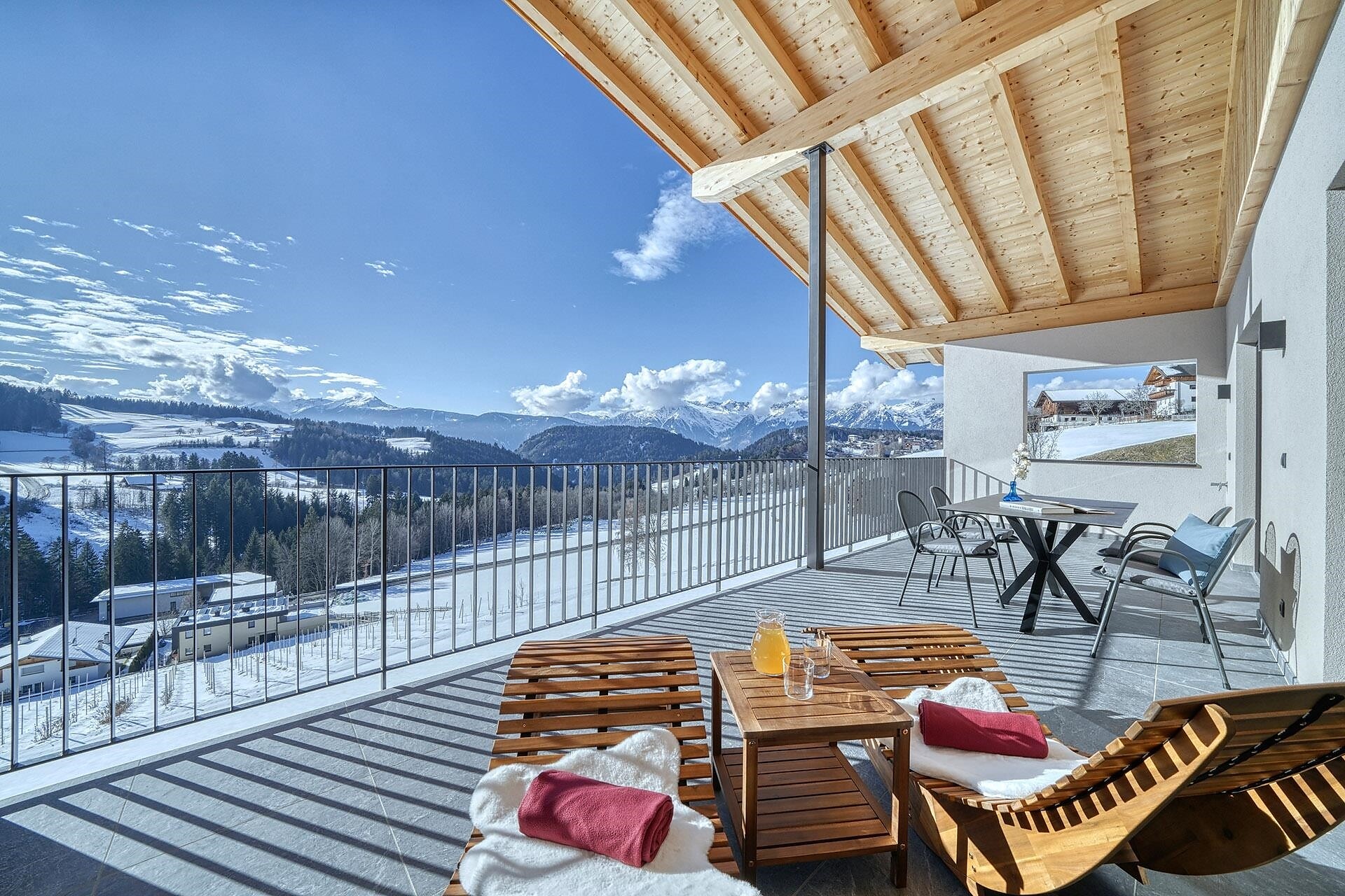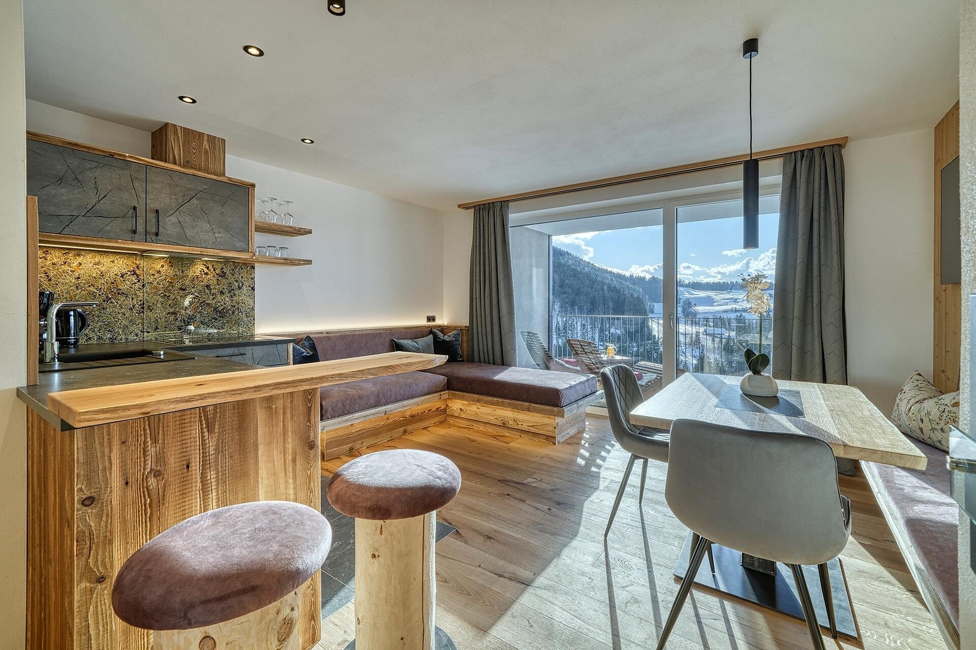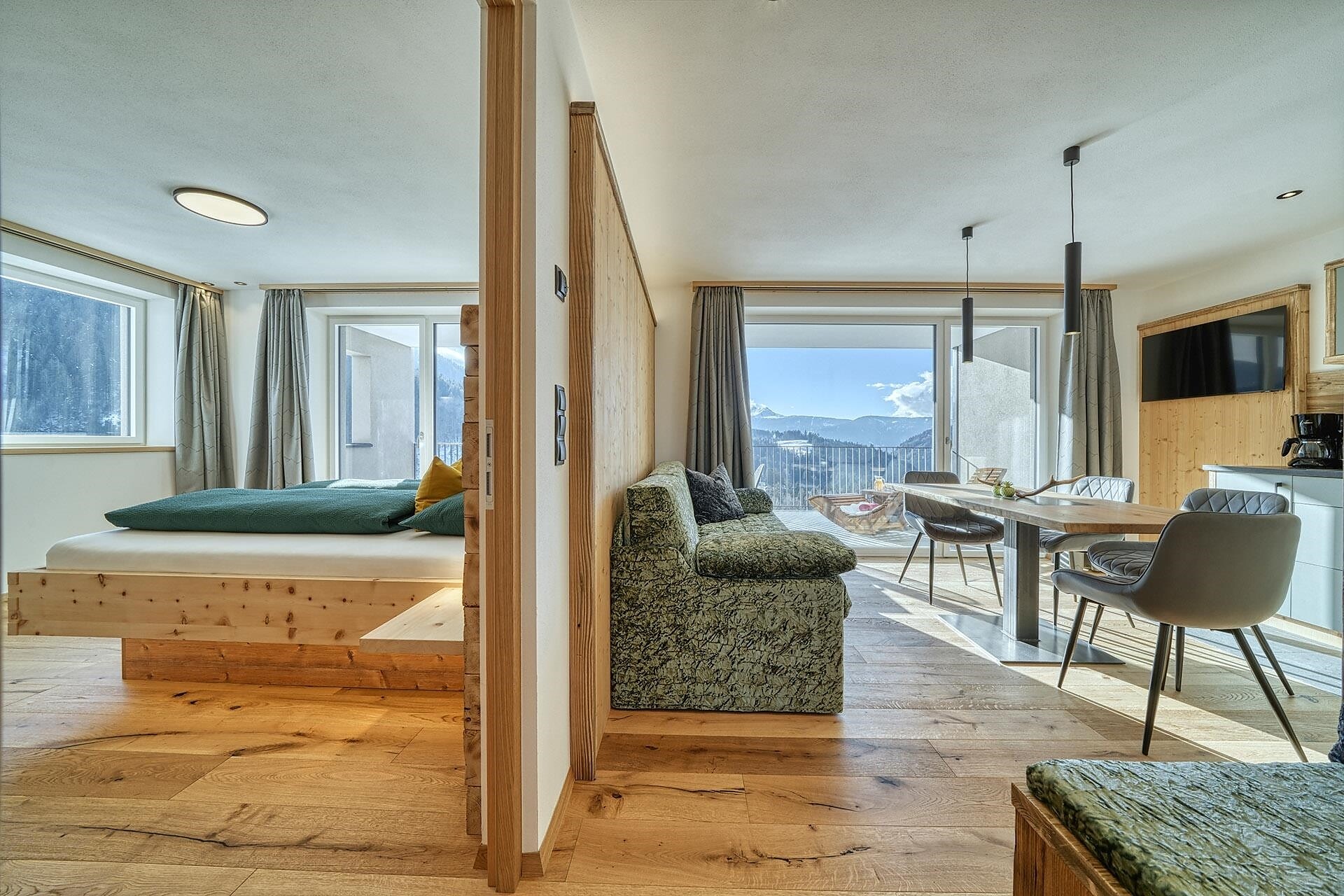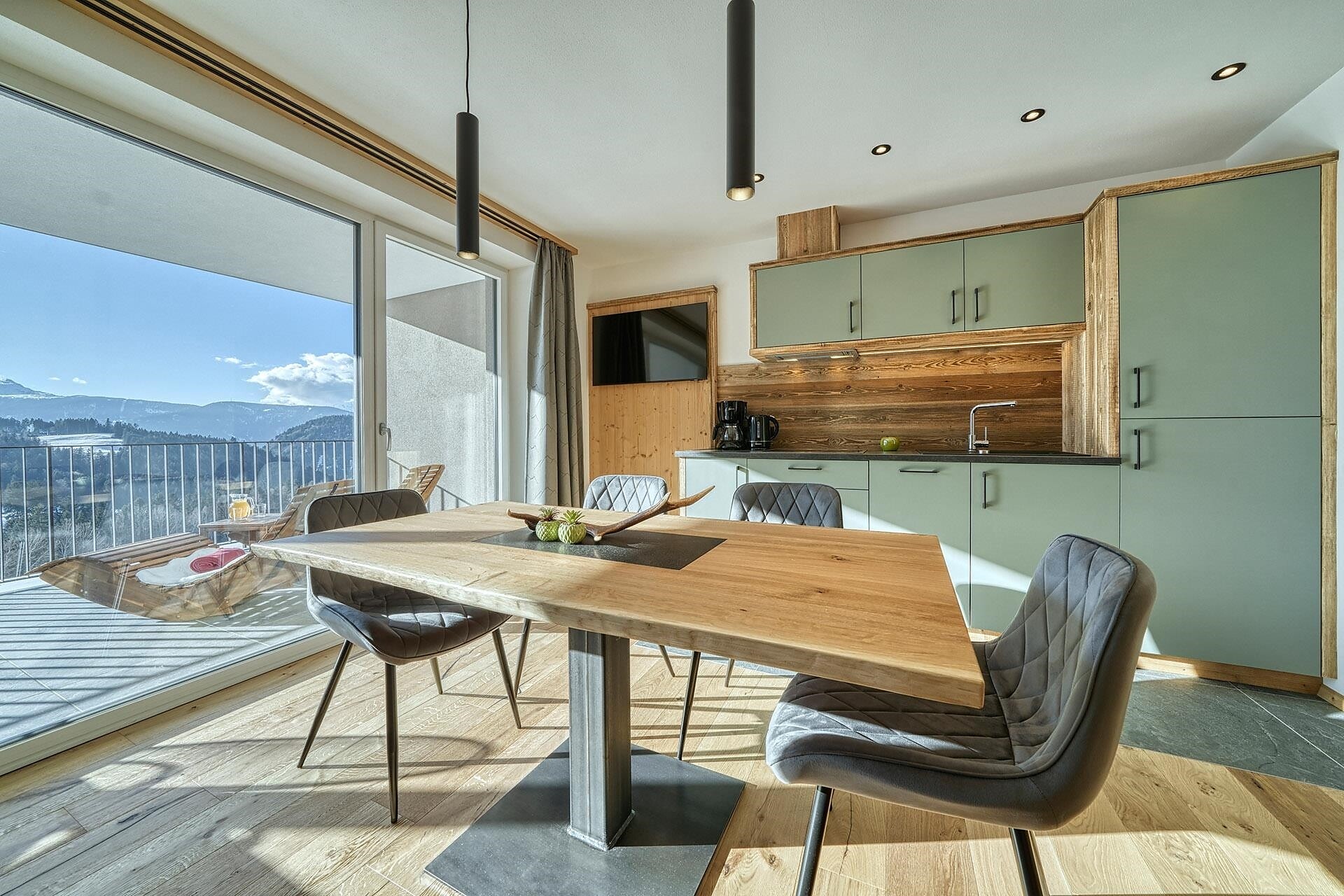 Die neuen Ferienwohnungen verbinden natürlichen Holzcharme mit modernem Design und bieten einen traumhaften Blick auf Wiesen, Wälder und die Südtiroler Bergwelt. Große Fenster lassen Licht und Natur ins Innere und schaffen eine behagliche, einladende Atmosphäre.