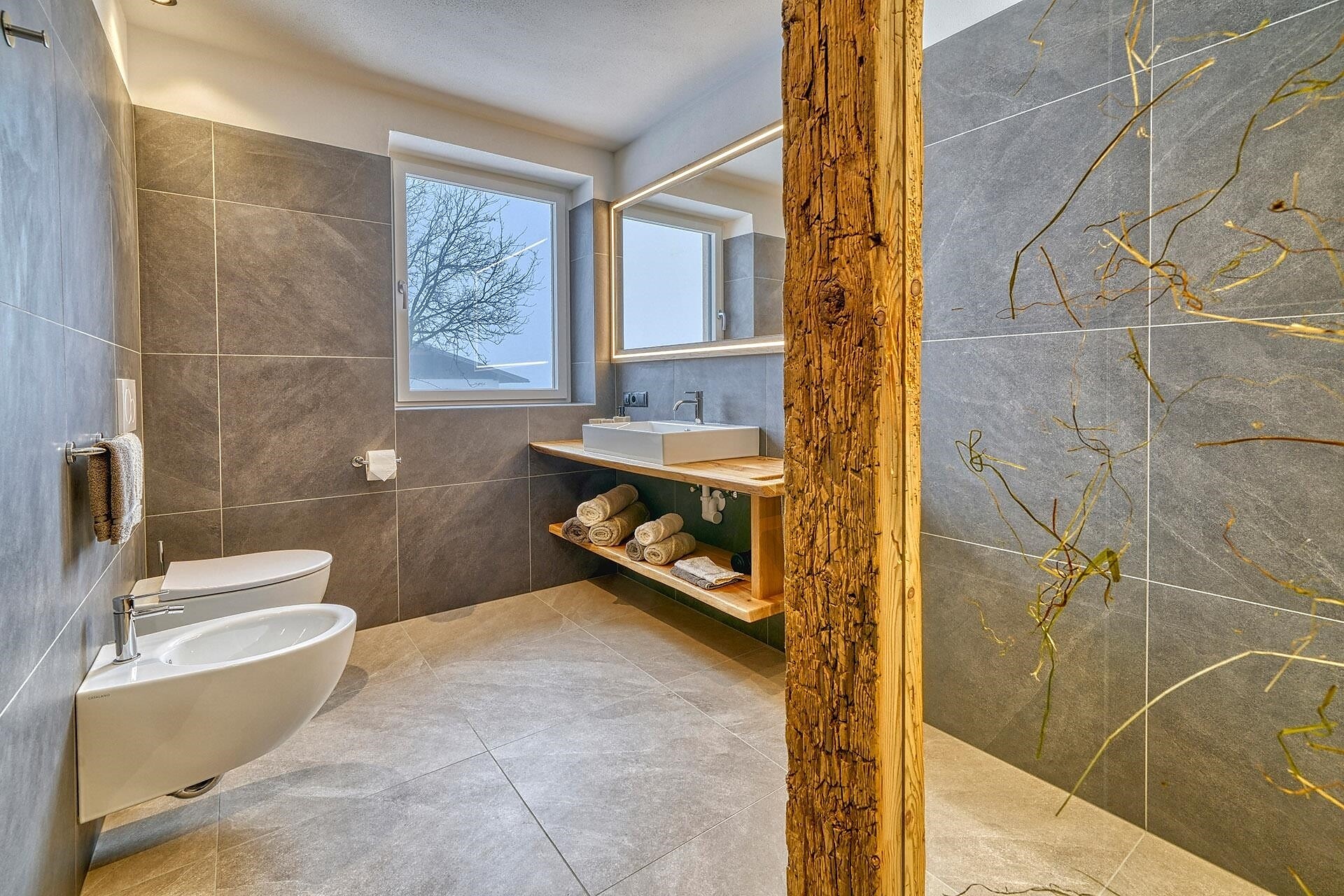 Unser Waldapartment öffnet ihre Türen für alle, die dem Alltag entfliehen und die Südtiroler Wälder genießen möchten. Ein Schlafzimmer mit Doppelbett und Stockbett für zwei Personen, natürliche Materialien und eine große, private Panoramaloggia schaffen Ruhe und Erdung. Highlight: die wunderschöne Dusche mit Heu-Glasfront.