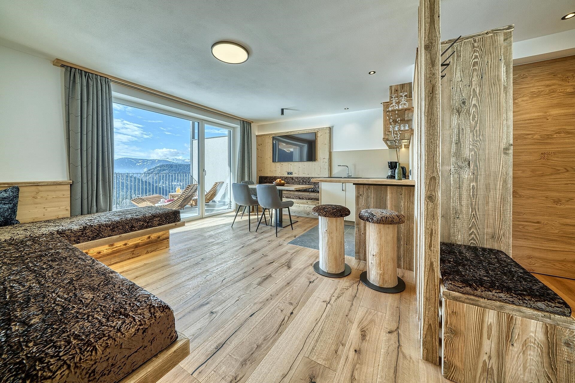 Unser Wellnessapartment lädt zum Entfliehen und Entspannen ein. Ein Schlafzimmer mit Doppelbett und Badewanne, Heuelemente, natürliche Materialien und eine große Loggia schaffen Ruhe und Wohlbefinden. Highlight: die private finnische Sauna verwöhnt Körper und Geist.