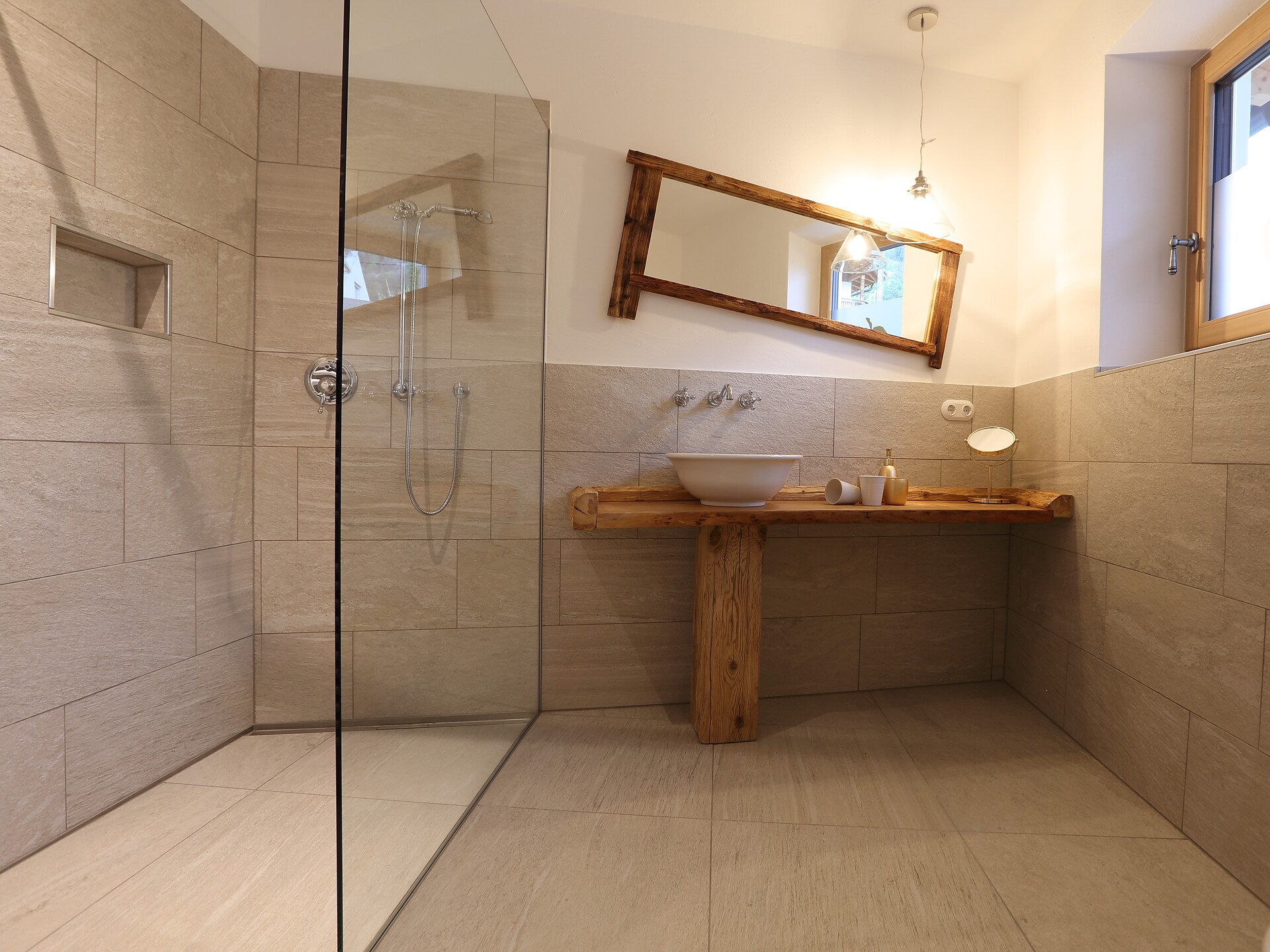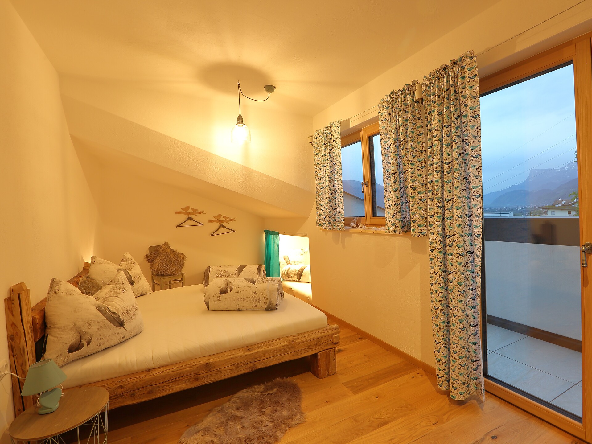 Schönes, neues Doppelzimmer mit Schlafhöhle, Balkon und eigenem Kühlschrank, begehbarer Dusche, Holzböden, TV und WLAN.
