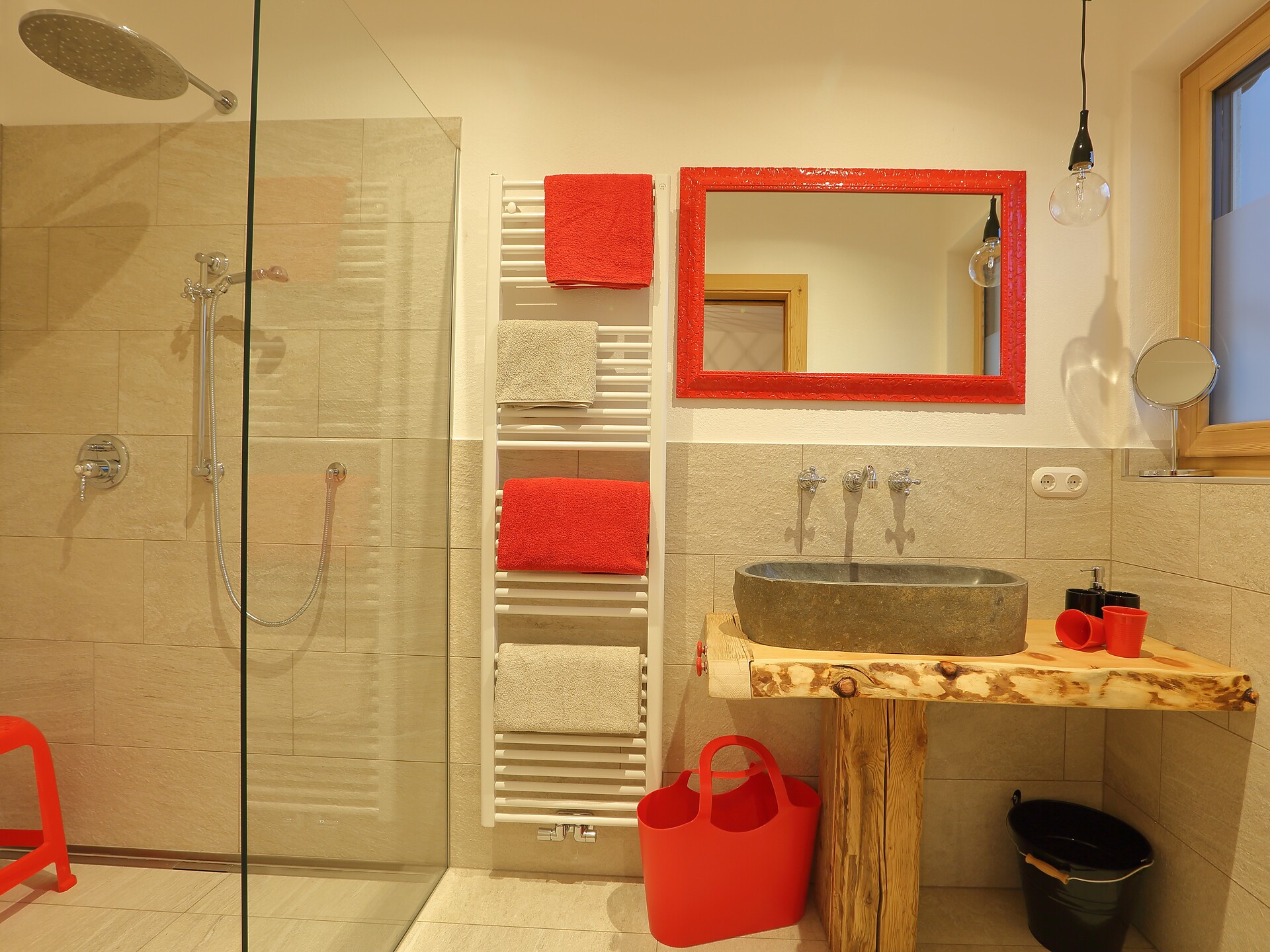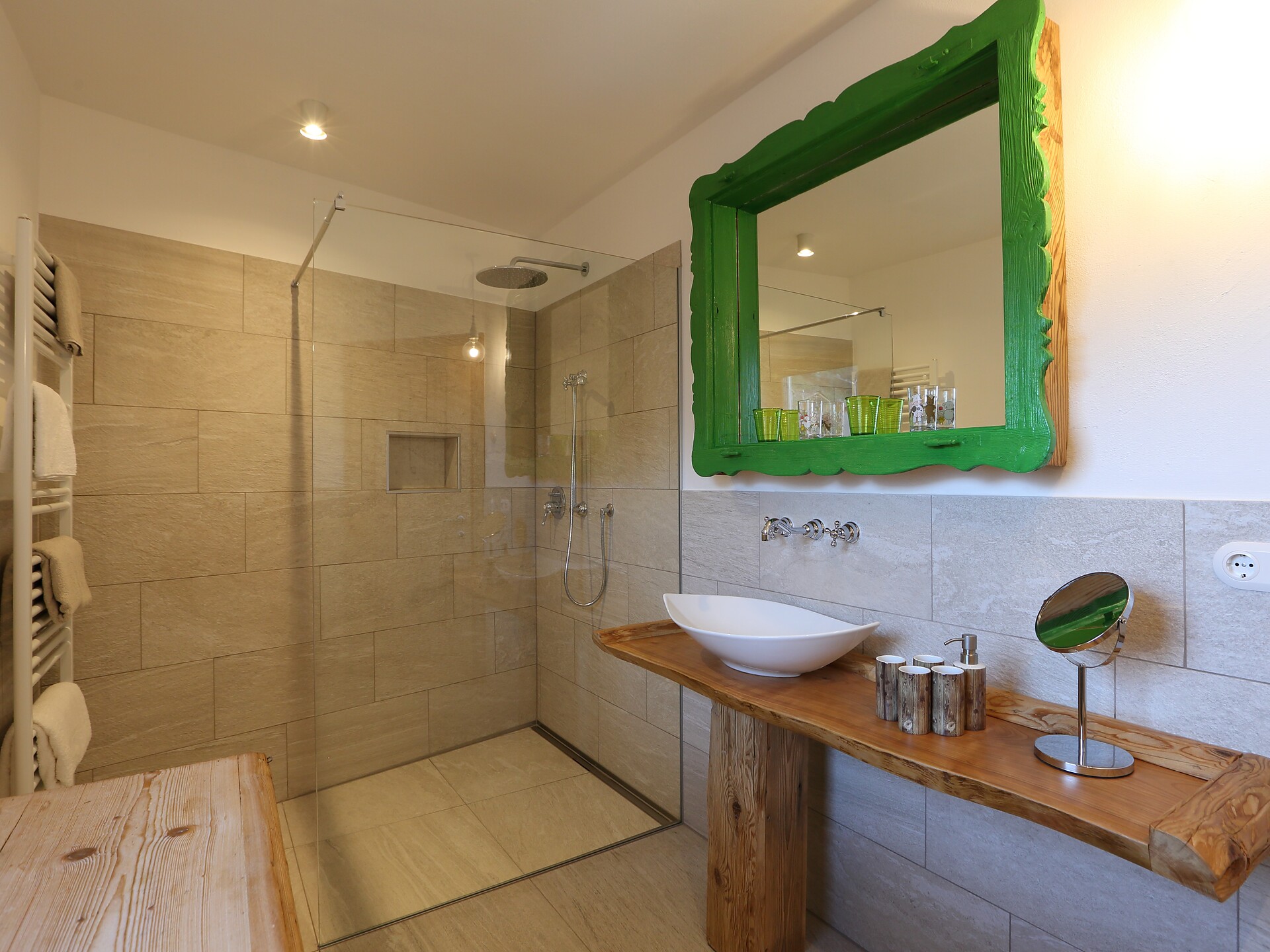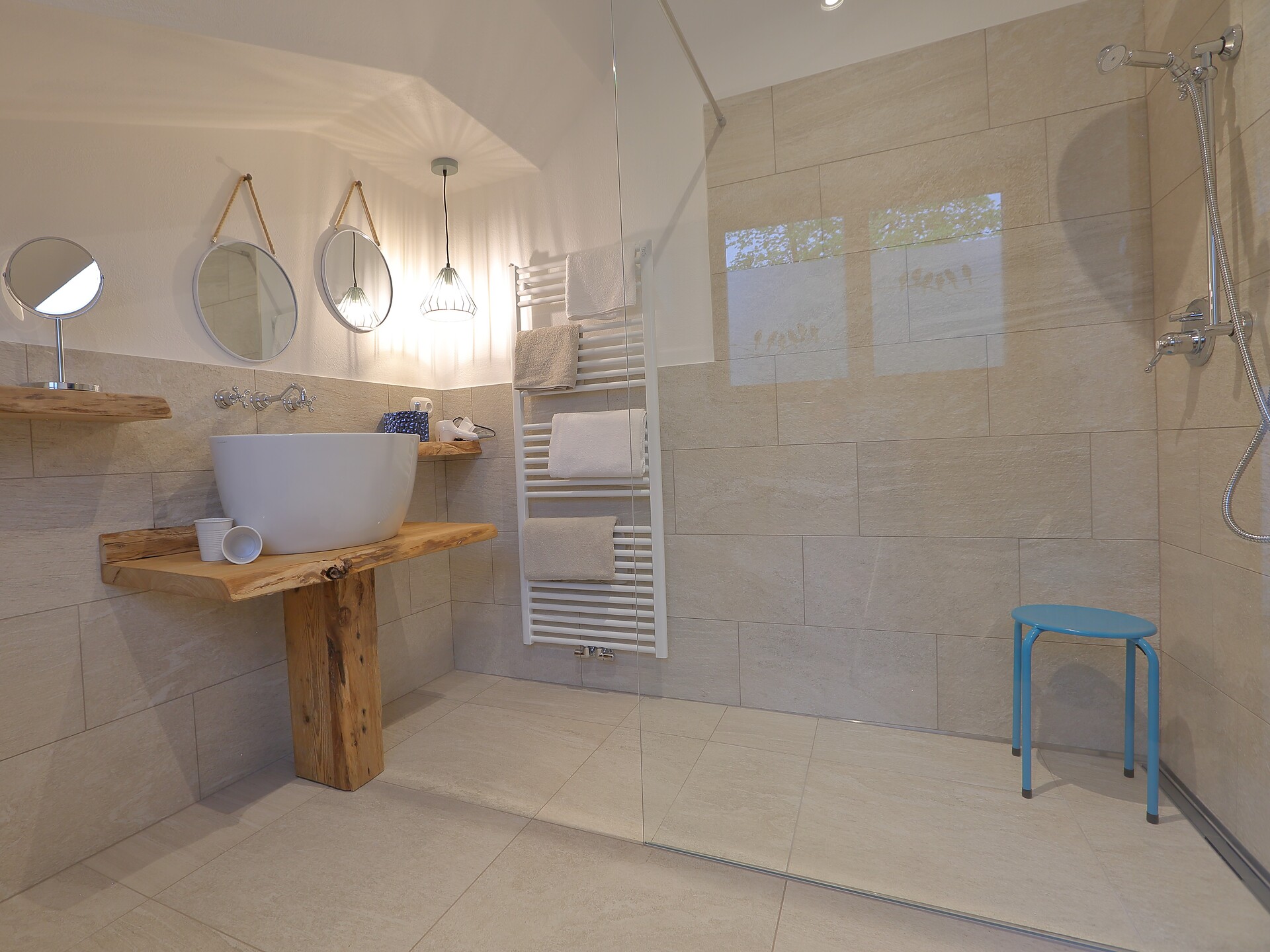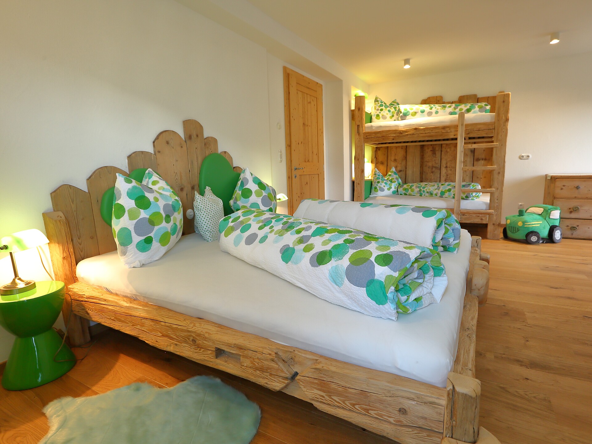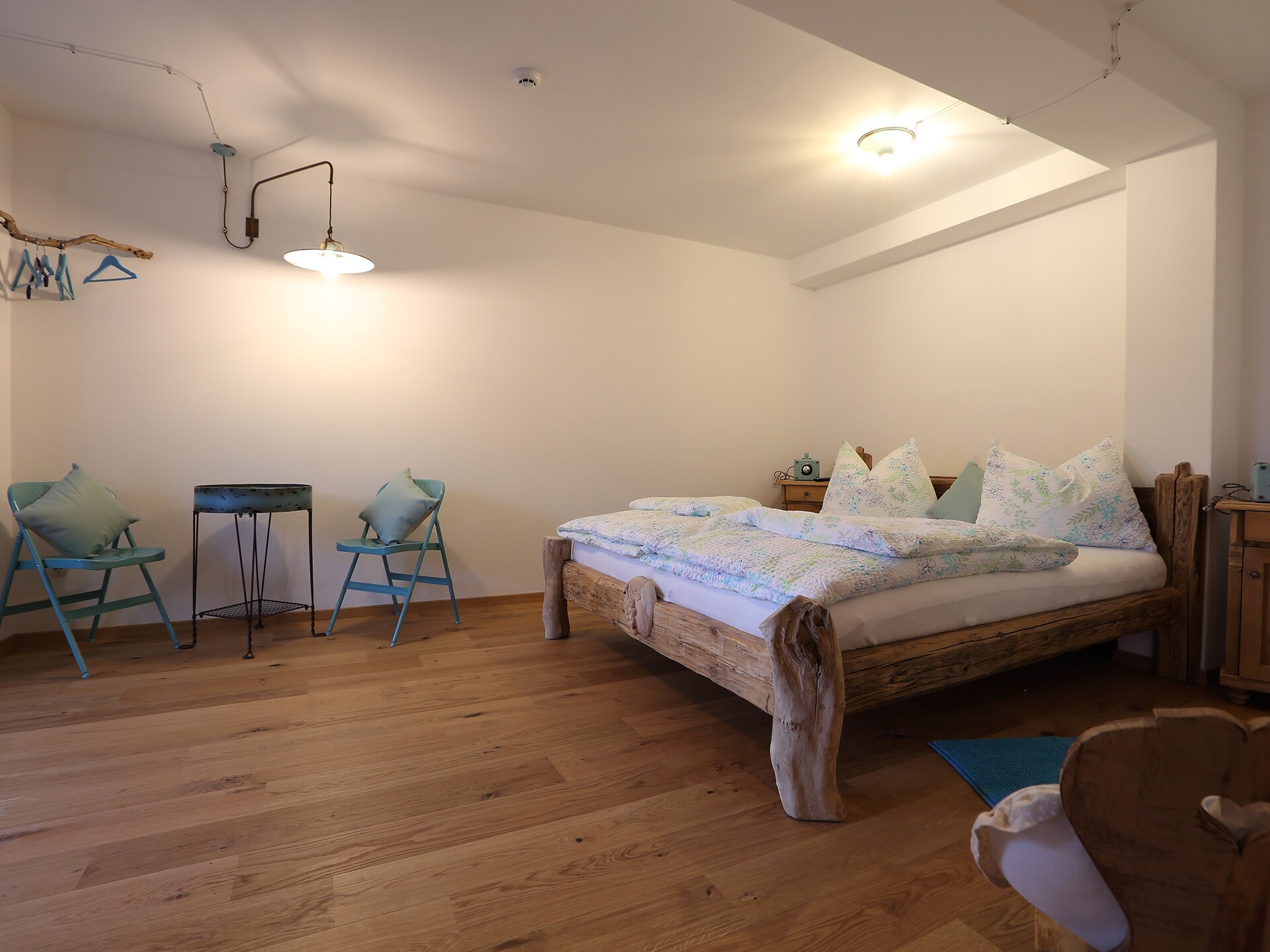 Schöne, neue Doppelzimmer mit Stockbett, Balkon und eigenem Kühlschrank, begehbarer Dusche, Holzböden, TV und WLAN.