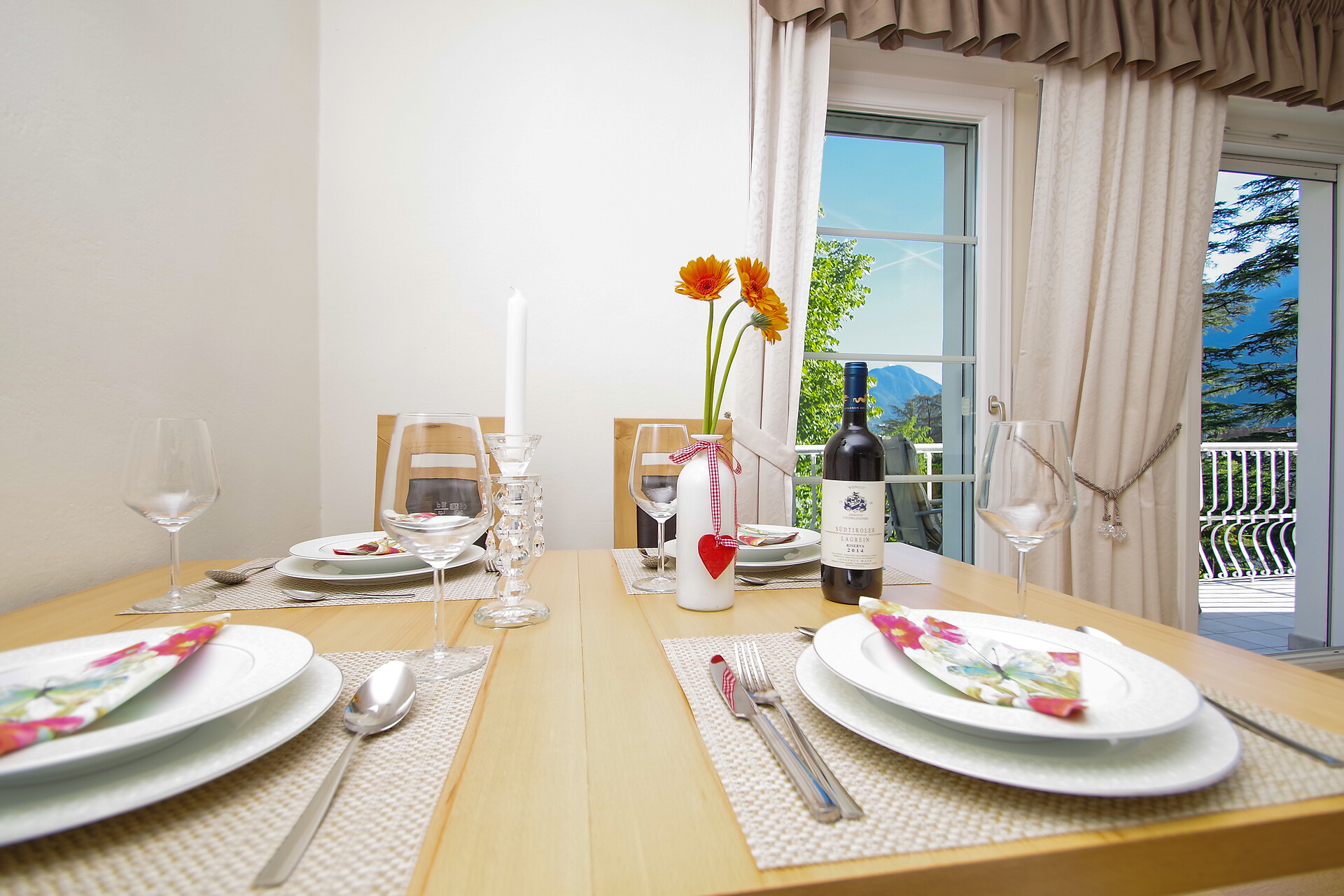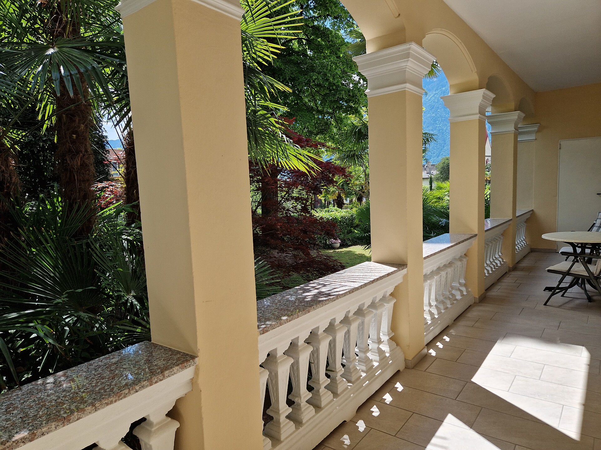 Alle Appartements haben einen sehr sonnigen Südbalkon mit Panoramablick in unserem mediterranen Garten, Parkanlagen und umliegende Berge.