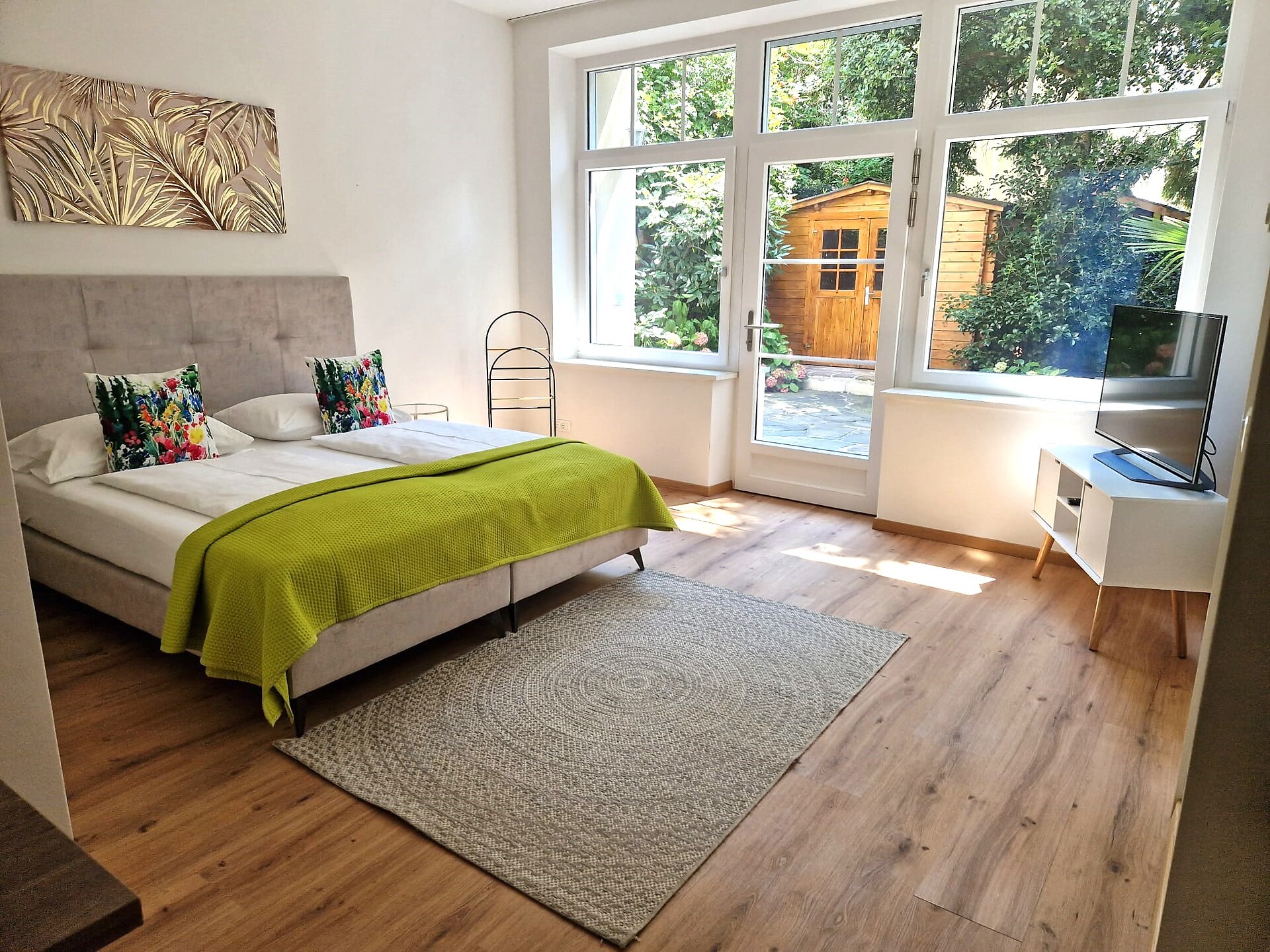 Die neuen, geräumigen und modern eingerichteten Ferienwohnungen bieten Platz für 2 - 5 Personen und alle haben alle einen sonnigen Südbalkon. Die Zweiraumferienwohnungen sind mit einen komfortablen und modernen Wohnschlafraum mit großer Sitzecke, hochwertiger ausziehbarer Doppelschlafcouch, komplett ausgestattete Küchenzeile mit Cerankochfeld, Kühlschrank mit Gefrierfach, Mikrowelle mit Grillfunktion, Geschirrspülmaschine, Kaffeemaschine, Wasserkocher und Geschirrausstattung ausgestattet. Die modernen geräumigen Schlafzimmer sind mit großen Doppelbetten, Schrank und Kommode, Garderobe, Safe, gemütlich eingerichtet.