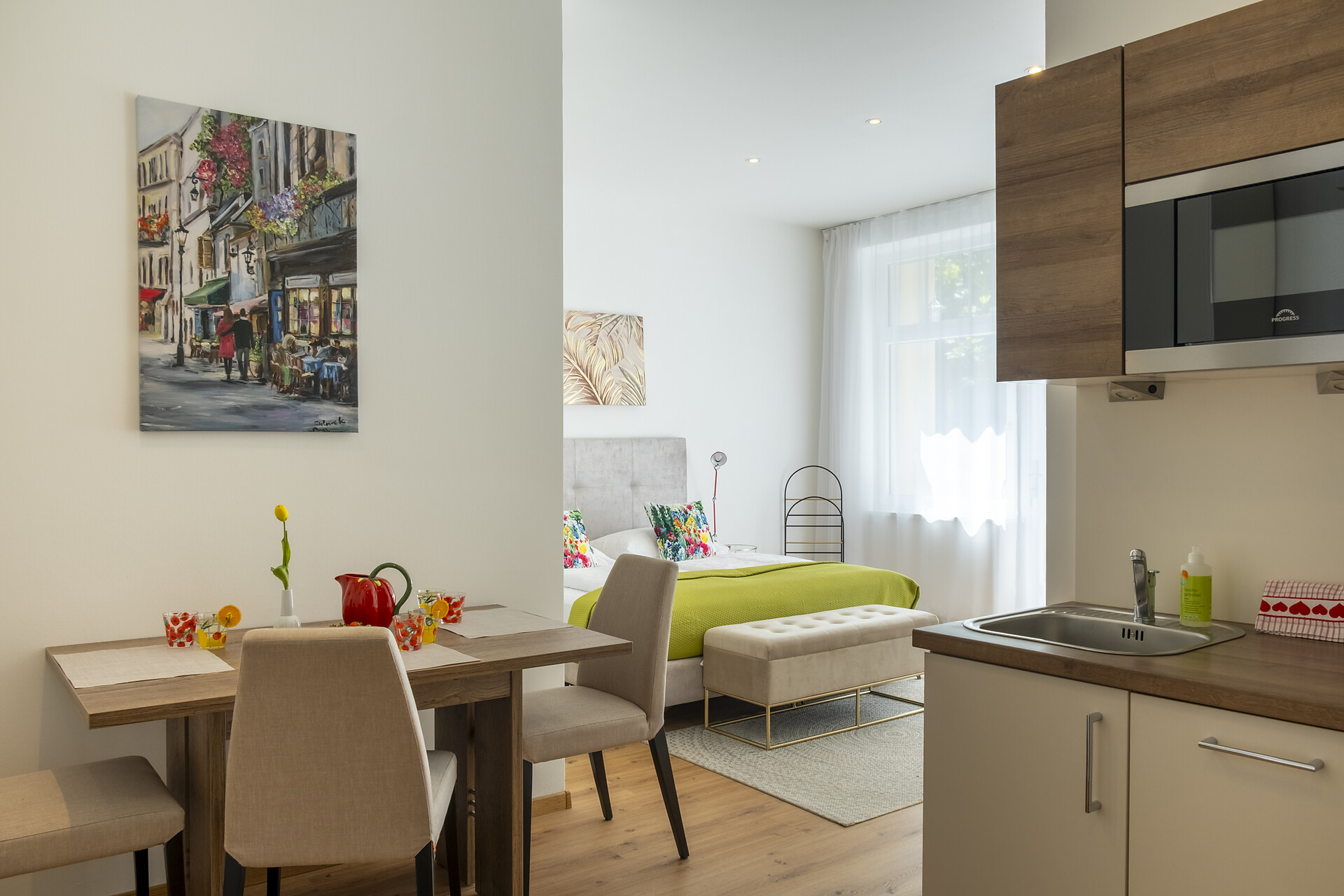 Von unserer Residence gibt es unmittelbar sehr gute Einkaufsmöglichkeiten viele Bäckereien, Konditoreien, Spar, Geschäfte sowie Cafés und Restaurants. Außerdem finden Sie gute Busverbindungen in alle Richtungen.