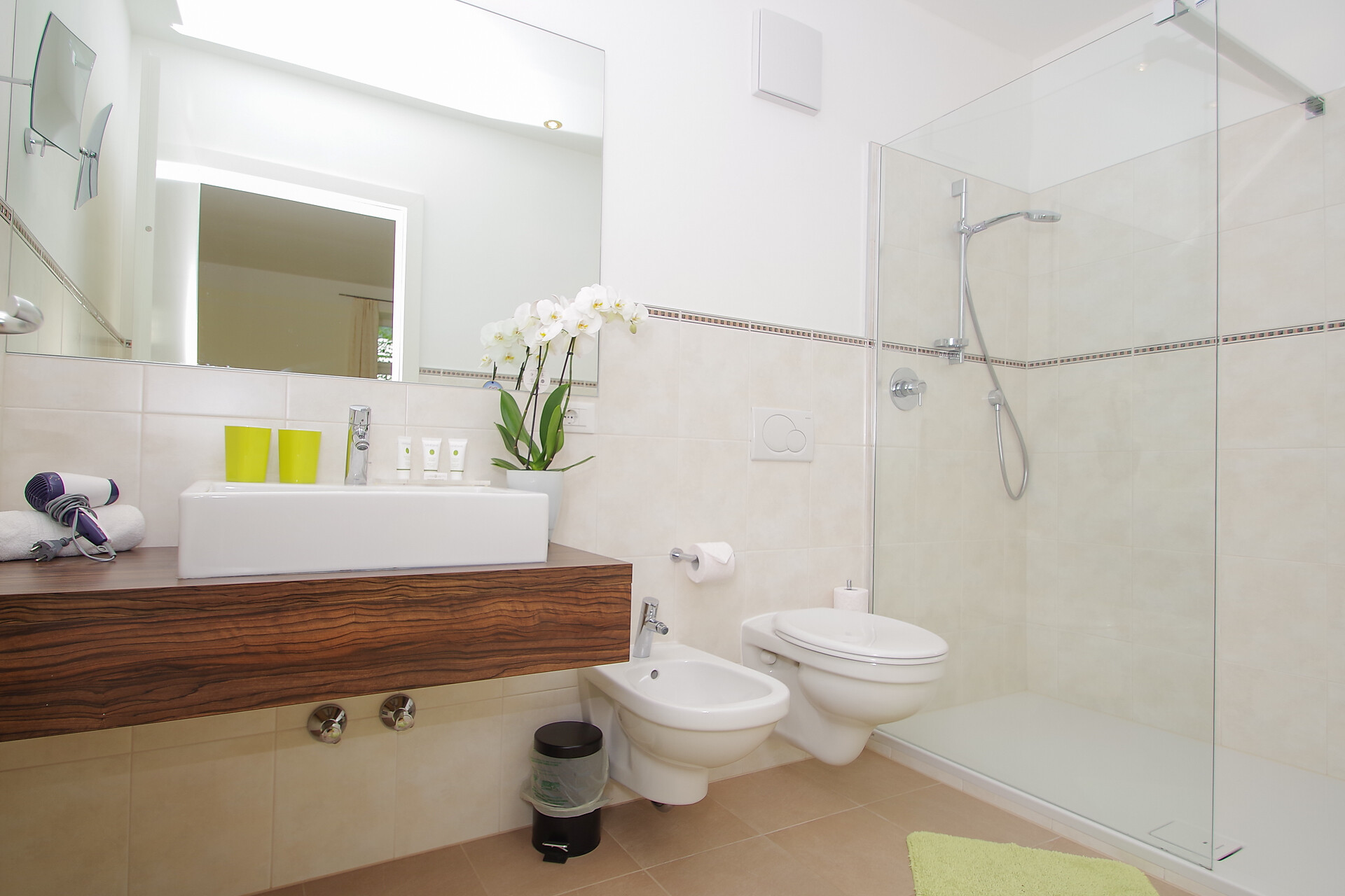 Die luxuriösen Badezimmern verfügen über extra große Duschen, Wc, Bidet und Haarfön und moderne Waschbecken mit viel Ablage. Die komplette Bettwasche Hand- und Badetücher sind inklusive.