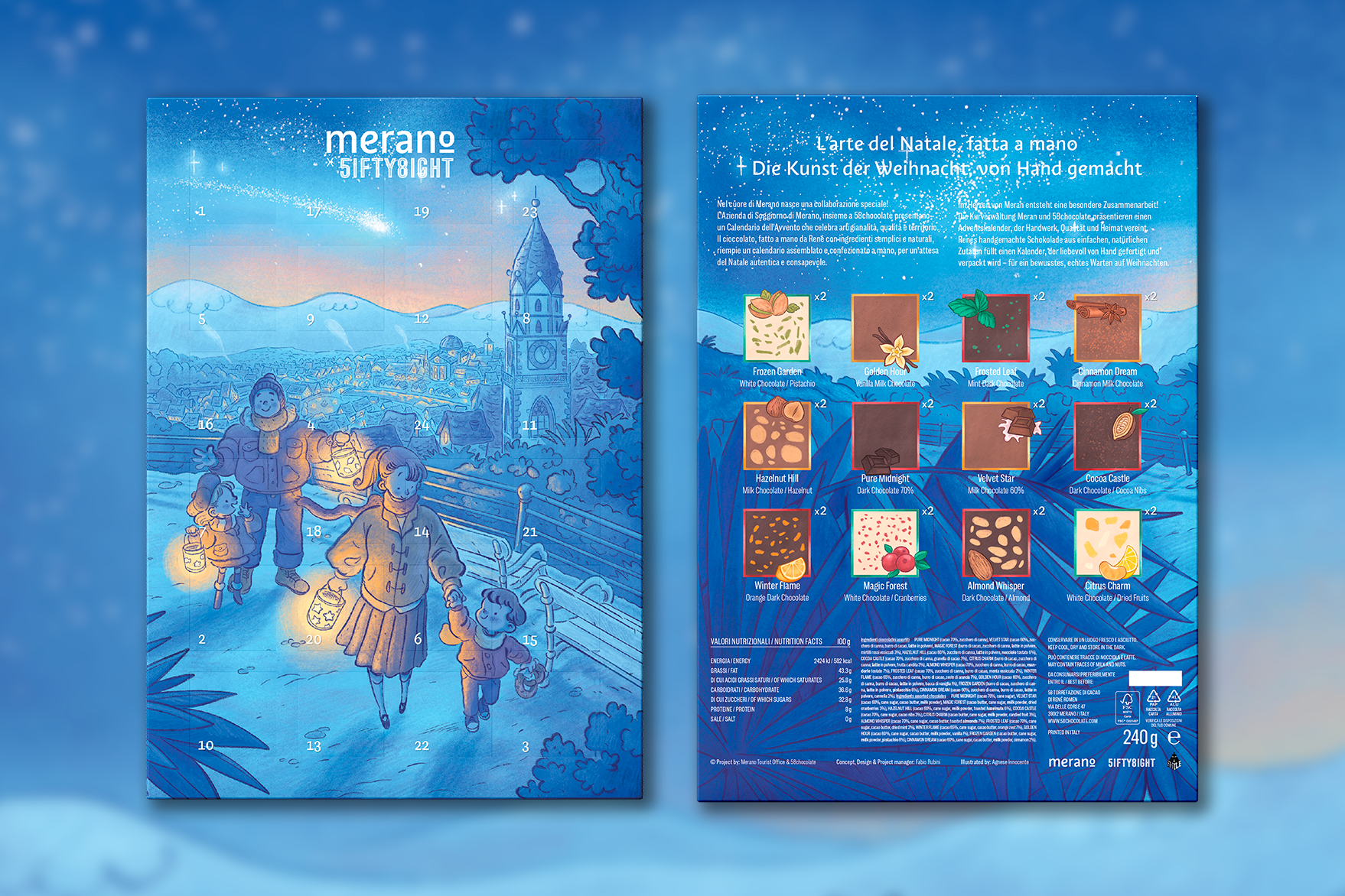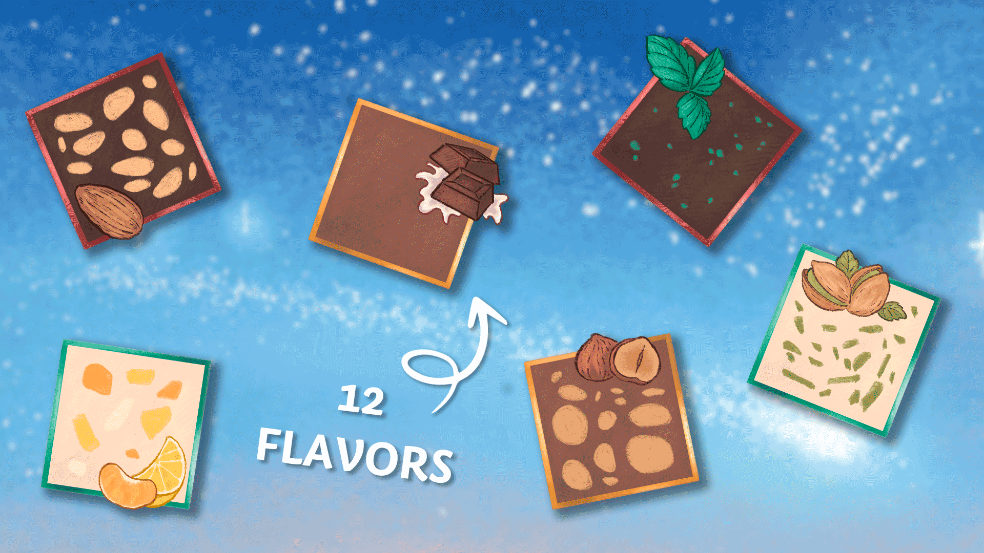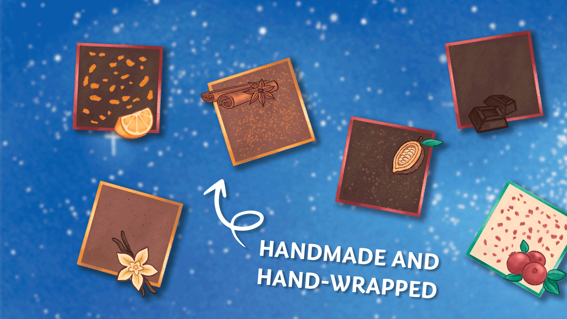 WINTER FLAME (65% Kakao, Rohrzucker, Kakaobutter, Orangenzesten 7%), GOLDEN HOUR (60% Kakao, Rohrzucker, Kakaobutter, Milchpulver, Vanilleschote 1%),