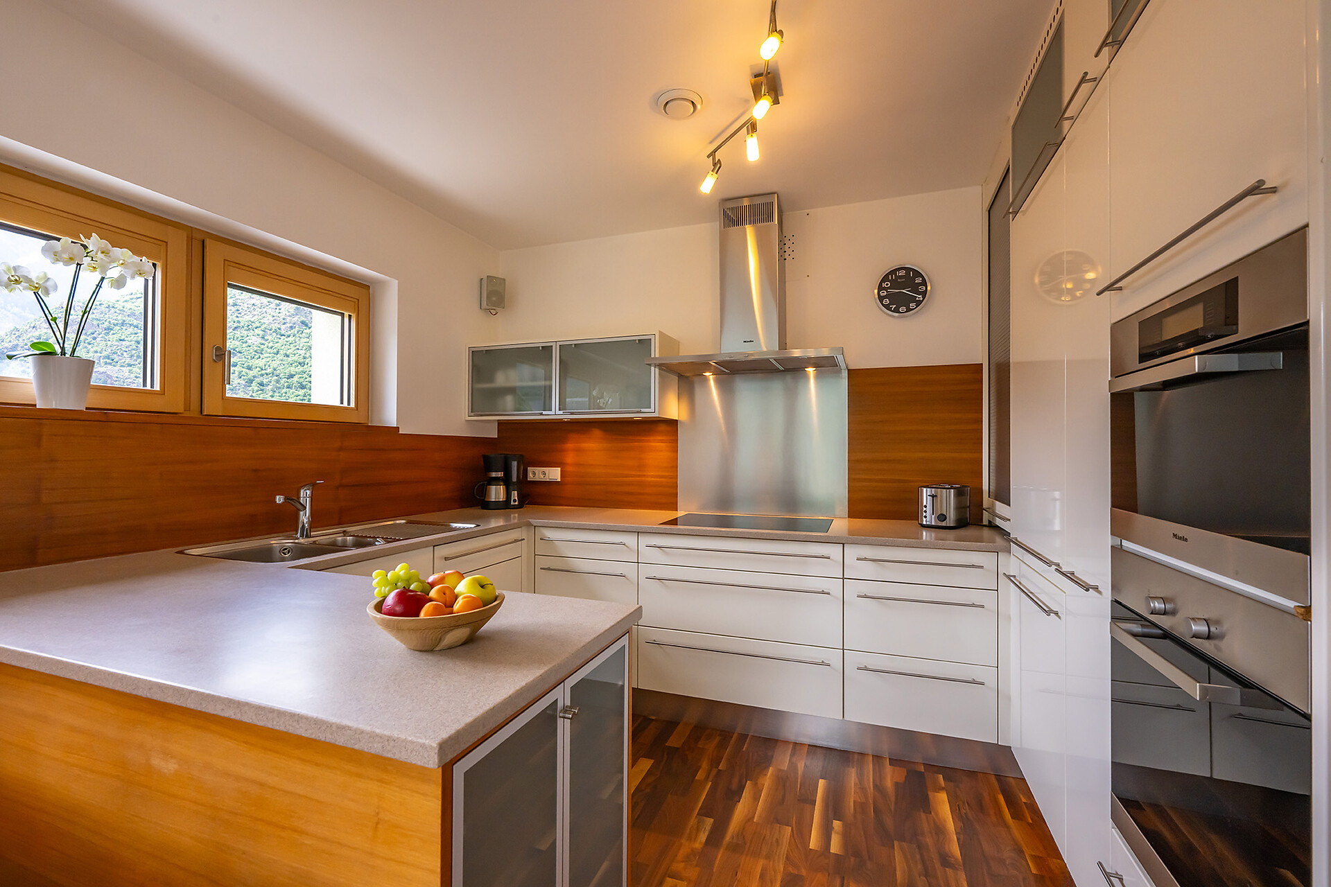 Die großzügige Wohnung im Obergeschoss besteht aus 2 Schlafzimmern, einer großen modernen Küche, einem Wohnzimmer, einem Badezimmer mit Bidet, Dusche und Badewanne, einem Wc mit Pissoir und zwei sonnigen Balkone mit uneingeschränktem Bergblick.