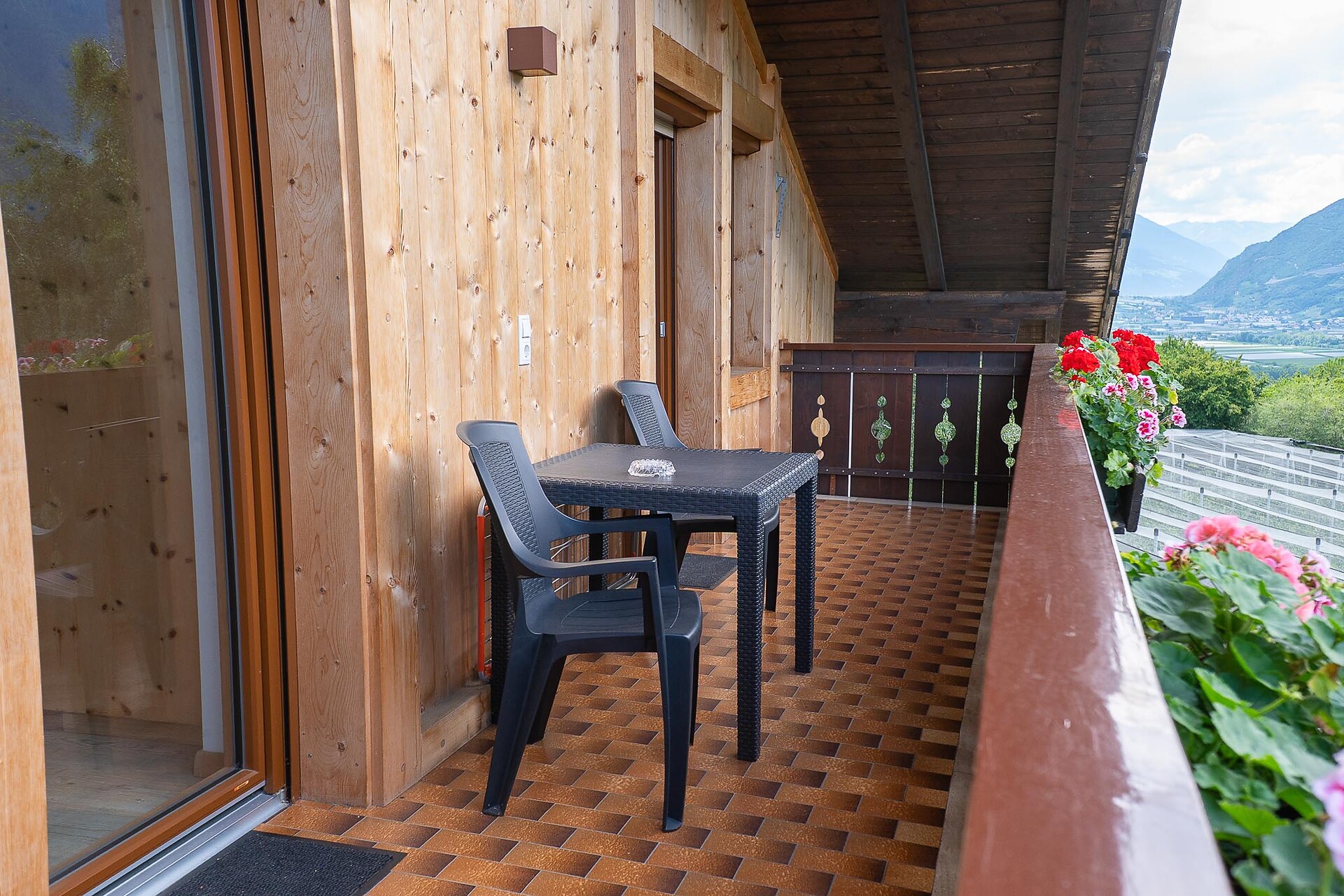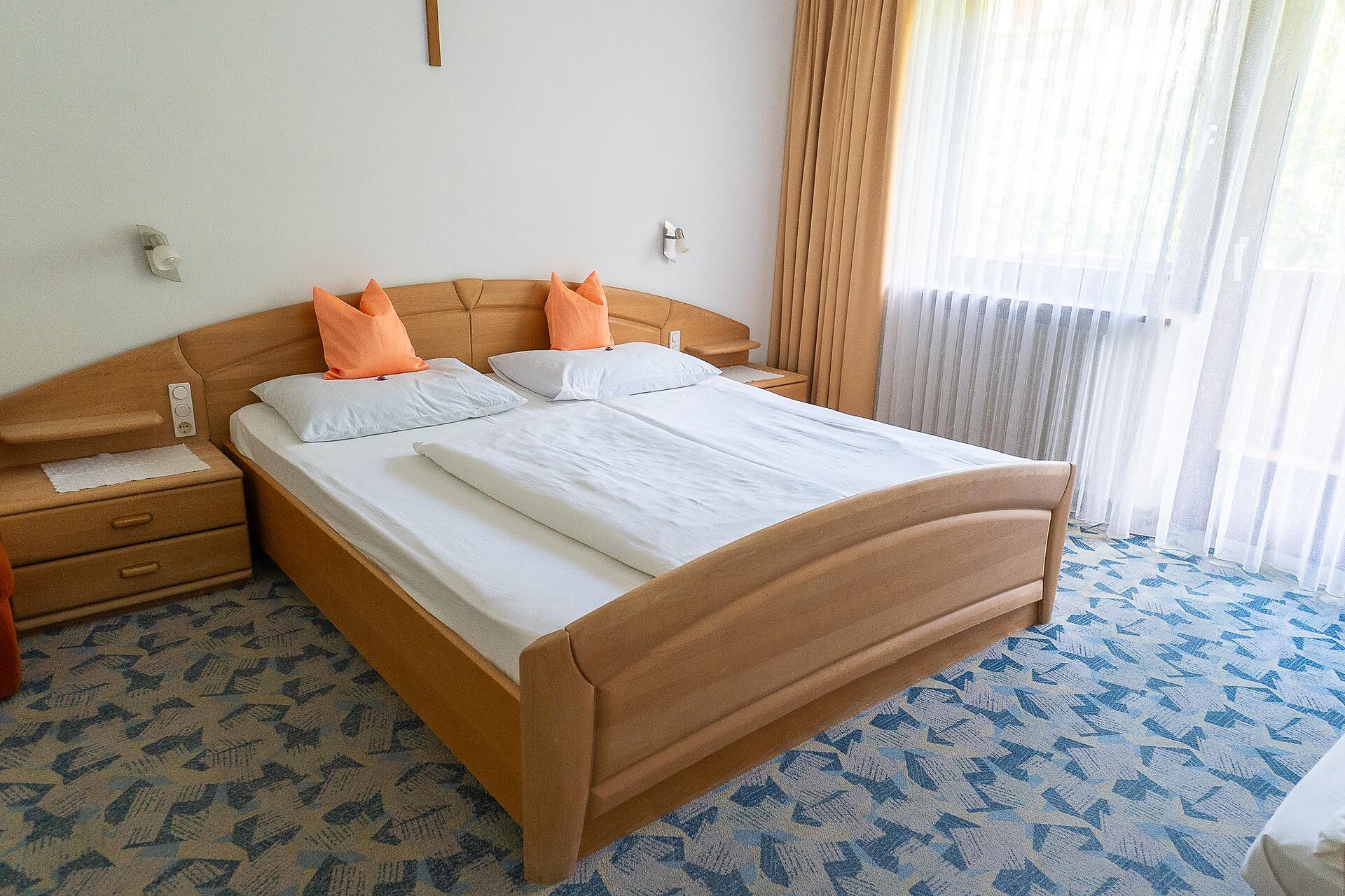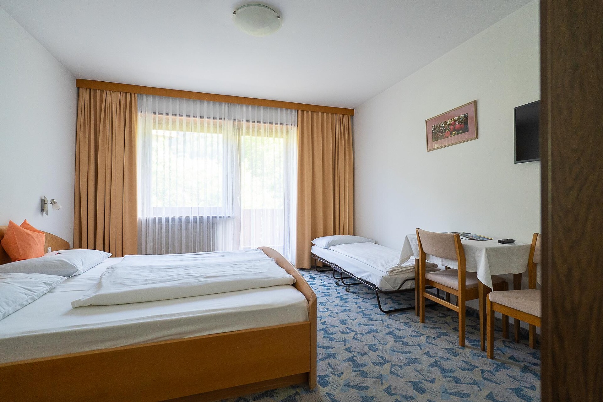 Doppelzimmer, Doppelbett, Zustellbett, Balkon, Terrasse, Safe, Dusche / Bad, Haarfön, Fernseher auf Anfrage, WLAN, Haupthaus, Südseite
