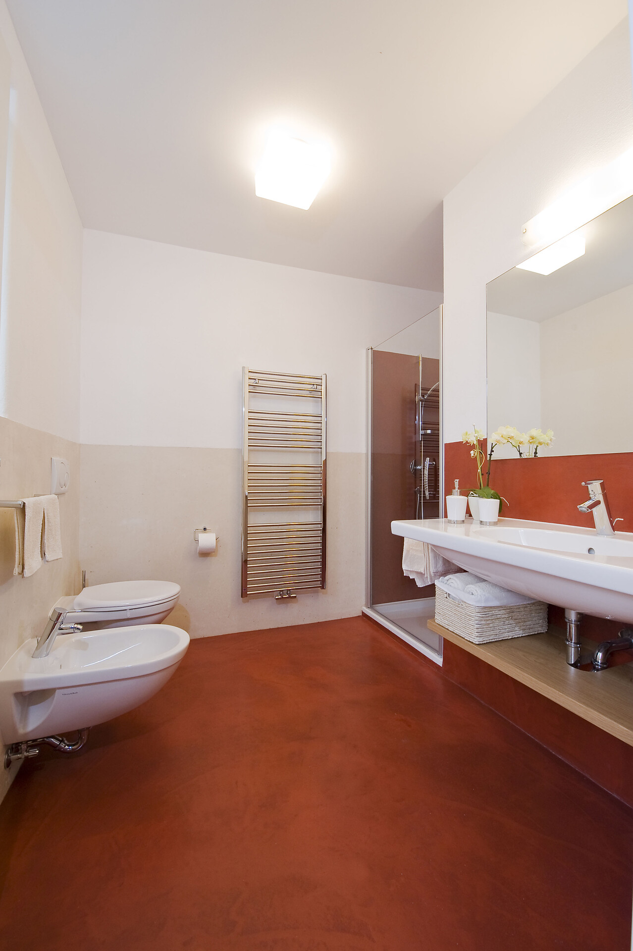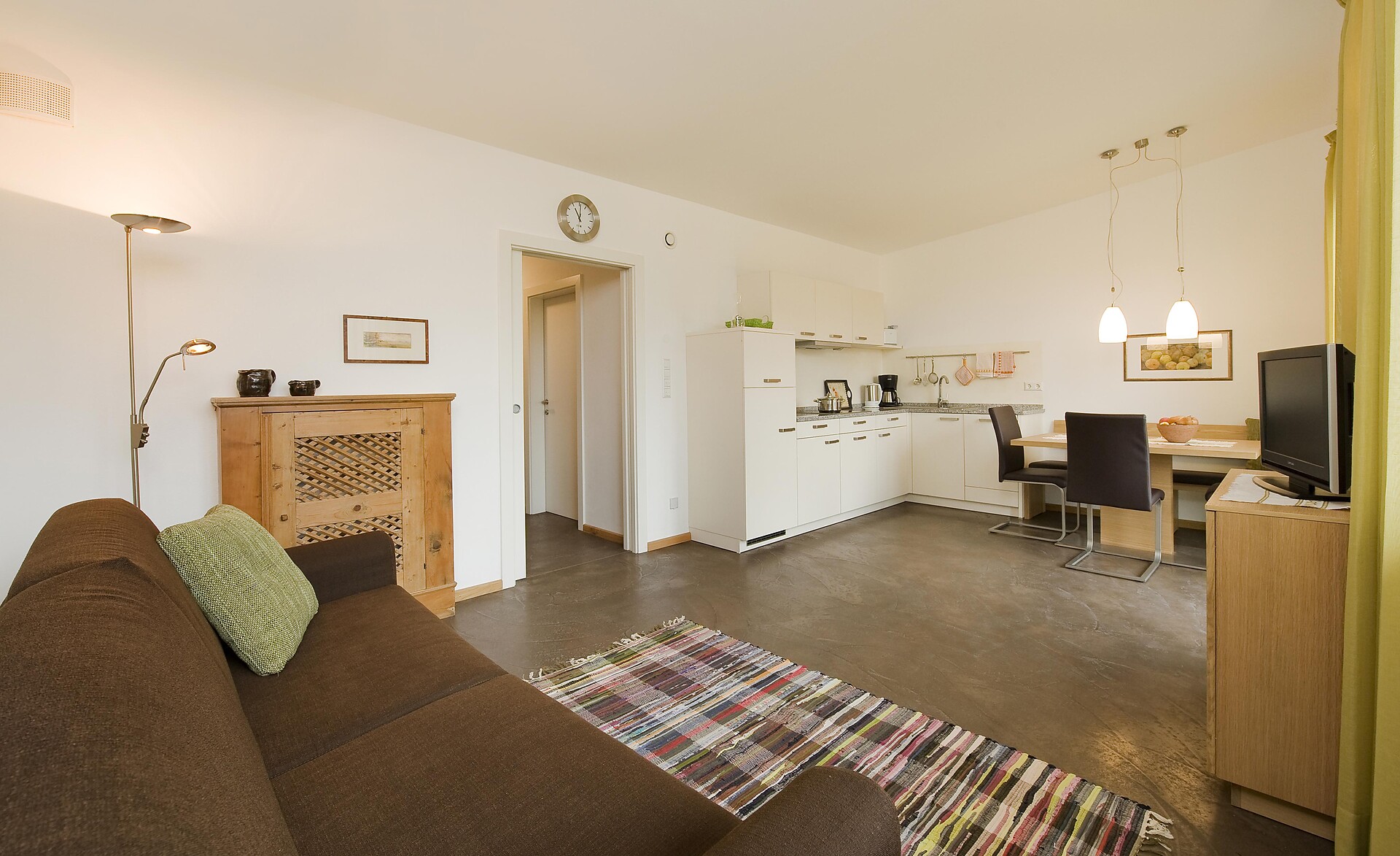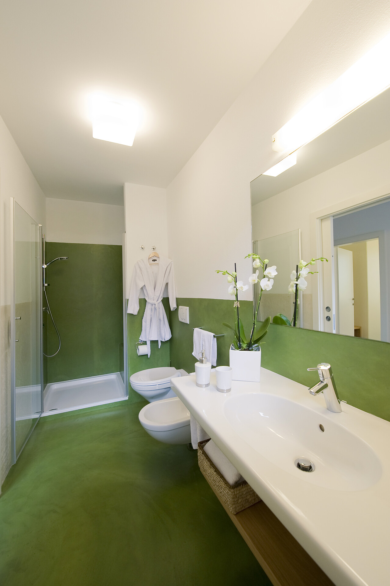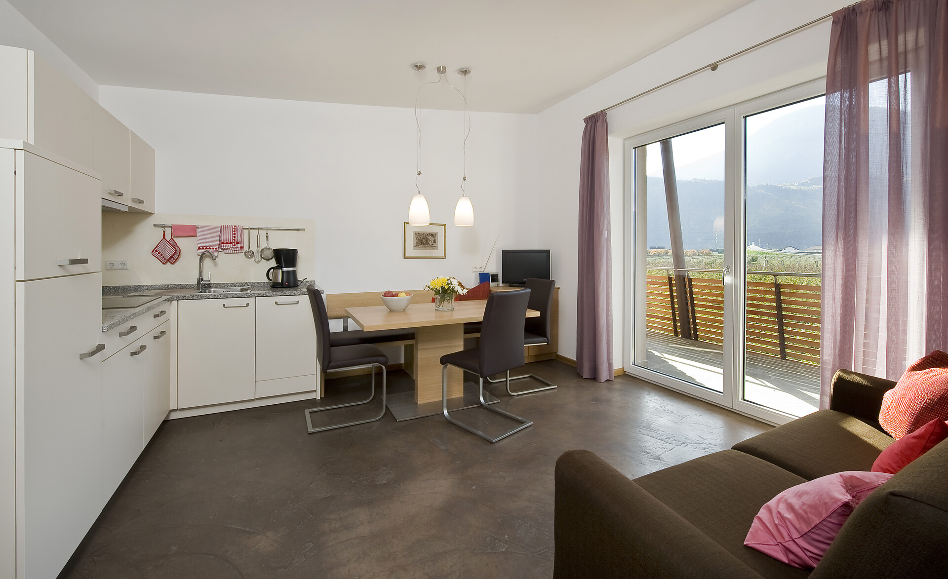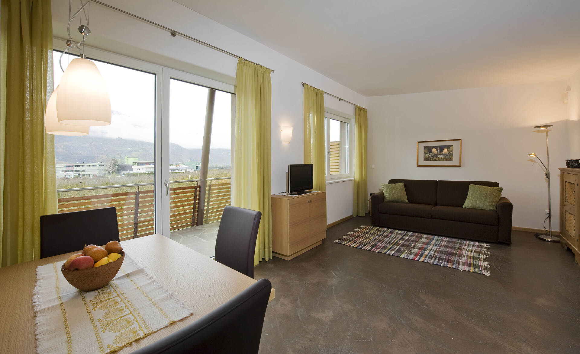 Unsere Wohnung GRÜN verfügt über eine großzügige Wohnküche mit ausziehbarer Couch (210 cm breit), ein komfortables Doppelzimmer mit Blick auf das Etschtal und die umliegenden Berge, ein Badezimmer mit Dusche und WC sowie einem großen sonnigen Balkon (14 m²). Die baubiologischen Oberflächen bieten höchste Wohnqualität und die mit viel Liebe zum Detail ausgestattete Wohnung höchsten Wohnkomfort: hochwertige Matratzen, Spülmaschine, Kaffeemaschine, Toaster, Wasserkocher, Stabmixer, Föhn, TV mit SAT Anschluss, Radio mit CD-Player, W-LAN Verbindung, Soda Stream. Die Wohnung liegt im 1. Stock und ist eine Nichtraucherwohnung. Inbegriffen im Preis sind die Heizung im Winter, im Sommer die klimatisierten Fußböden, Strom, Internet, Granderwasser (www.grander.com), Bettwäsche, Geschirr- und Handtücher sowie die Endreinigung. Für Autos steht ein überdachter Parkplatz zur Verfügung. Die Liegewiese bietet einen optimalen Ort zum Entspannen, dazu stehen Liegestühle und Sonnenschirme zu Verfügung. Es gibt die Möglichkeit sich die Zeit mit Tischfußball, Tischtennis od