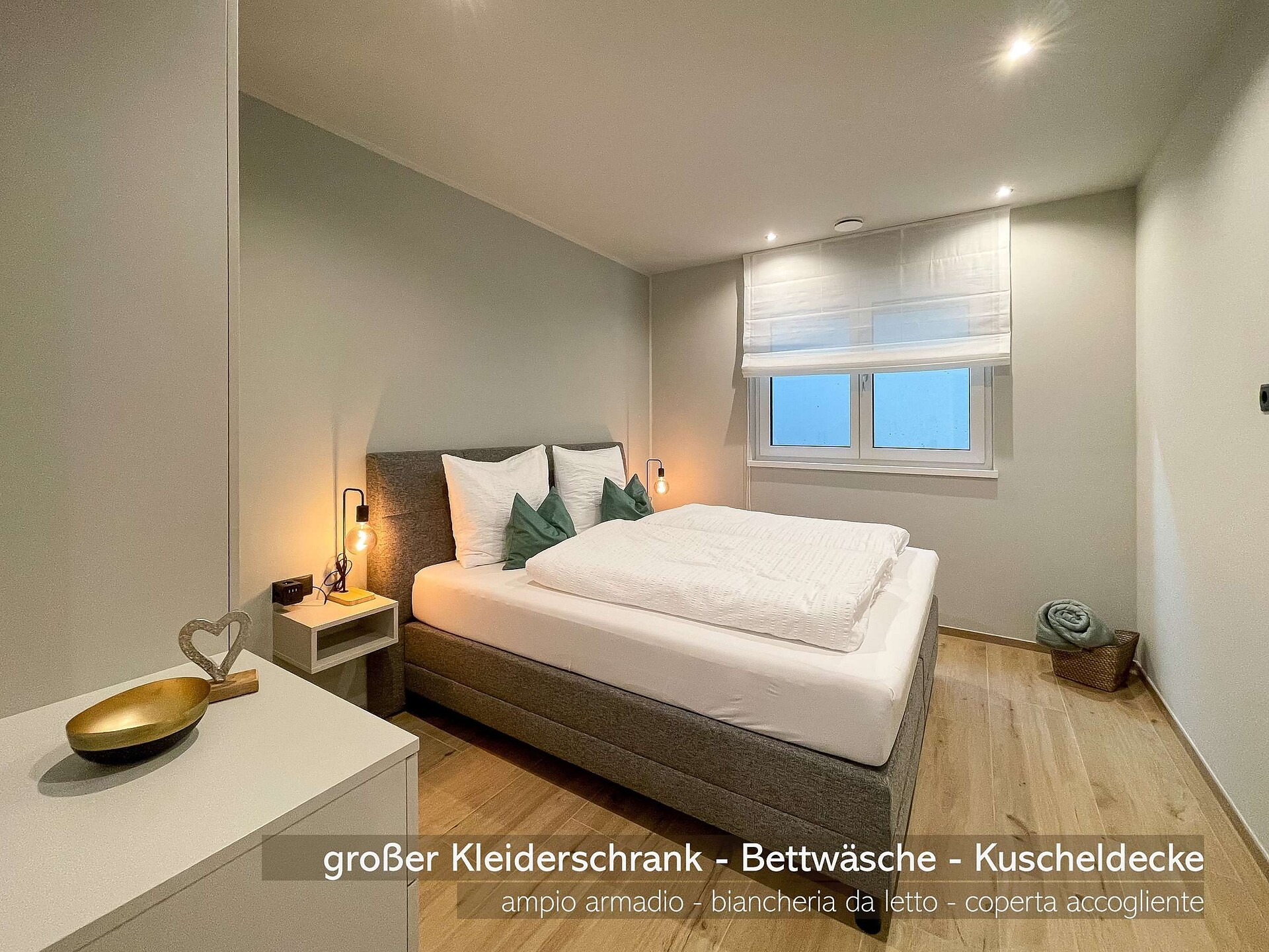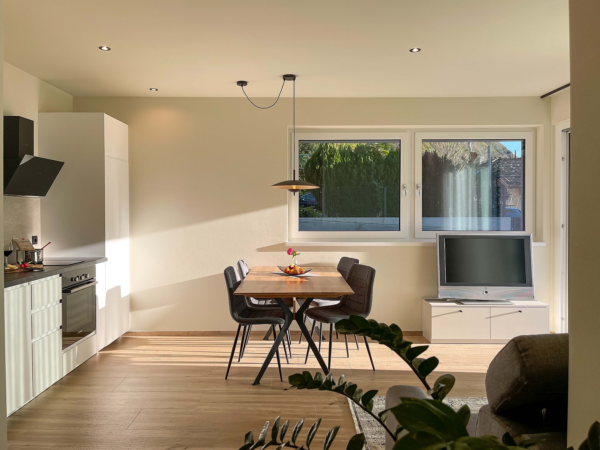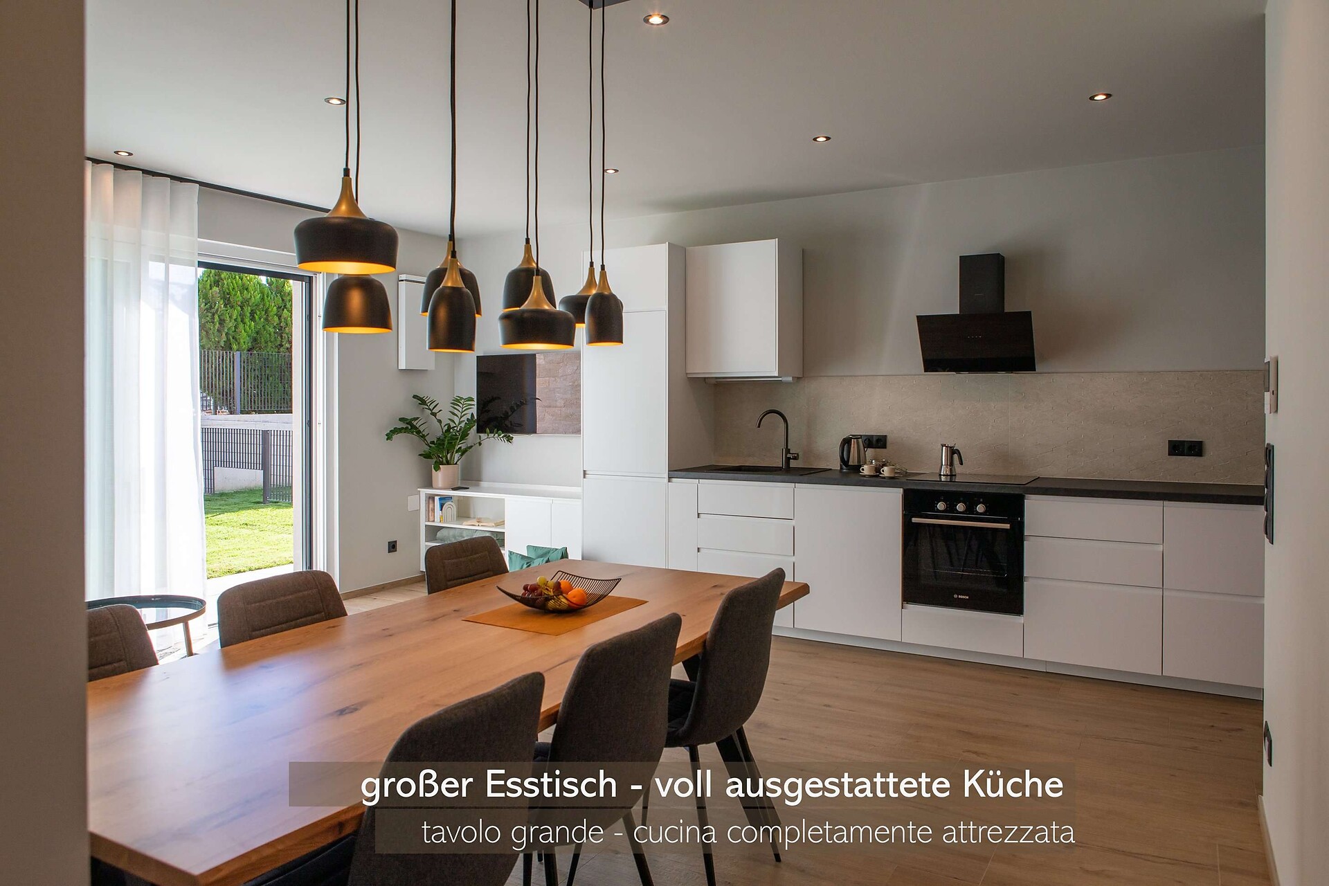 Die Küche ist neben der Grundausstattung (Induktionsherd, Ofen, Kühlschrank mit Gefrierfach, Geschirrspüler, Töpfe, Besteck, Teller und Gläser) mit vielen weiteren Annehmlichkeiten (Wasserkocher, Schneidebrettern, Kaffeemaschinen, Toaster, Eierkocher, Salz und Pfeffer…) ausgestattet. Es gibt einen großen Esstisch, ein bequemes Sofa, welches man auch ausziehen kann, einen Satelliten Flachbild-TV, Bücher sowie Spiele für Groß und Klein. Im Bad sind eine Dusche, Waschmaschine, Handtücher, Handseife, Toilettenpapier sowie Fön vorhanden. Diese Ferienwohnung bietet als besonders Highlight einen zusätzlichen Raum für SmartWorking mit Schreibtisch und mehreren Steckdosen und USB-Anschlüssen. Auf der Terrasse mit Garten gibt es eine große Sitzgelegenheit und Liegestühle.