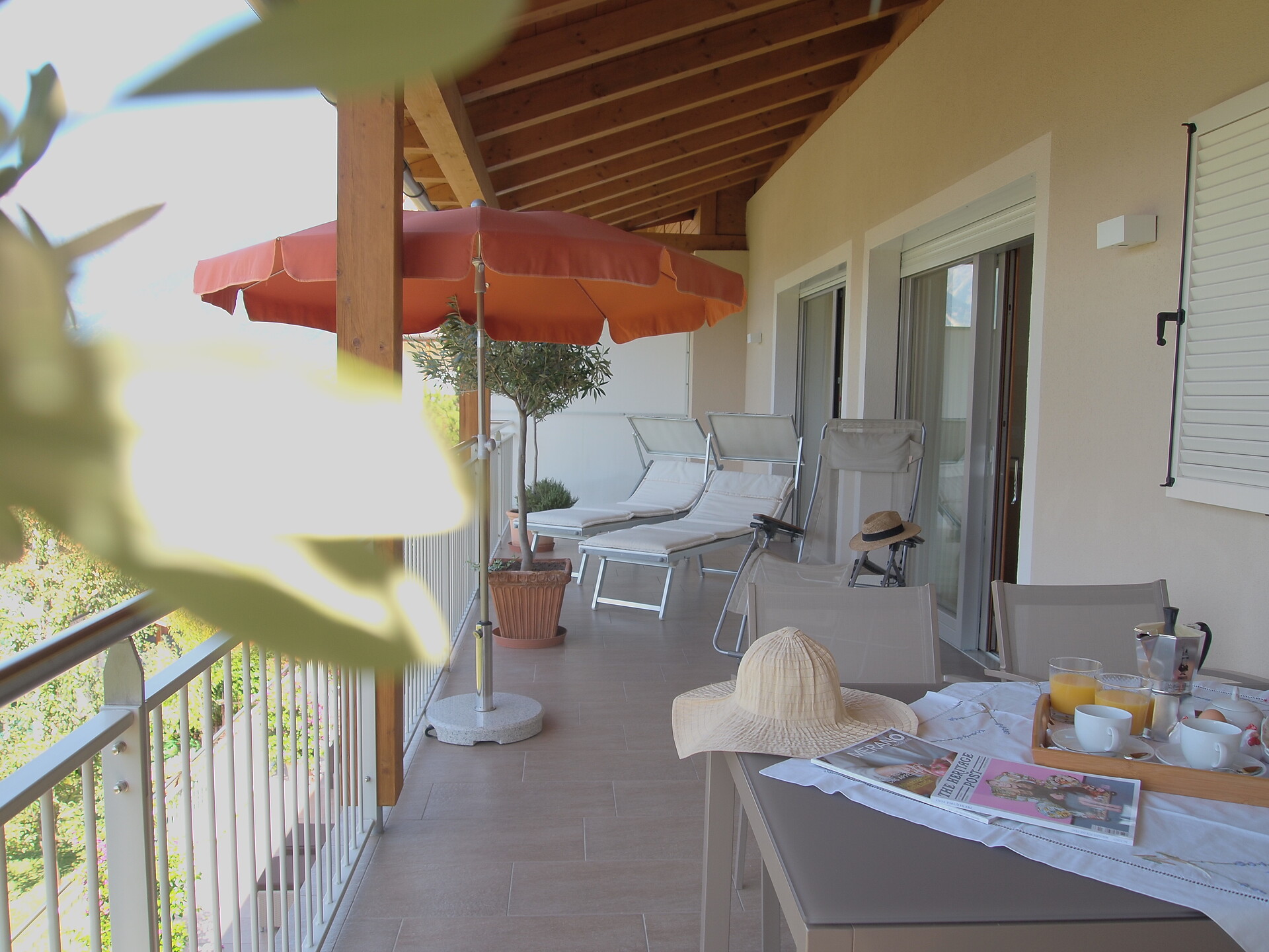 Große Südterrasse mit Gartenmöbeln zum Draußenfrühstücken, Sonnenliegen, zwei Schlafzimmer mit Doppelbett, hochwertiger Bettwäsche, Kleiderschrank