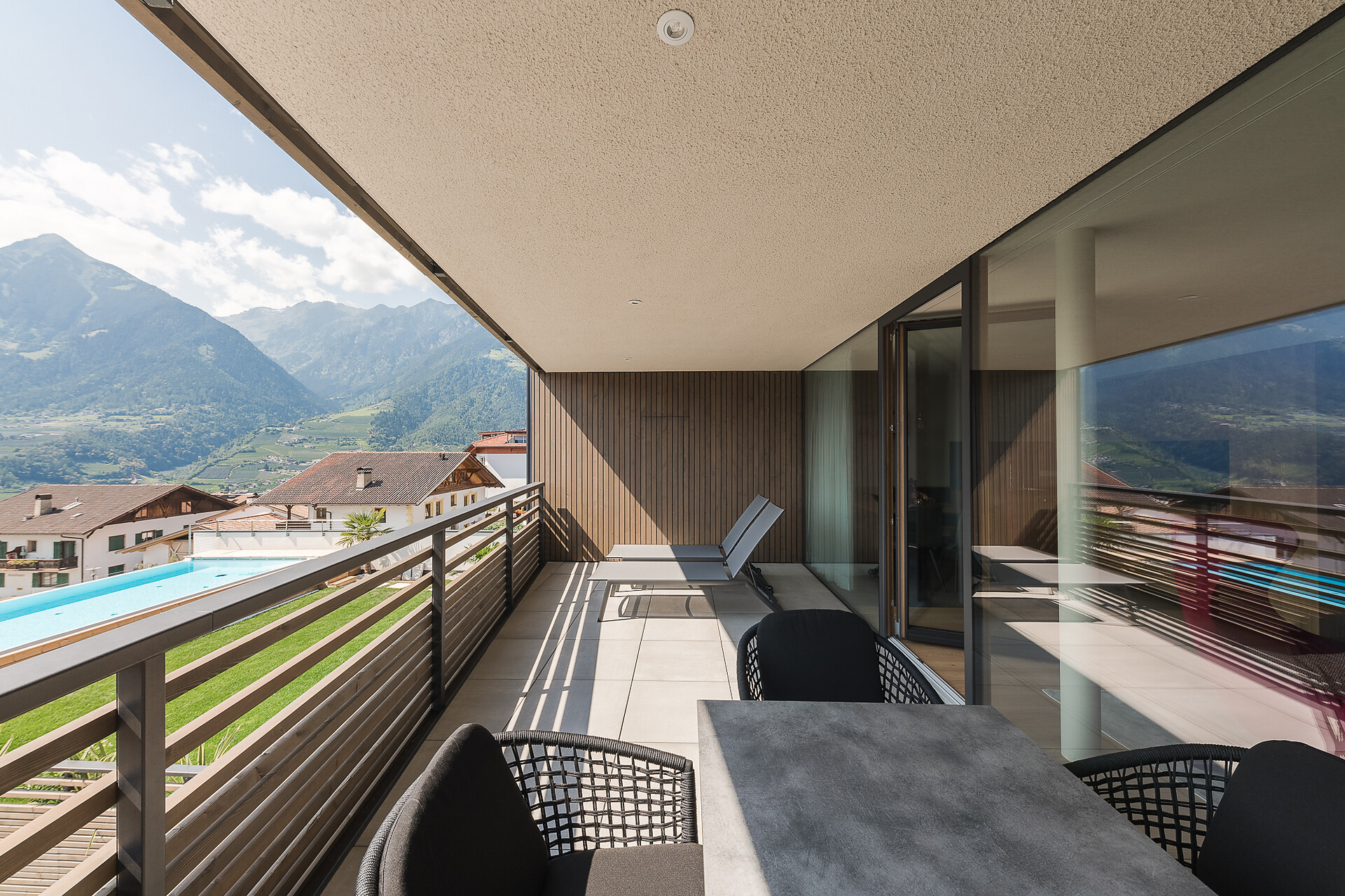 -Großflächige Balkone mit Frühstückstisch, Sonnenschirm und zwei Sonnenliegen.