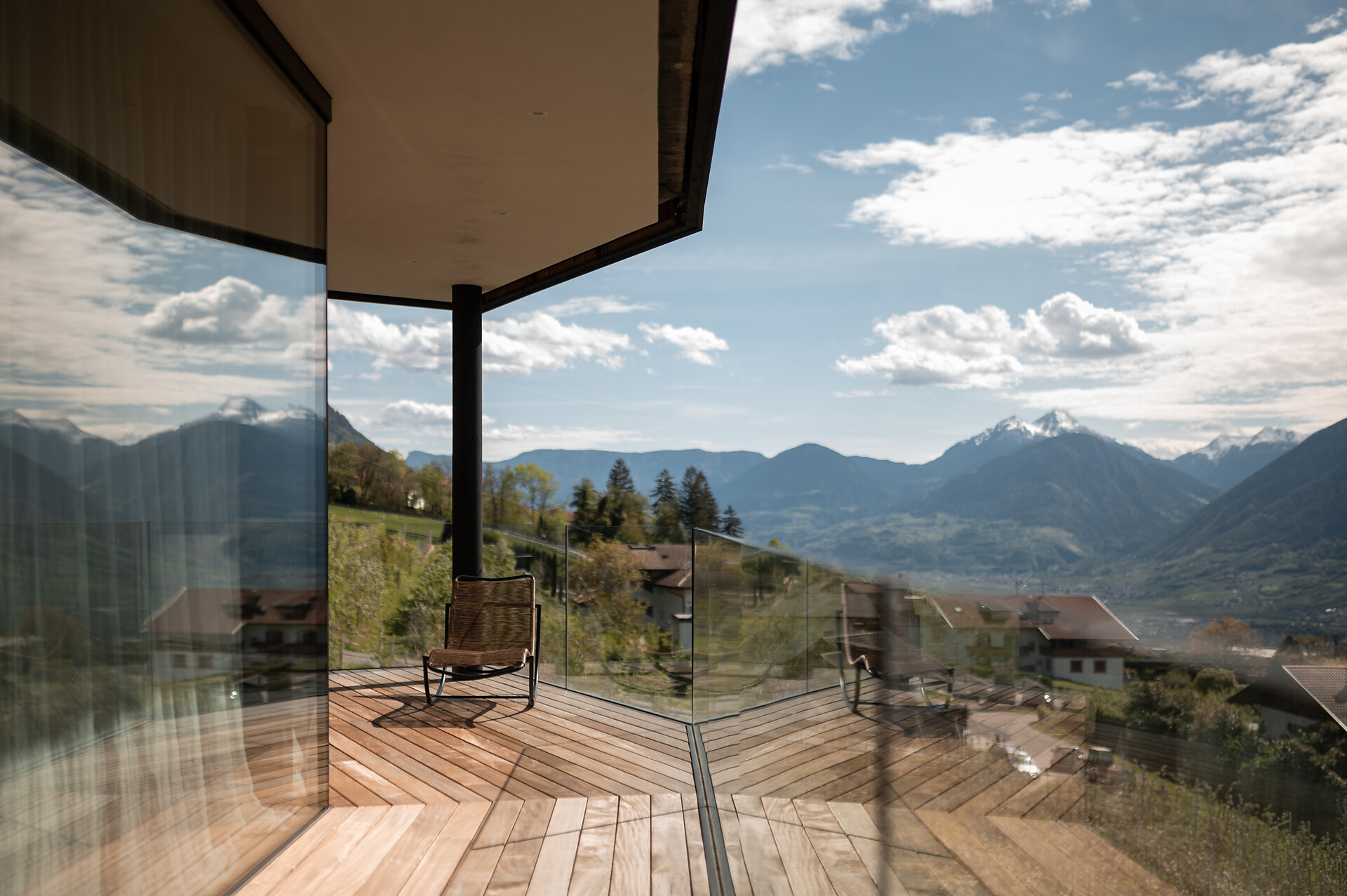 Die View-Houses verzaubern mit Ihrer exklusiven Lage und dem einmaligen Rundumblick auf das umliegende Bergpanorama und den Meraner Talkessel. Die großen Fensterflächen, die eleganten Sonnenterrassen mit Glasbrüstung und das moderne Desgin machen das Chalet Goyen & die Villa Goyen zu einem exklusiven Urlaubsdomizil, das höchste Ansprüche an Behaglichkeit, Komfort und Lage erfüllt.