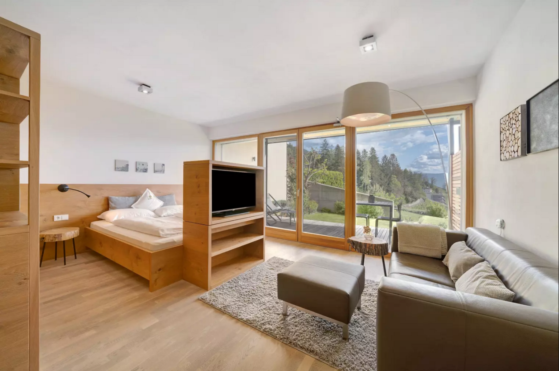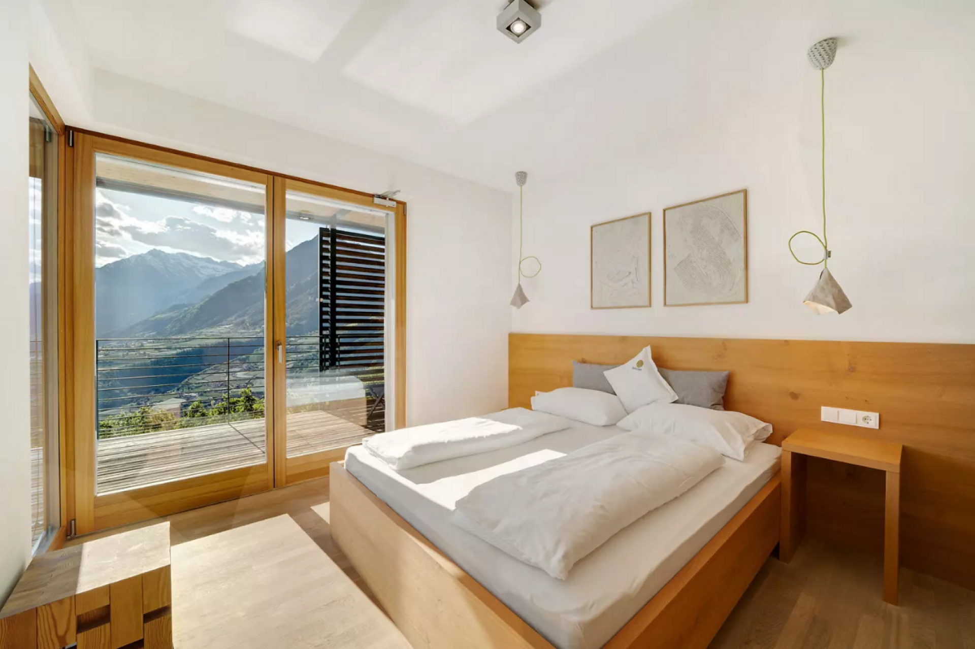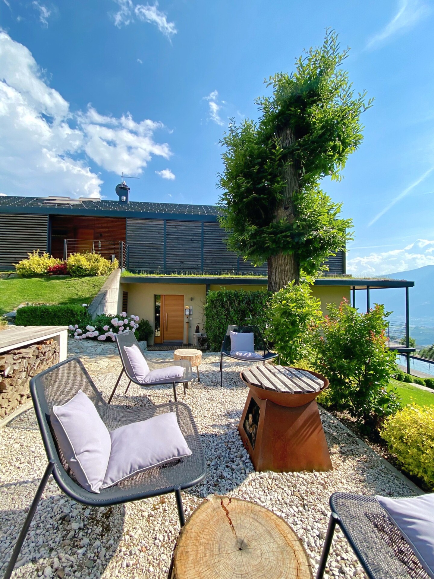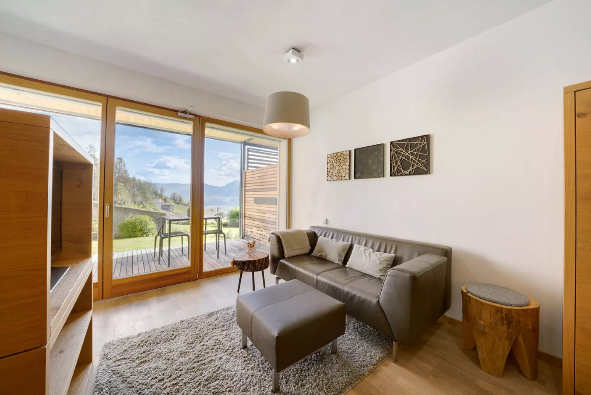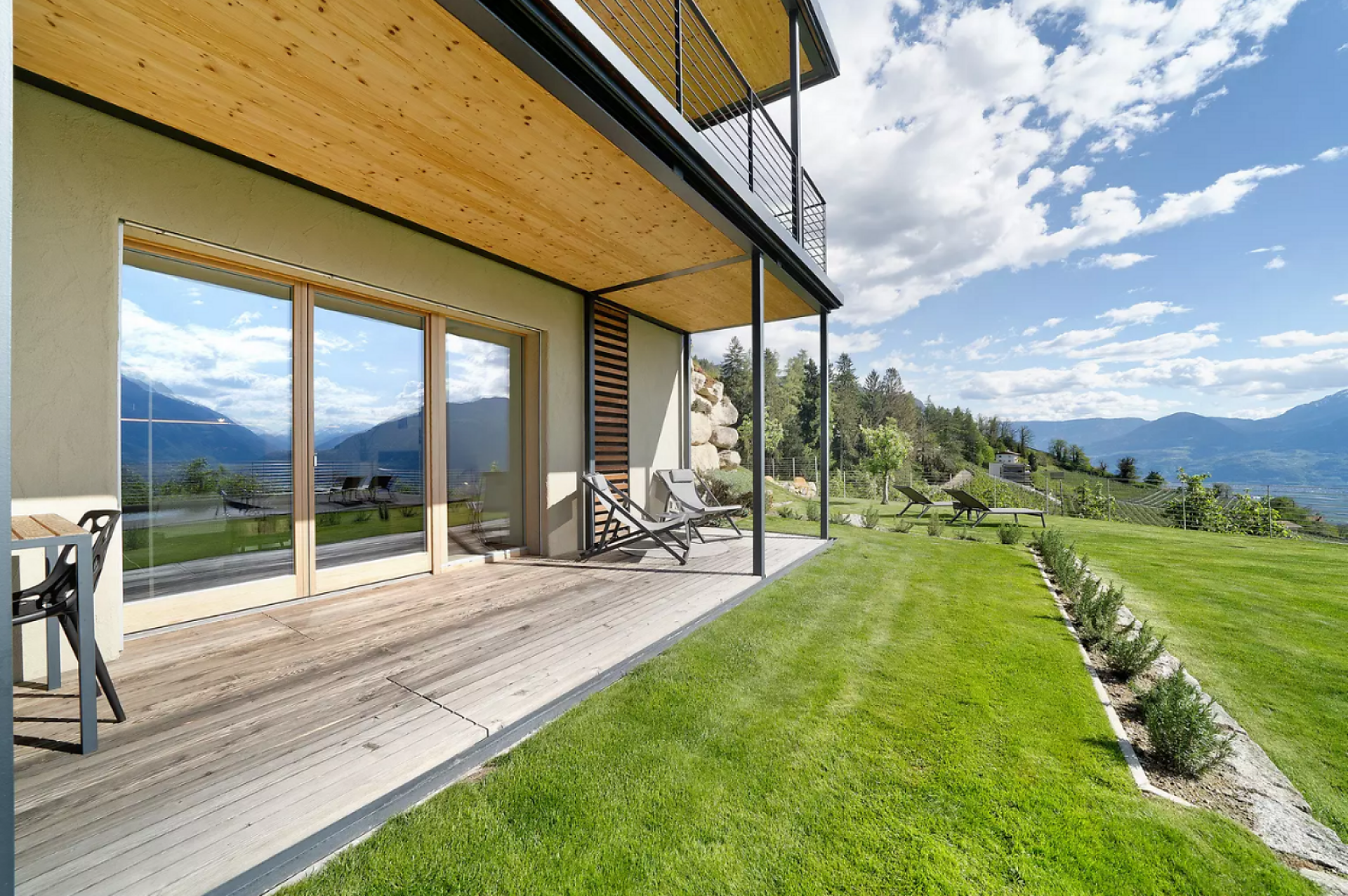Das moderne Interieur und Exterieur der fünf Suiten wurde in Eichenholz und Lärche gestaltet, große Fensterflächen holen die Natur nach Innen. Tradition, Moderne, Design und Natürlichkeit bilden durch eine architektonische Neuinterpretation eine Einheit und erschaffen einen einladenden Ort der Ruhe und Entschleunigung mit bester Aussicht auf 800 Meter Meereshöhe.