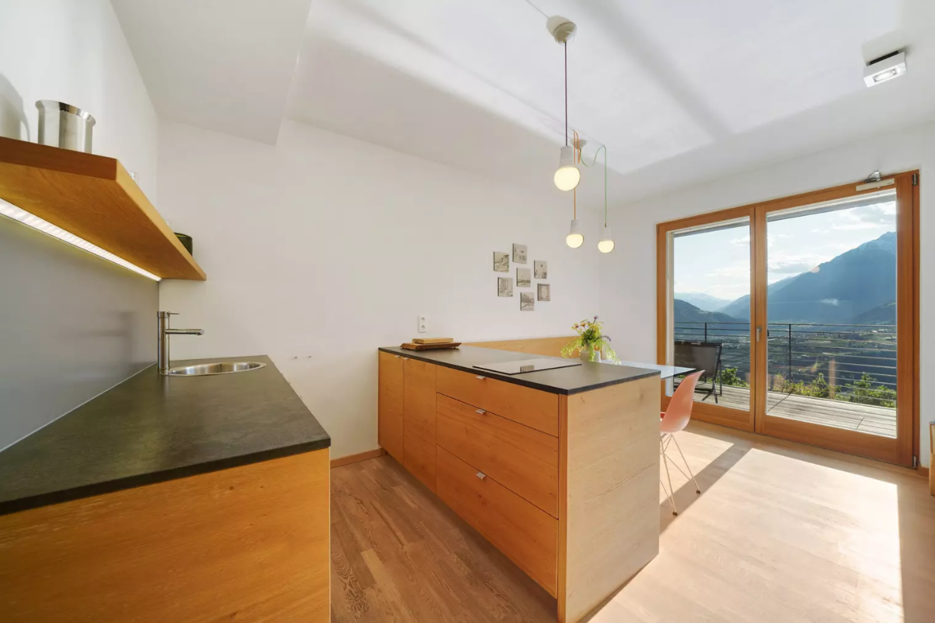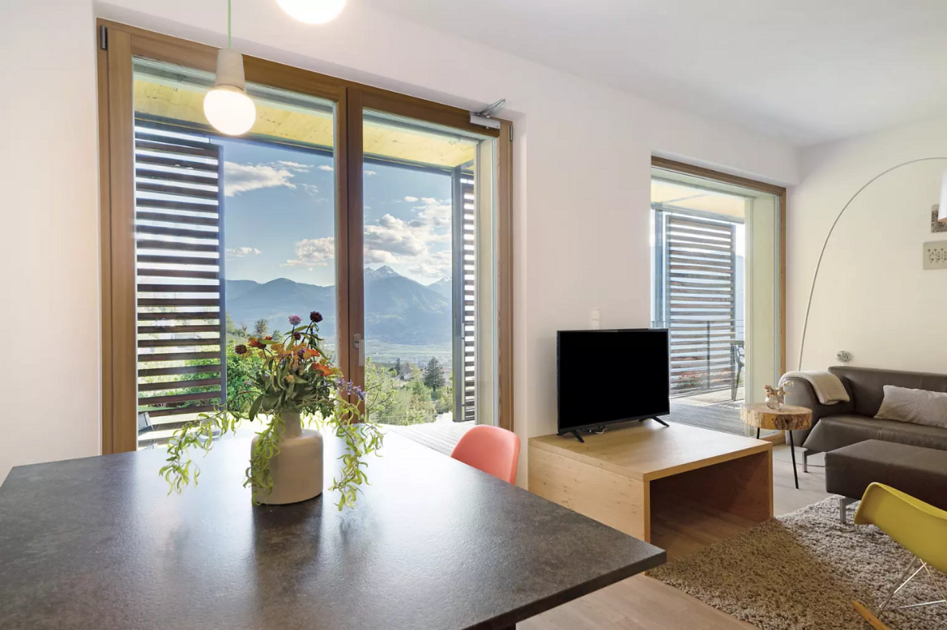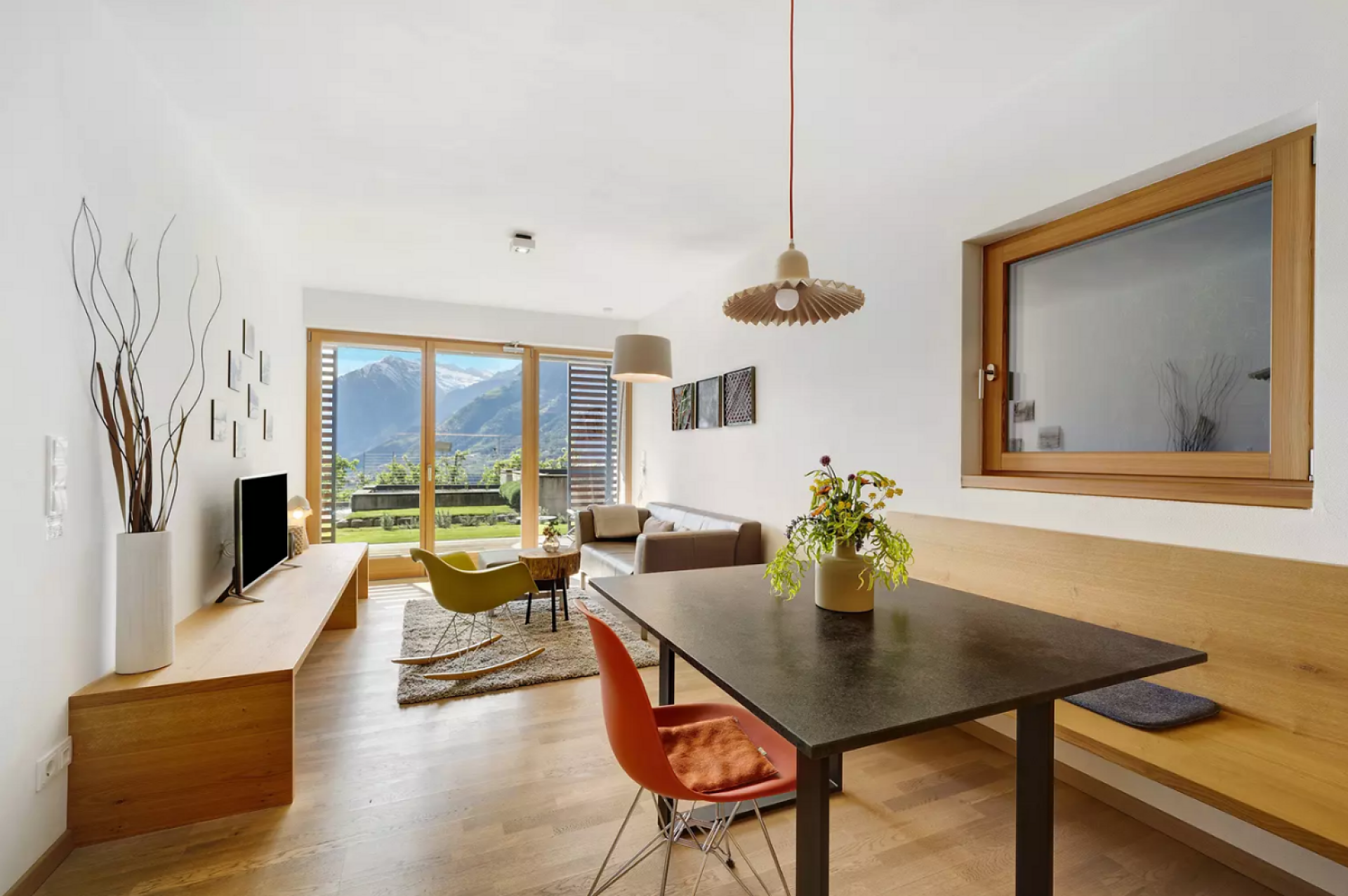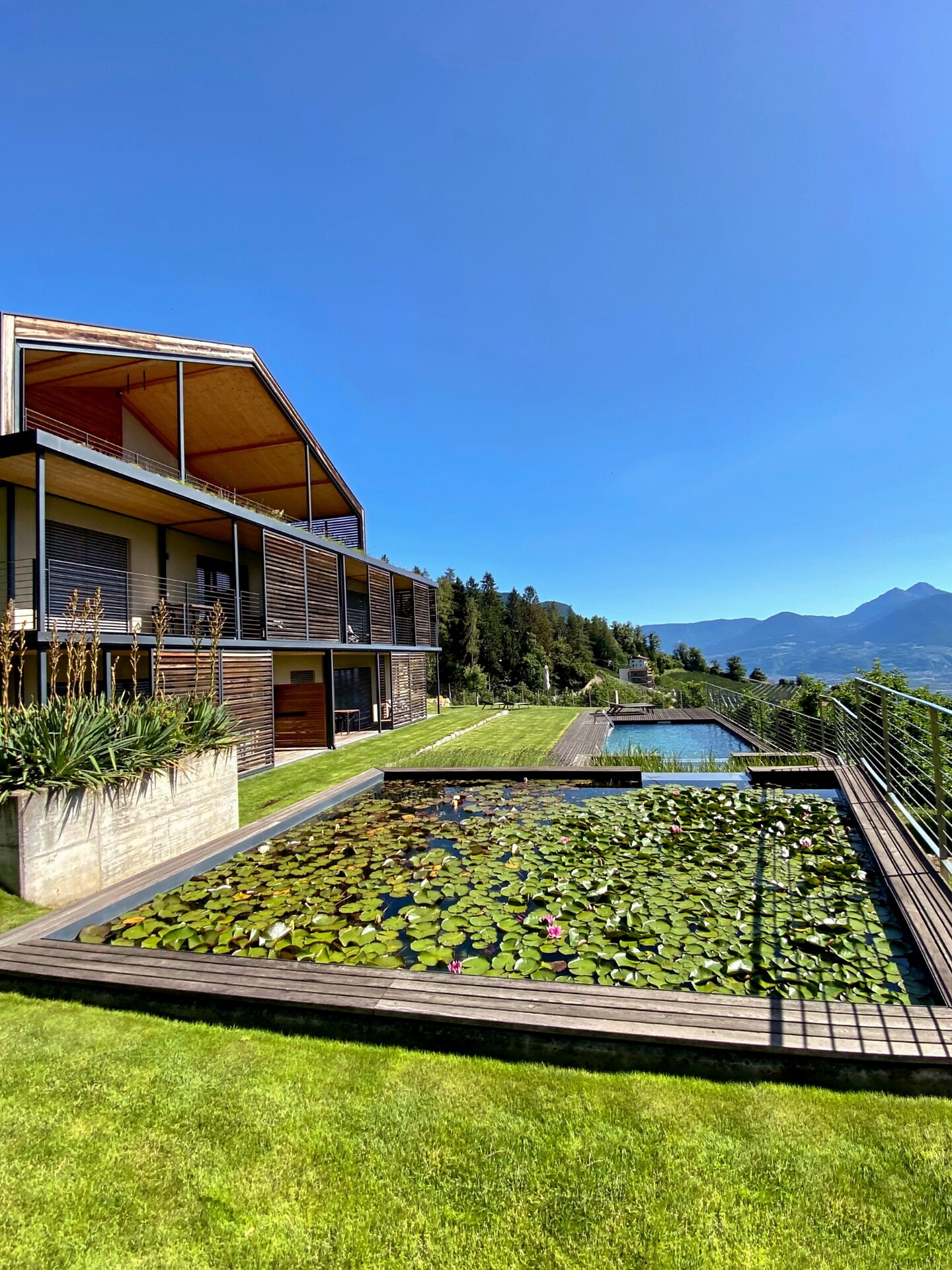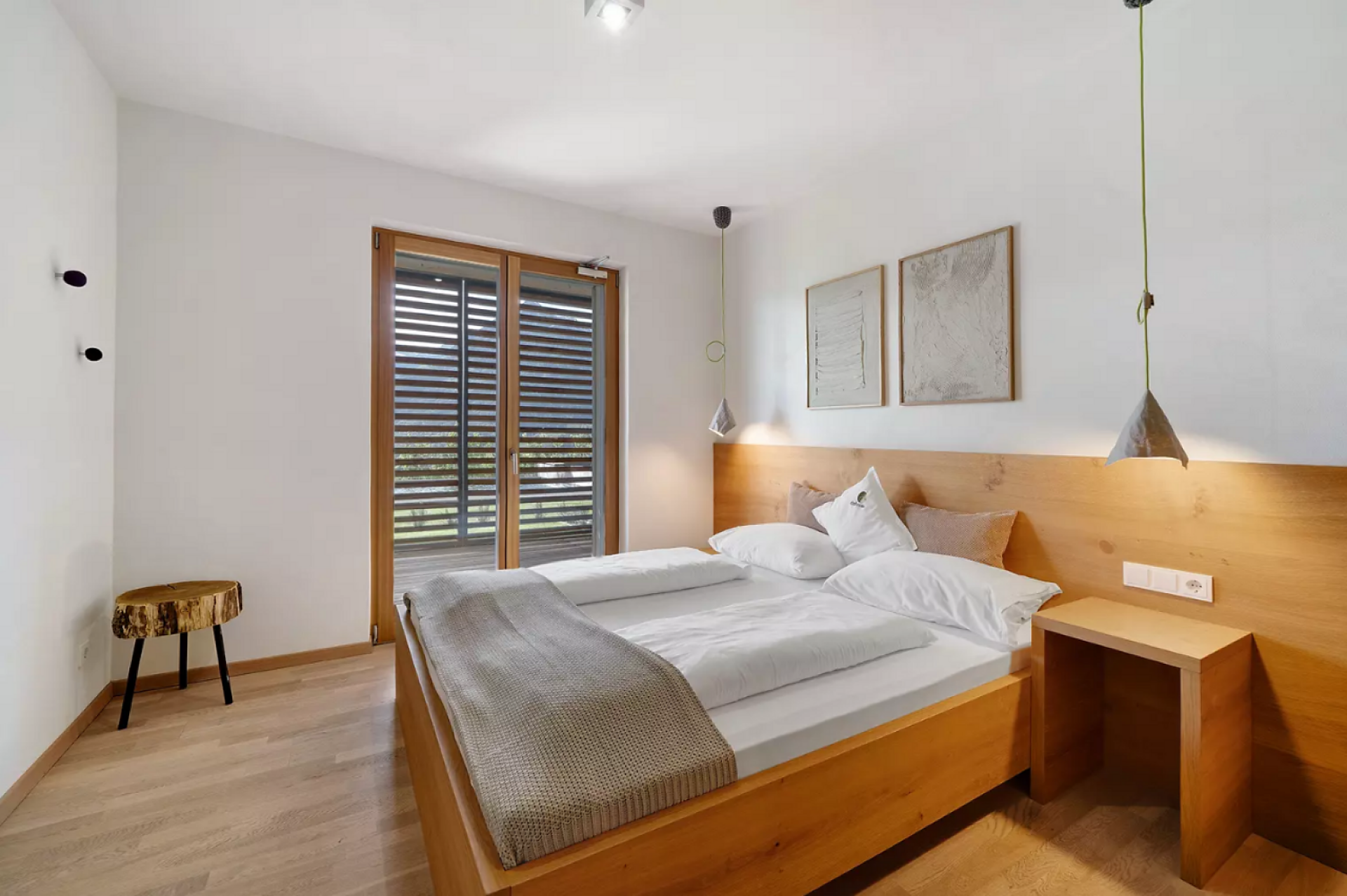 Das moderne Interieur und Exterieur der fünf Suiten wurde in Eichenholz und Lärche gestaltet, große Fensterflächen holen die Natur nach Innen. Tradition, Moderne, Design und Natürlichkeit bilden durch eine architektonische Neuinterpretation eine Einheit und erschaffen einen einladenden Ort der Ruhe und Entschleunigung mit bester Aussicht auf 800 Meter Meereshöhe.