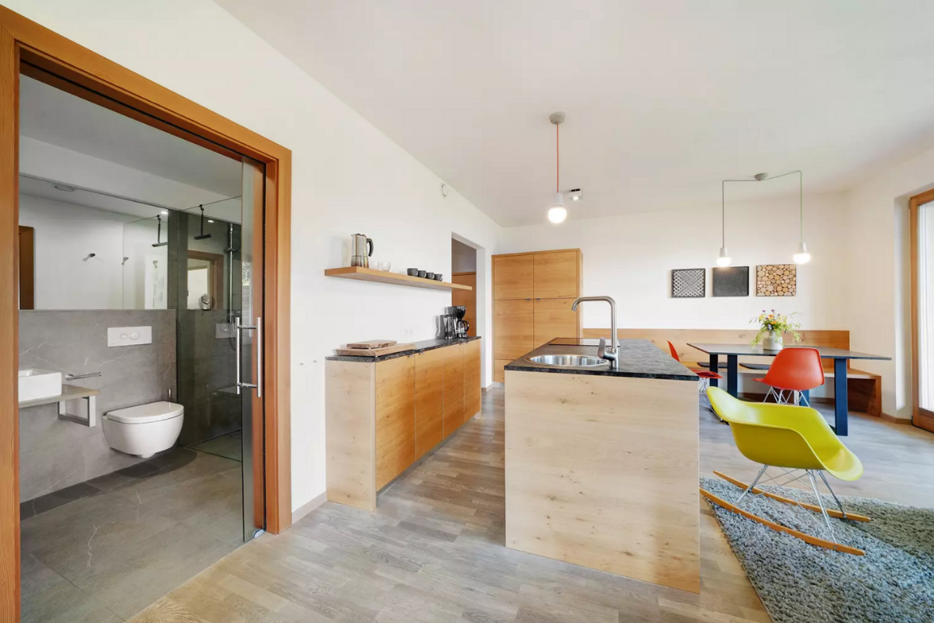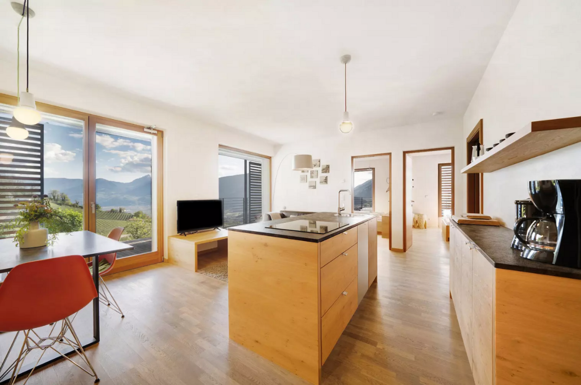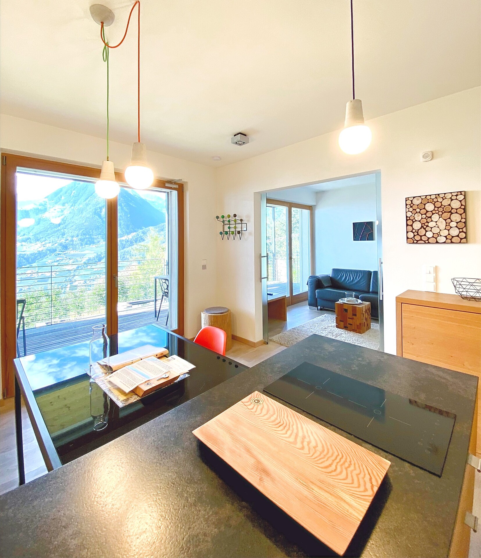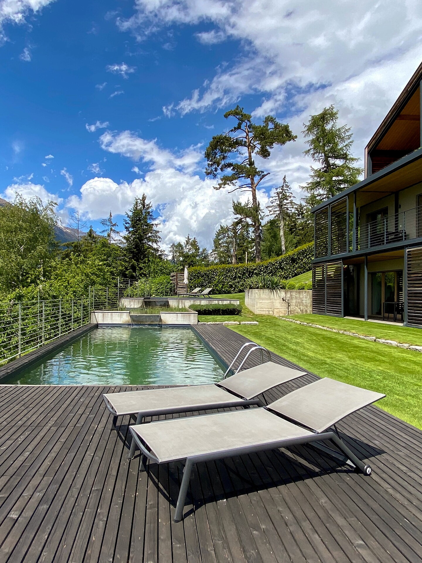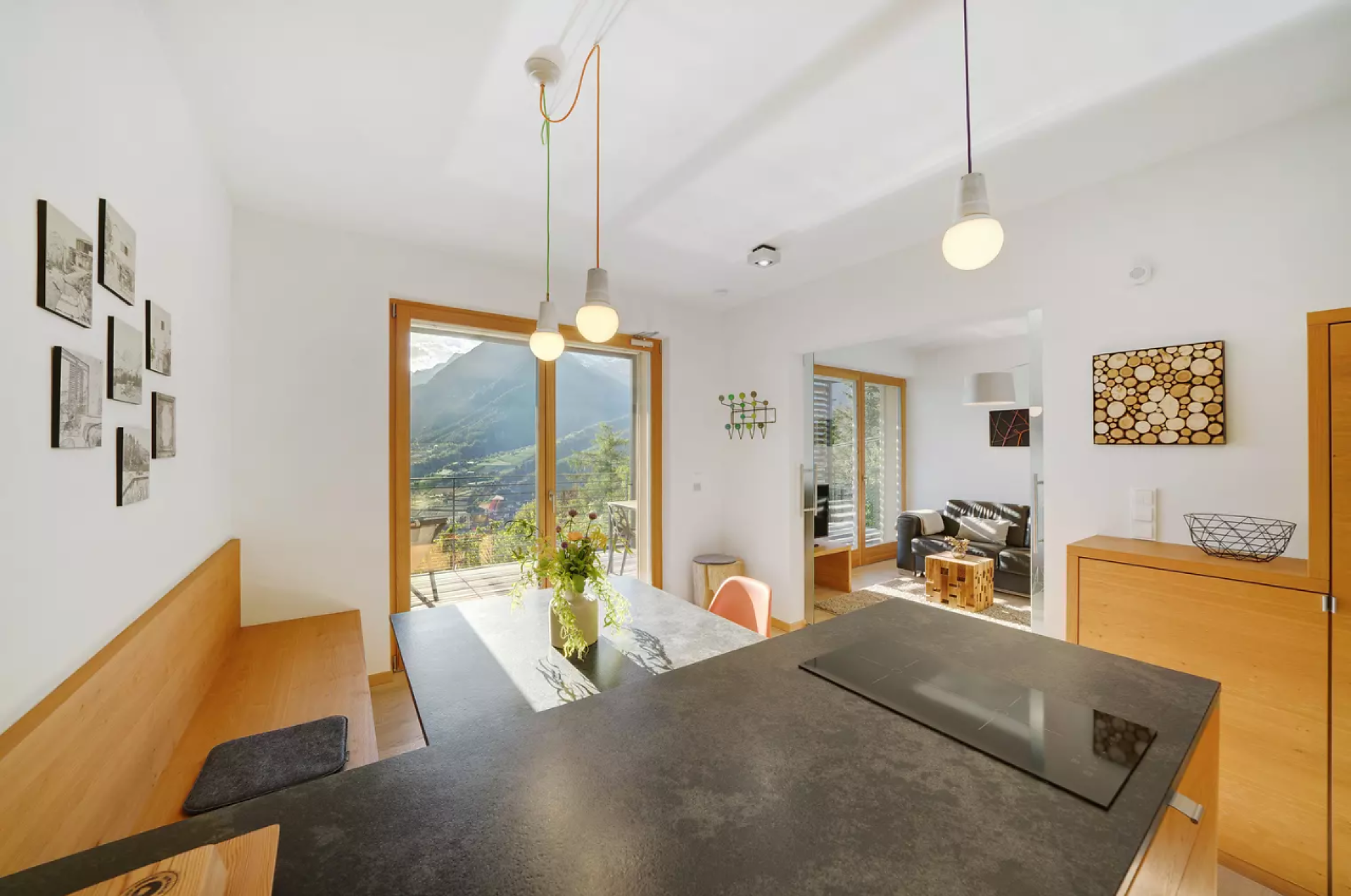 Das moderne Interieur und Exterieur der fünf Suiten wurde in Eichenholz und Lärche gestaltet, große Fensterflächen holen die Natur nach Innen. Tradition, Moderne, Design und Natürlichkeit bilden durch eine architektonische Neuinterpretation eine Einheit und erschaffen einen einladenden Ort der Ruhe und Entschleunigung mit bester Aussicht auf 800 Meter Meereshöhe.