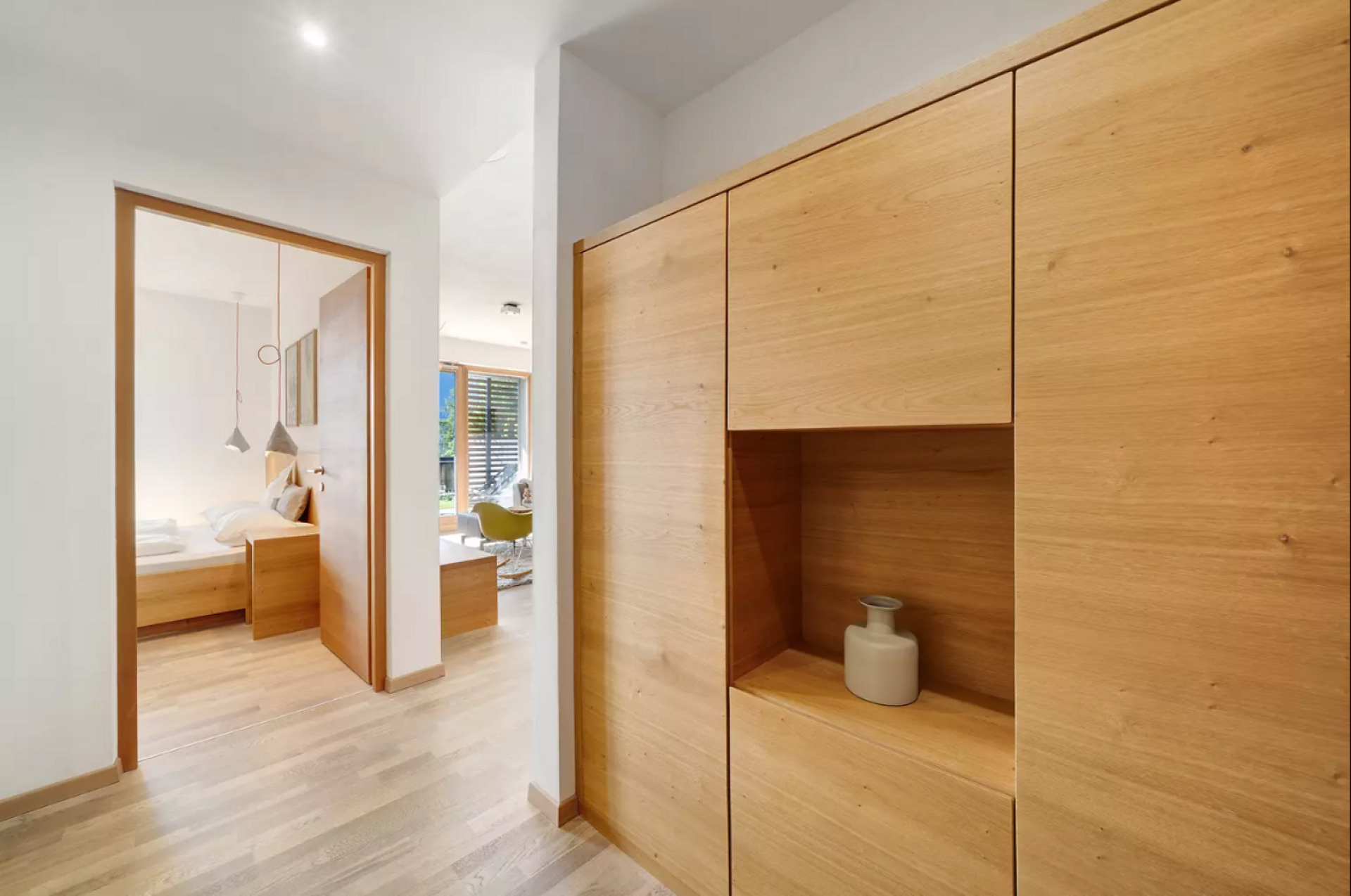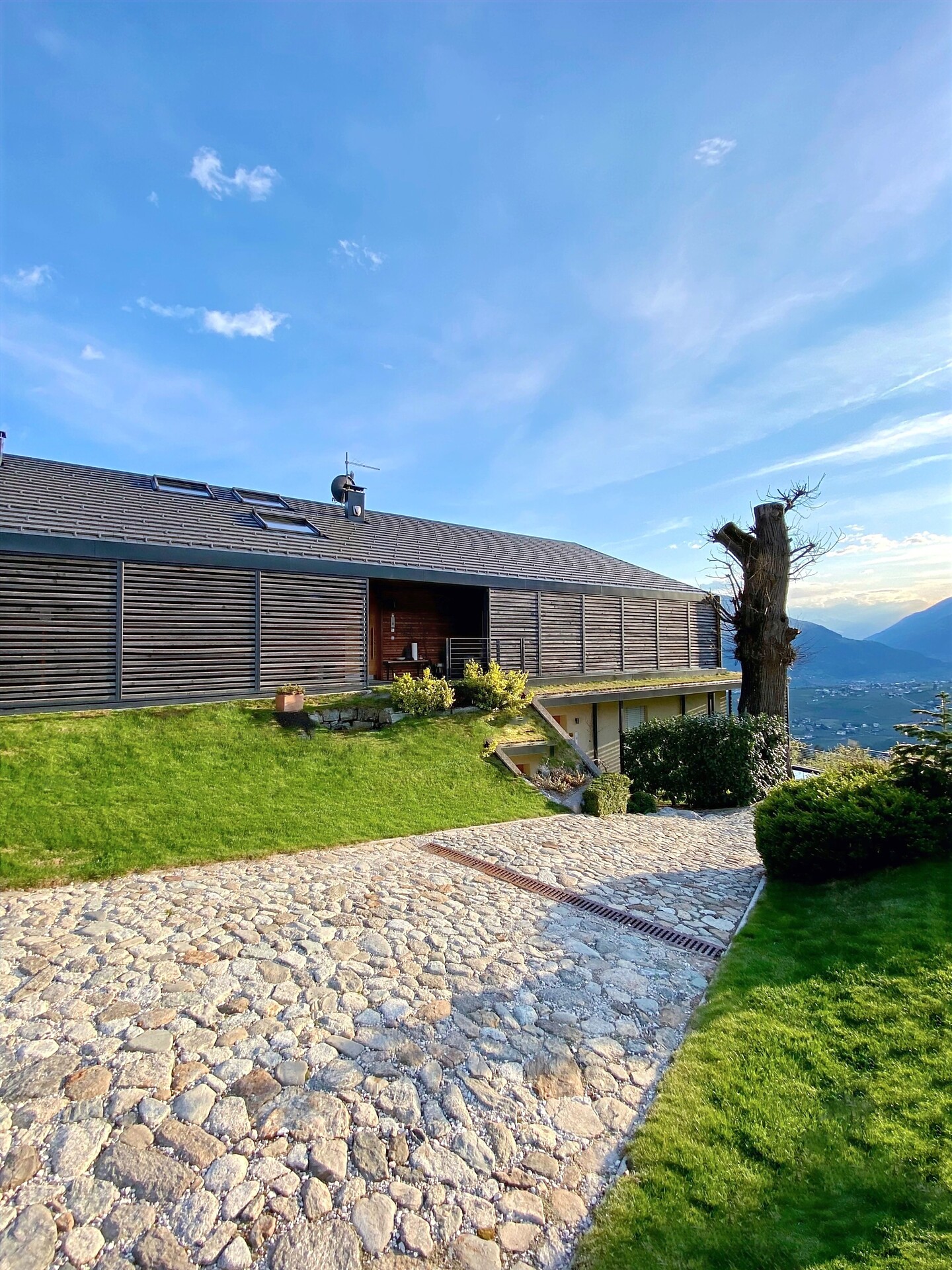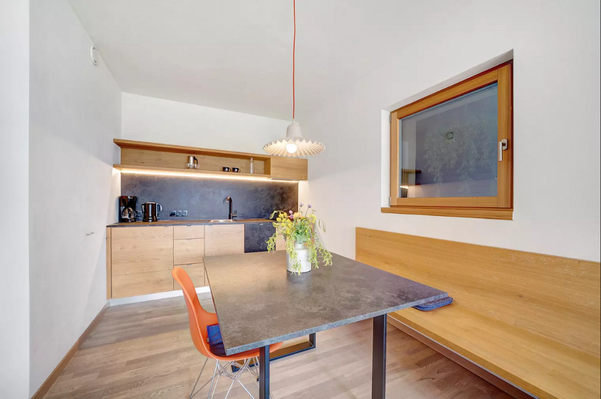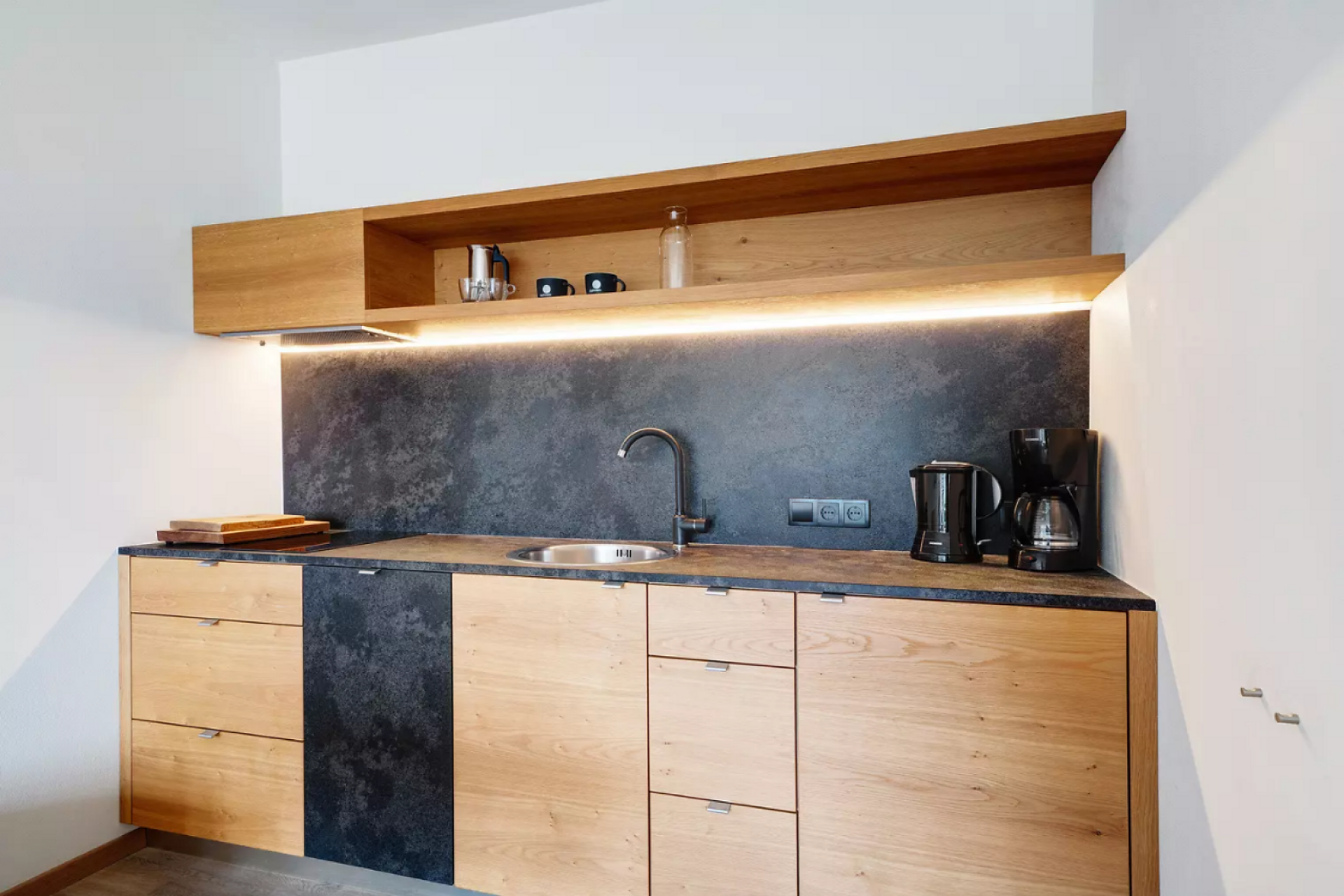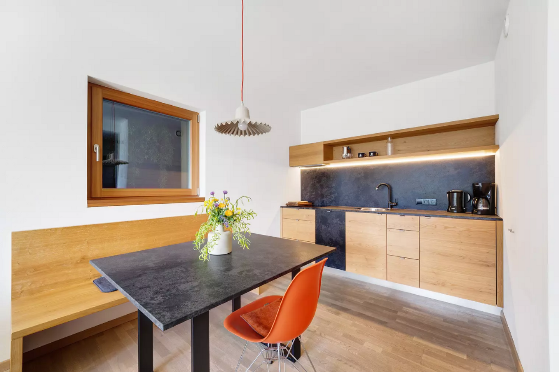 Das moderne Interieur und Exterieur der fünf Suiten wurde in Eichenholz und Lärche gestaltet, große Fensterflächen holen die Natur nach Innen. Tradition, Moderne, Design und Natürlichkeit bilden durch eine architektonische Neuinterpretation eine Einheit und erschaffen einen einladenden Ort der Ruhe und Entschleunigung mit bester Aussicht auf 800 Meter Meereshöhe.
