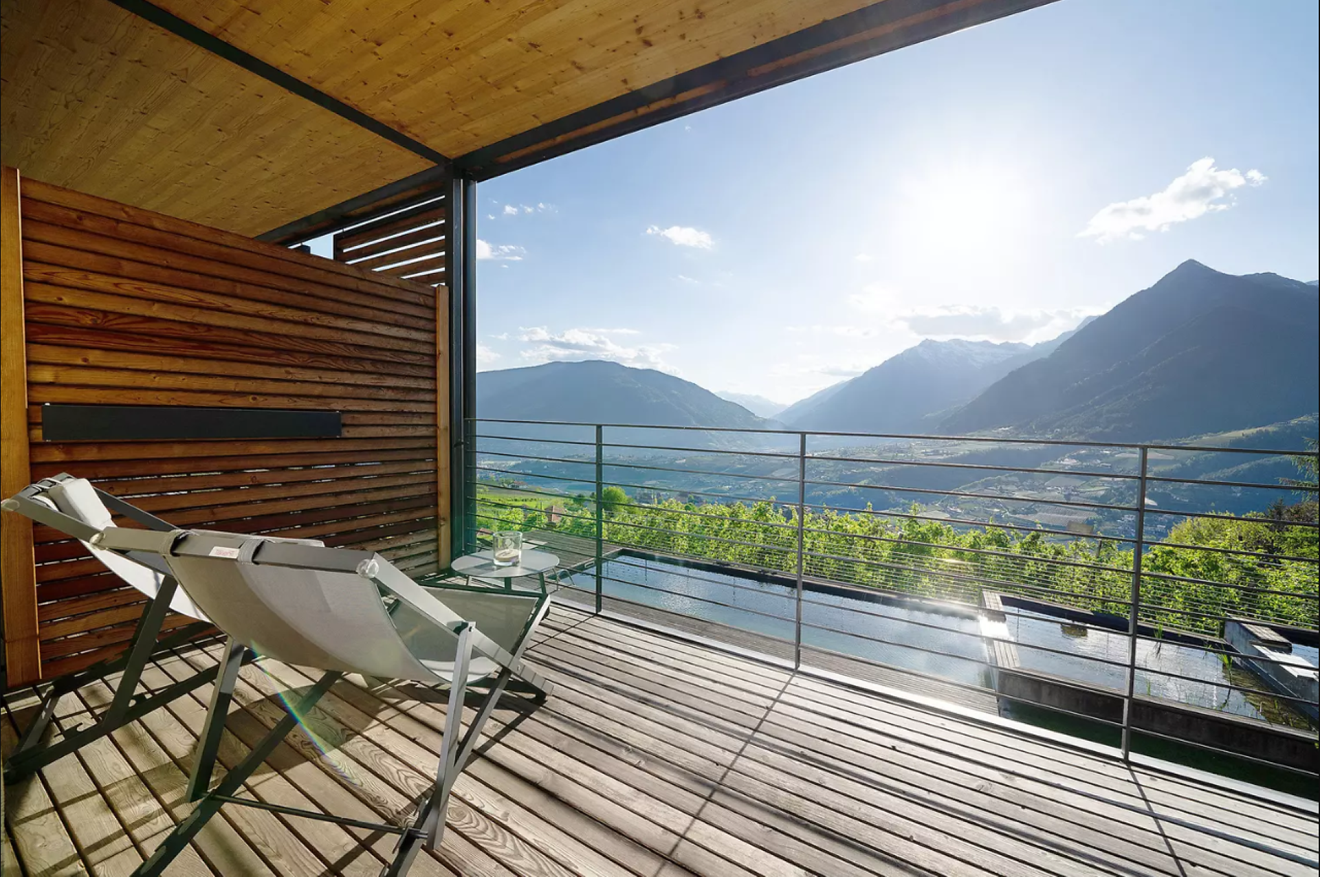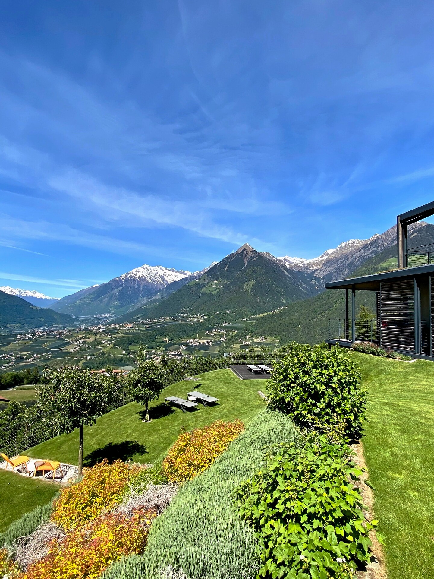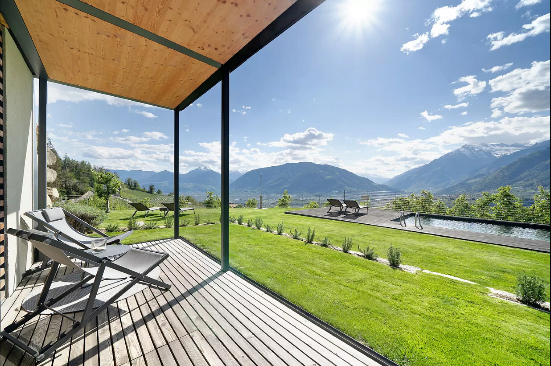 Genießen Sie Ihren Urlaub in unserer luxuriösen Relaxsuite (40 m² Wohnfläche, 10 m² Terrasse, 20 m² privater Garten). Die Südlage garantiert Sonne satt und einen traumhaften Panoramablick auf Meran und das Etschtal. Die komplett verglaste Suite bietet höchsten Komfort für zwei Personen.