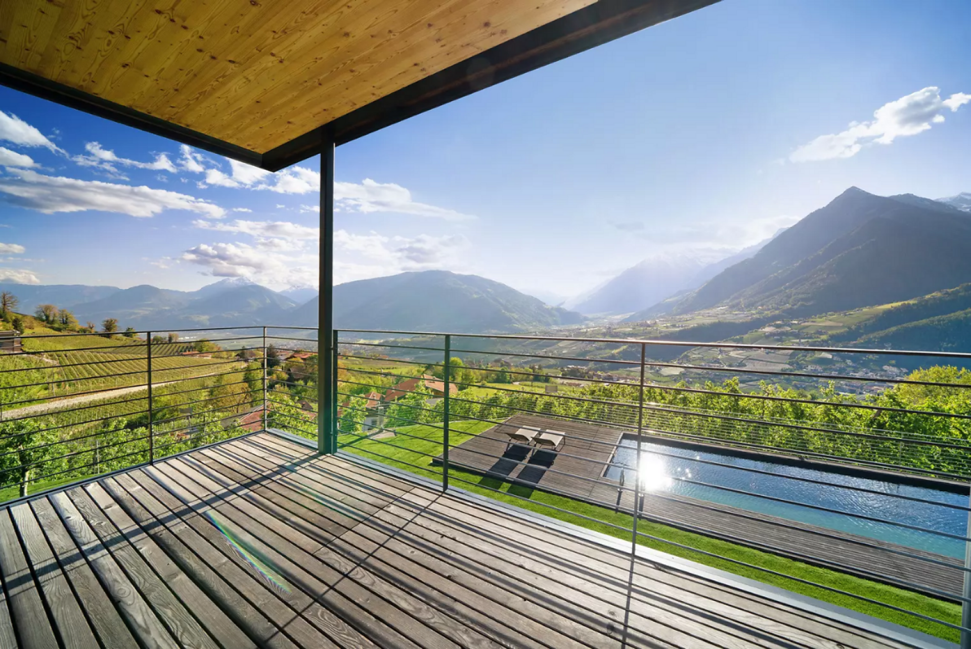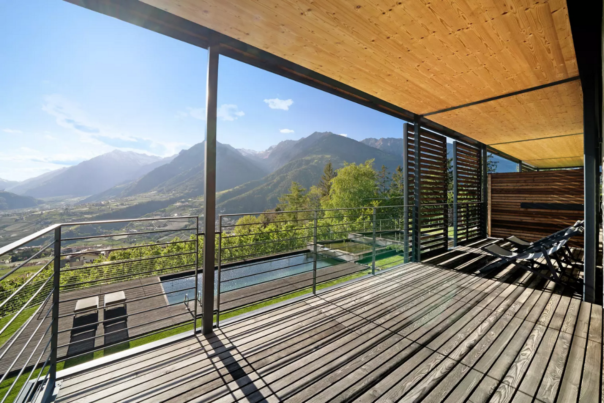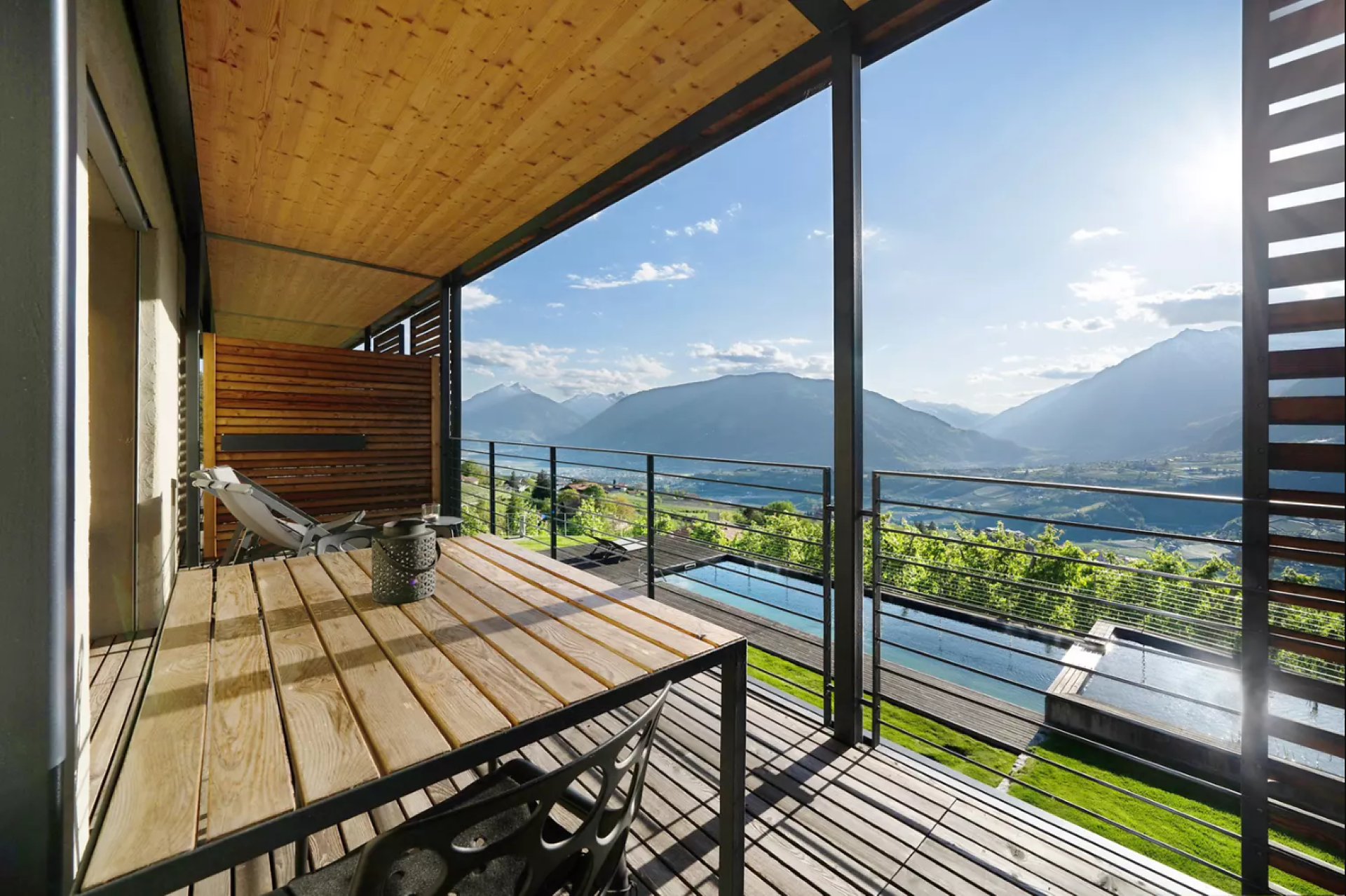 Genießen Sie Ihren Urlaub in unserer luxuriösen Relaxsuite (40 m² Wohnfläche, 10 m² Terrasse, 20 m² privater Garten). Die Südlage garantiert Sonne satt und einen traumhaften Panoramablick auf Meran und das Etschtal. Die komplett verglaste Suite bietet höchsten Komfort für zwei Personen.
