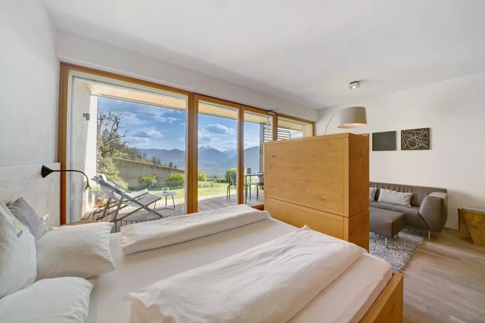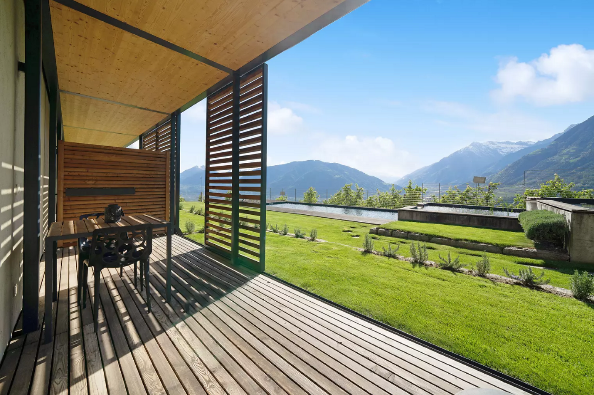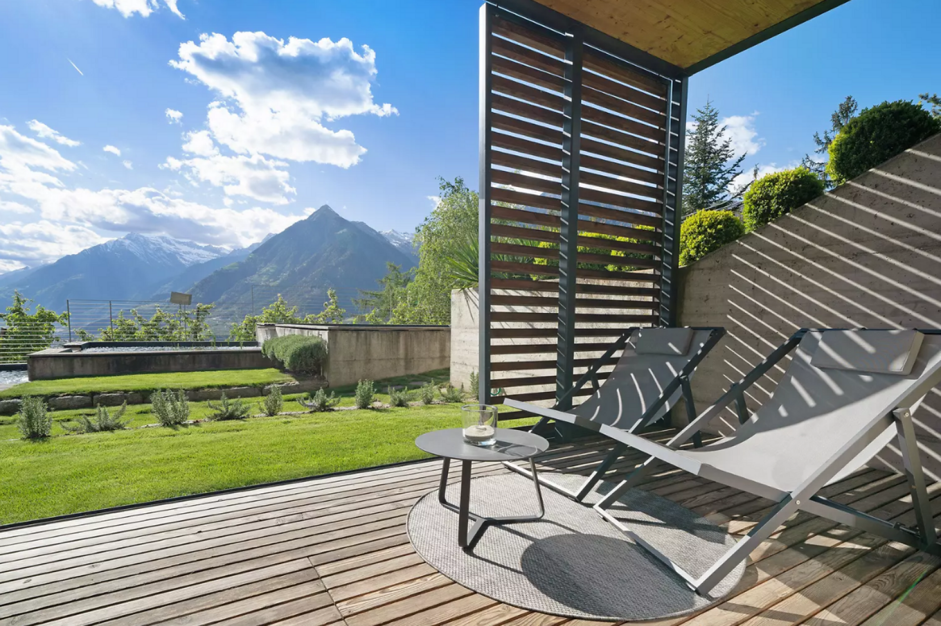Erleben Sie unvergleichlichen Komfort in unserer Gardensuite L. Auf 46 m² erwarten Sie ein stilvolles Design, ein privater Garten (16 m²) mit atemberaubenden Blick auf Meran und den Vinschgau, sowie eine 16 m² große Terrasse. Der ideale Rückzugsort für zwei.