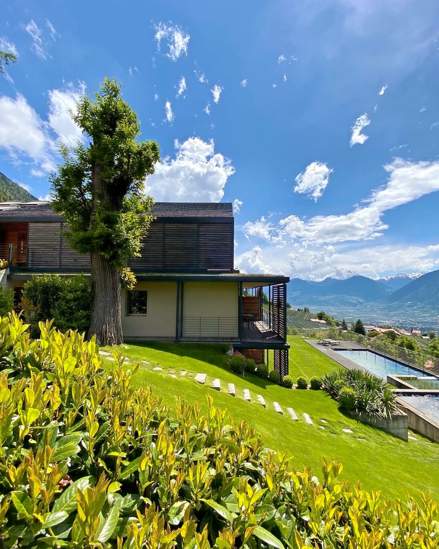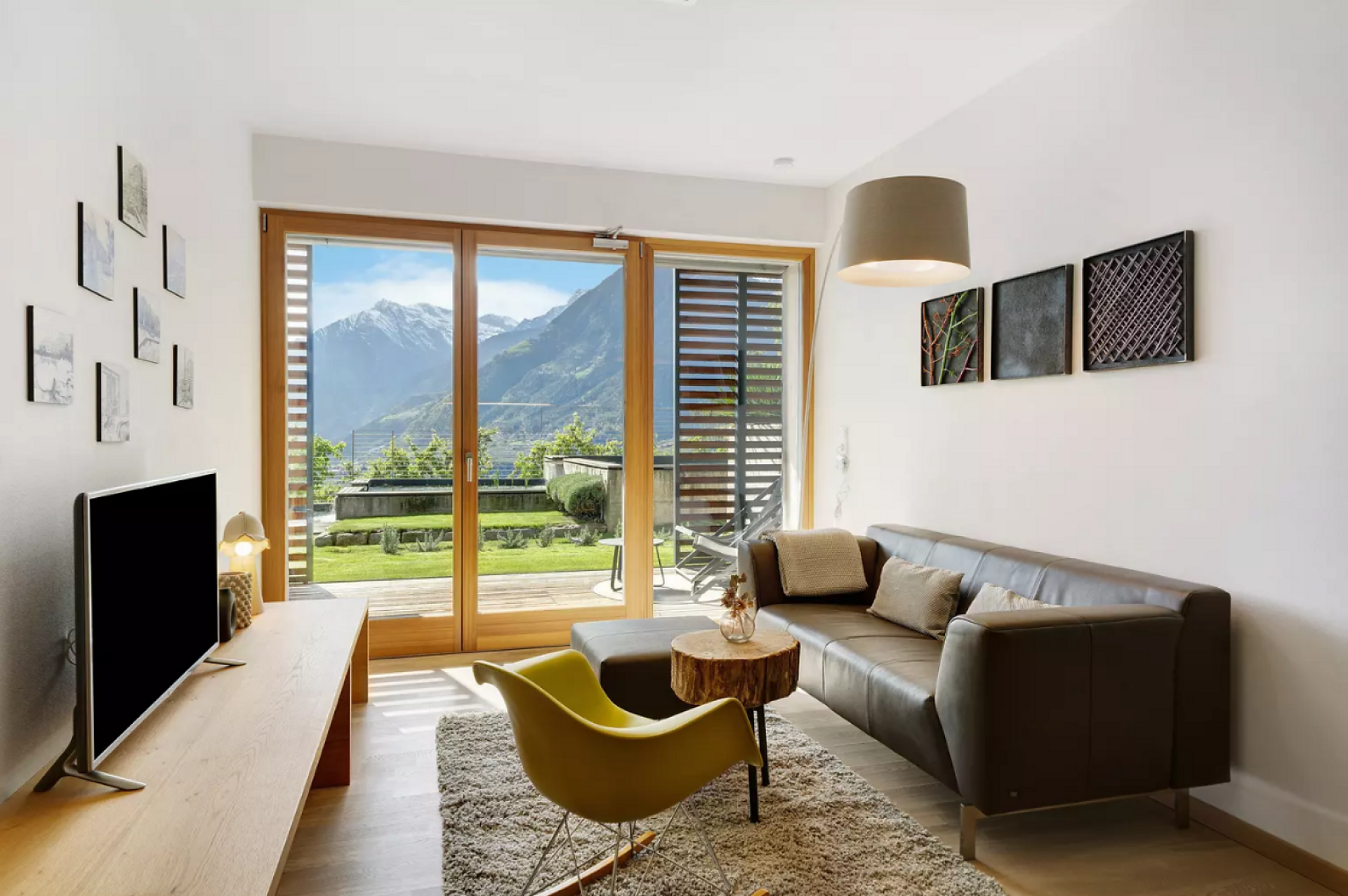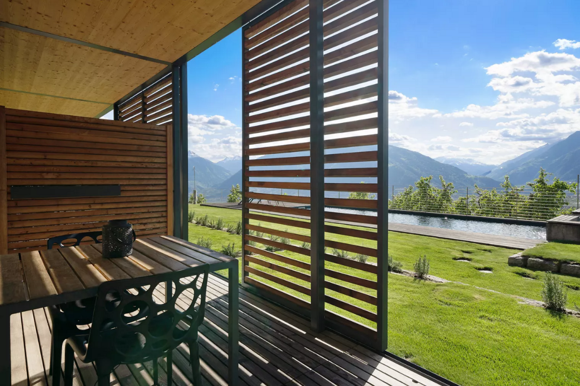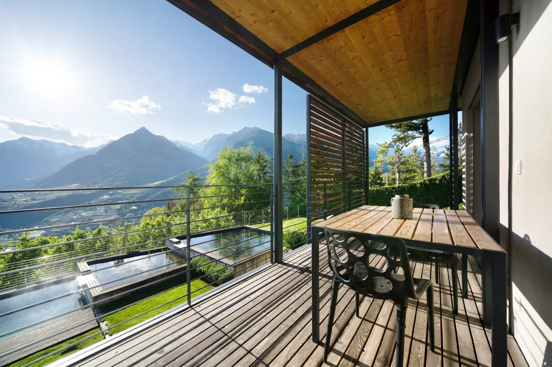 Erleben Sie unvergleichlichen Komfort in unserer Gardensuite L. Auf 46 m² erwarten Sie ein stilvolles Design, ein privater Garten (16 m²) mit atemberaubenden Blick auf Meran und den Vinschgau, sowie eine 16 m² große Terrasse. Der ideale Rückzugsort für zwei.