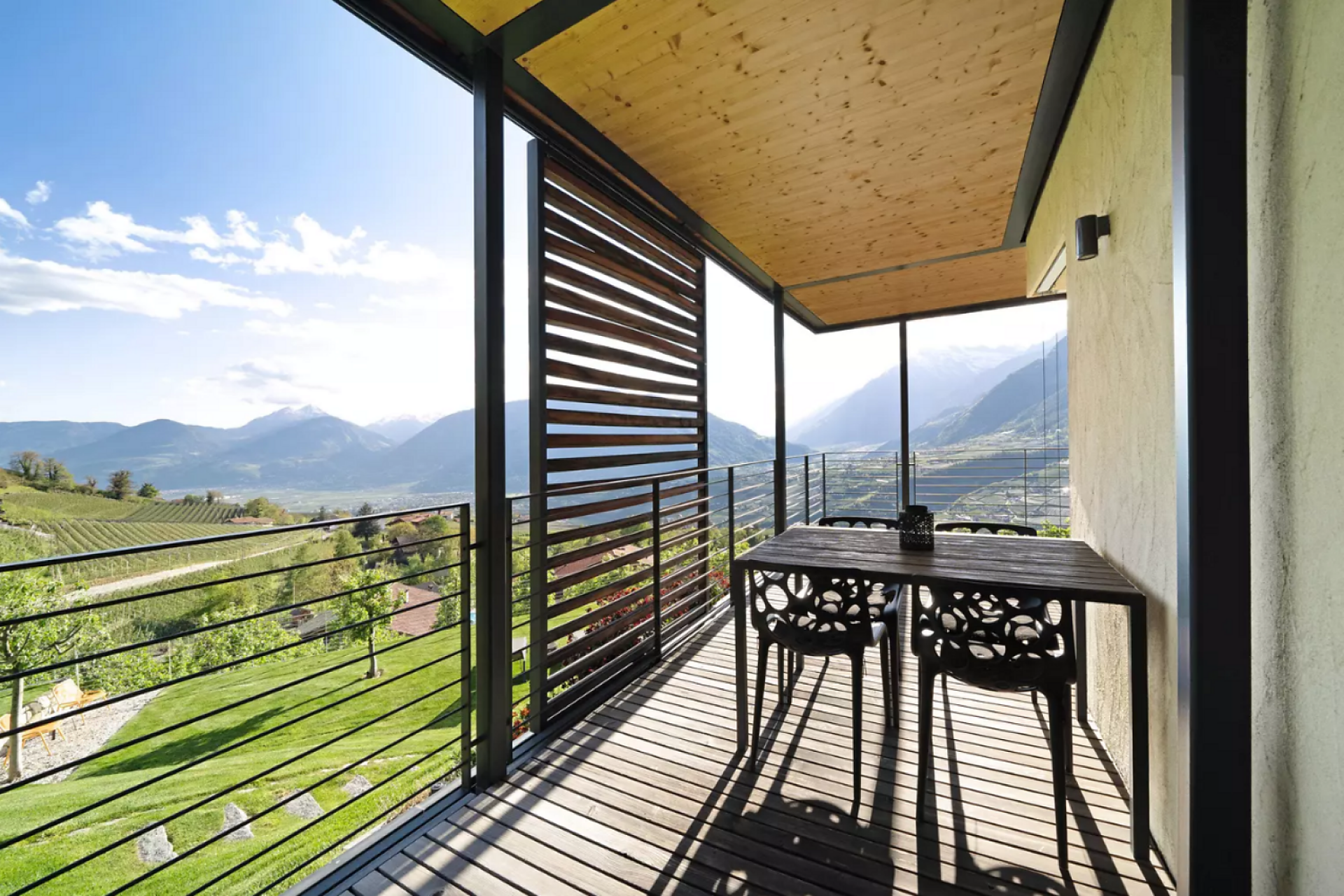 Entspannen Sie in unserer großzügigen Gardensuite R (43 m² Wohnfläche, 18 m² Terrasse, 18 m² privater Garten). Genießen Sie den atemberaubenden Panoramablick auf Meran und den Vinschgau von Ihrer südwestlich ausgerichteten Terrasse und dem privaten Garten. Die moderne Ausstattung und die gemütliche Atmosphäre schaffen den idealen Rückzugsort für zwei Personen.