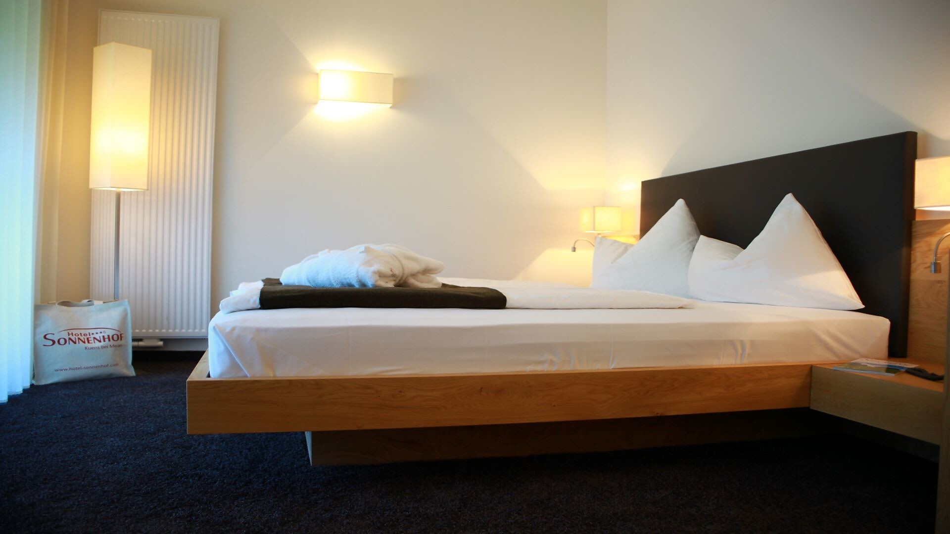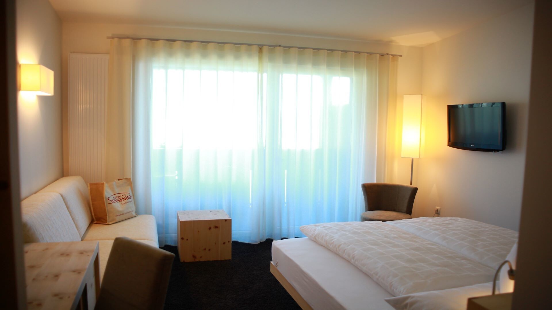 Südbalkon und Loggia zur Westseite, Bad-Dusche, WC, Bidet, Fön, Kosmetikspiegel, Badetasche mit Bademantel und -schuhen, Minibar, Flat-TV mit Sat, Tresor und Telefon, kostenloses Wlan, Sitzecke
