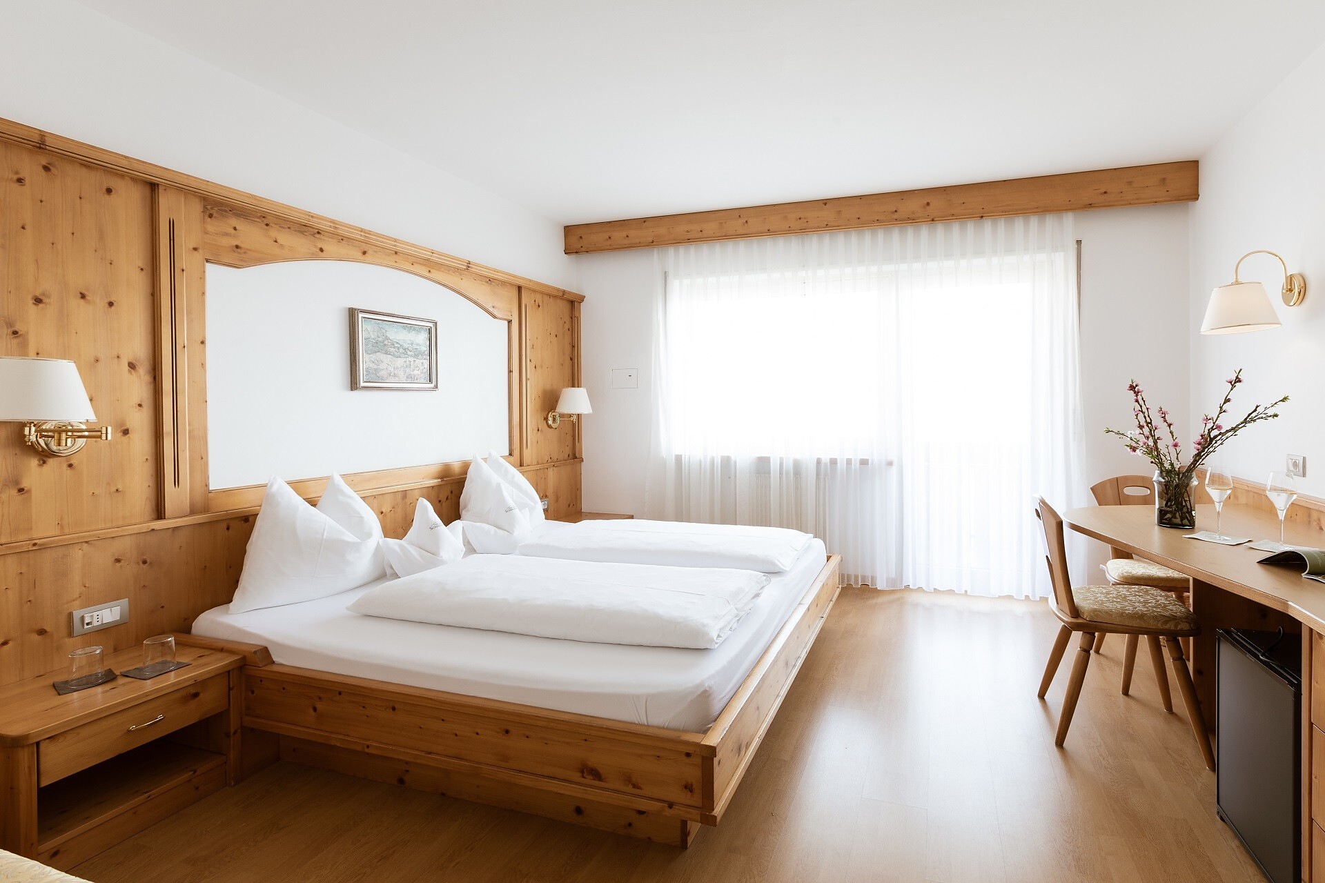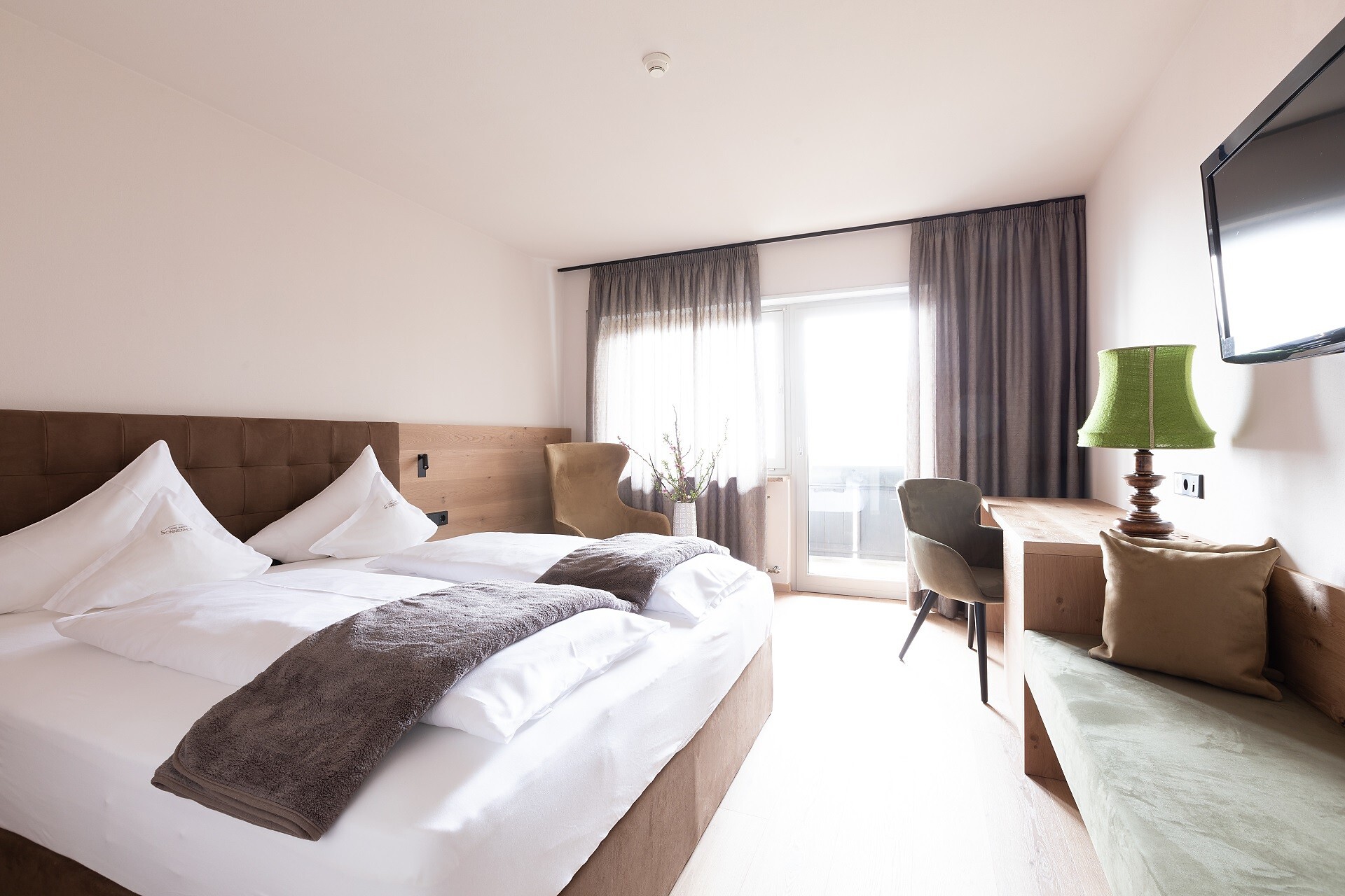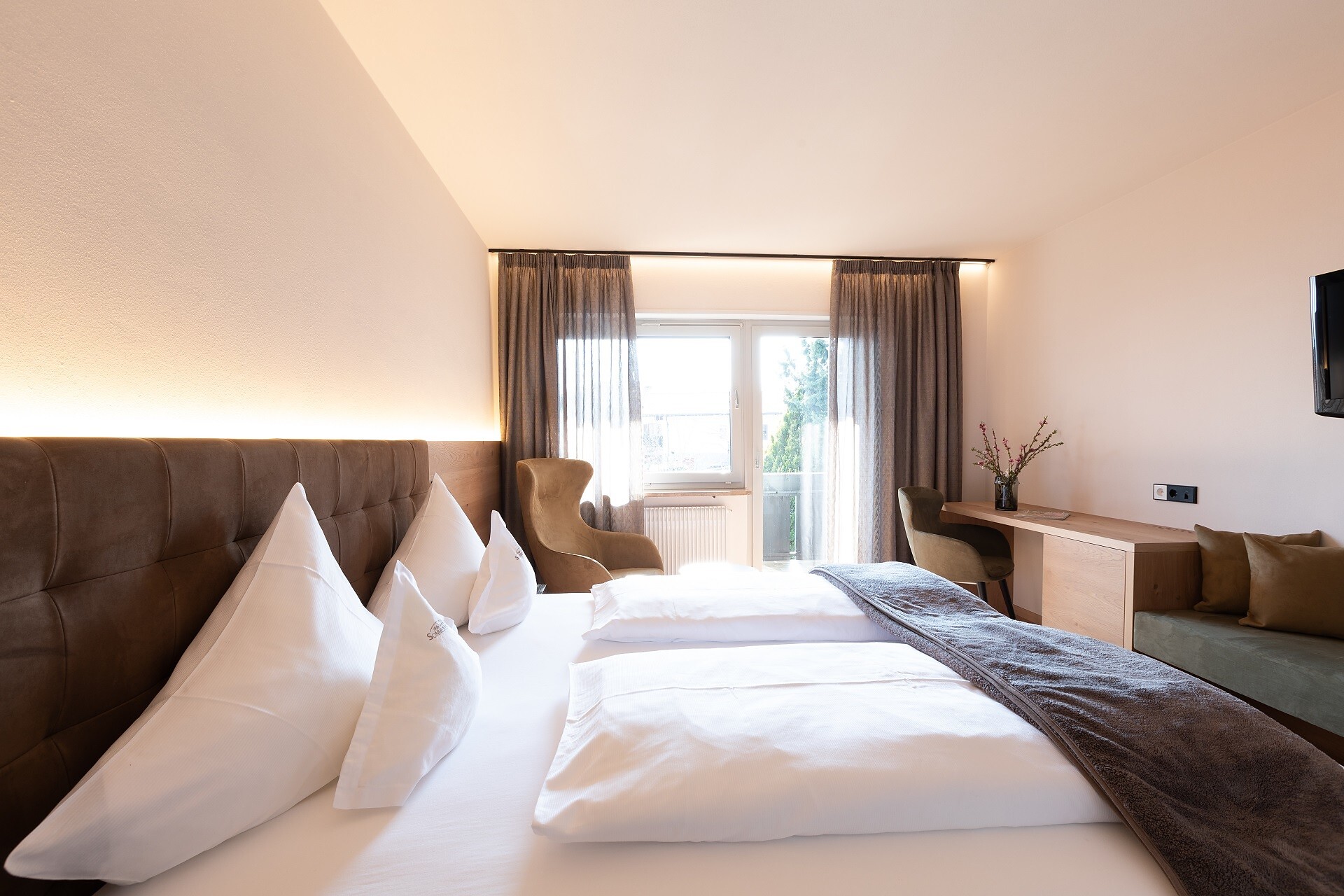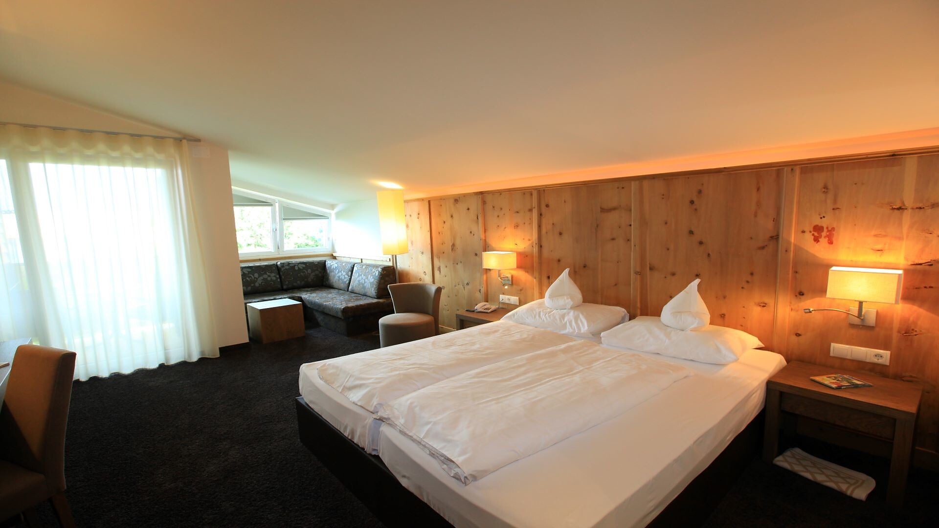 Suite, Doppelbett, Zustellbett, Babybett, Bettsofa, Balkon, Terrasse, Minibar, Safe, Dusche / Bad, Separates WC, Bidet, Haarfön, Bademantel, TV, Satellit/Kabel, WLAN, Internetanschluss, Haupthaus, Panoramablick, Südseite