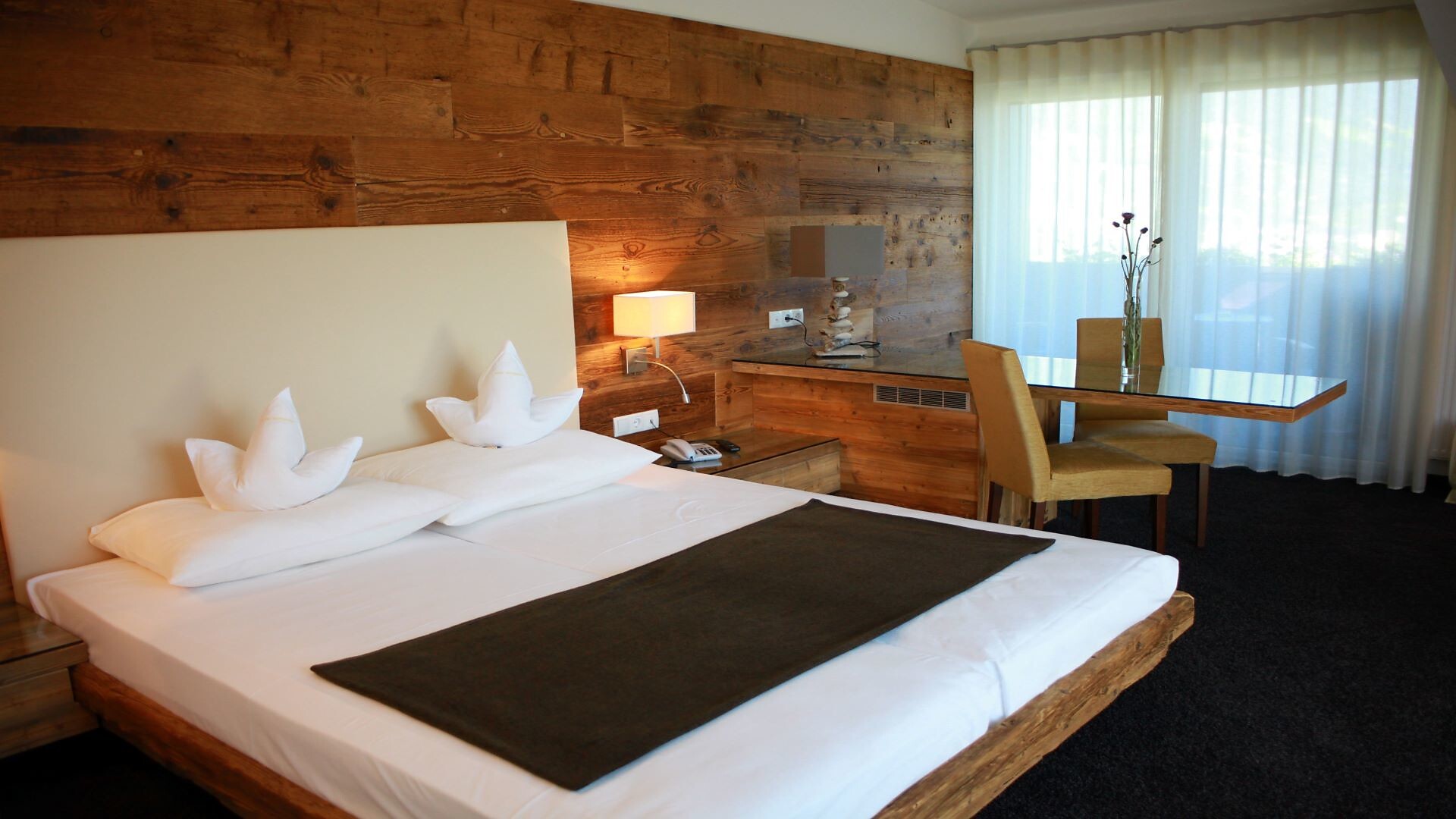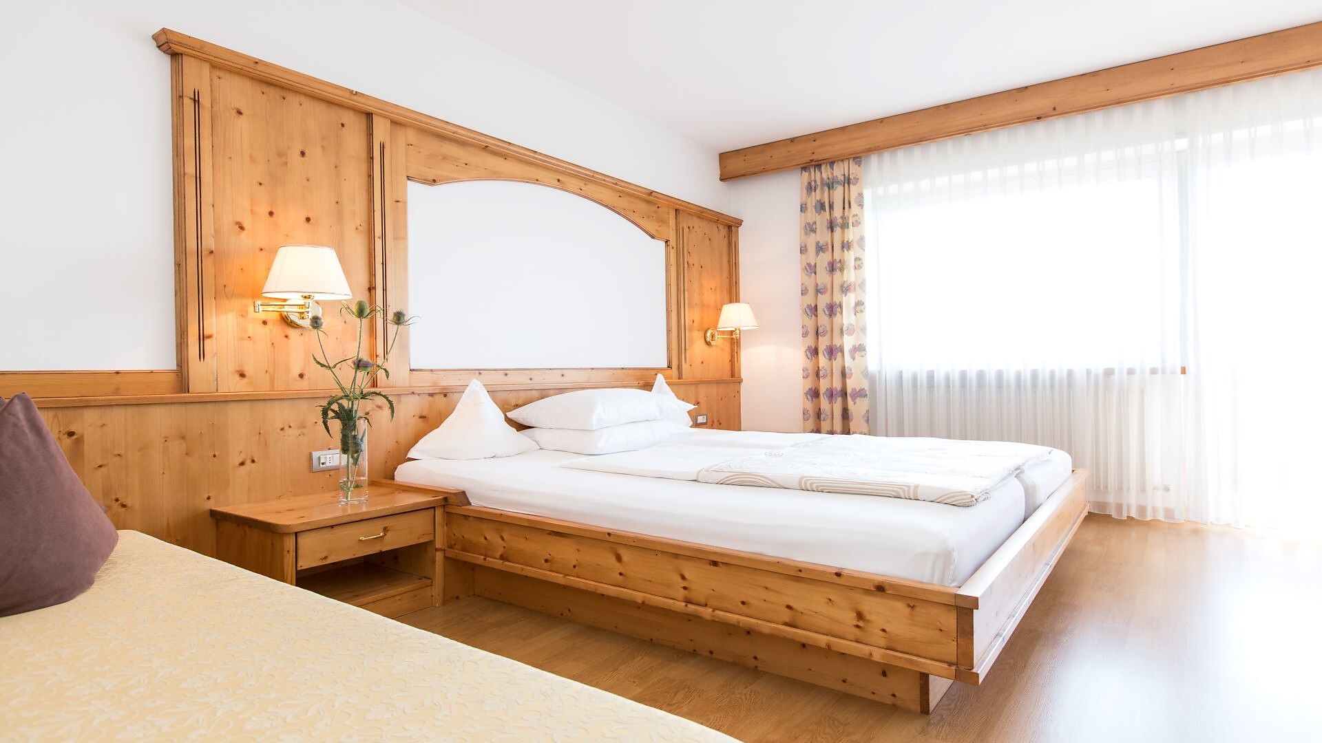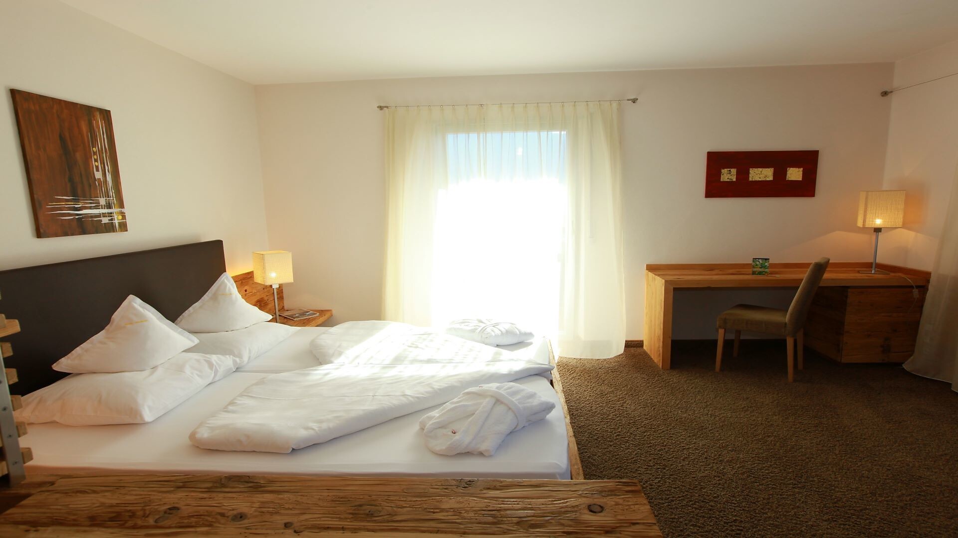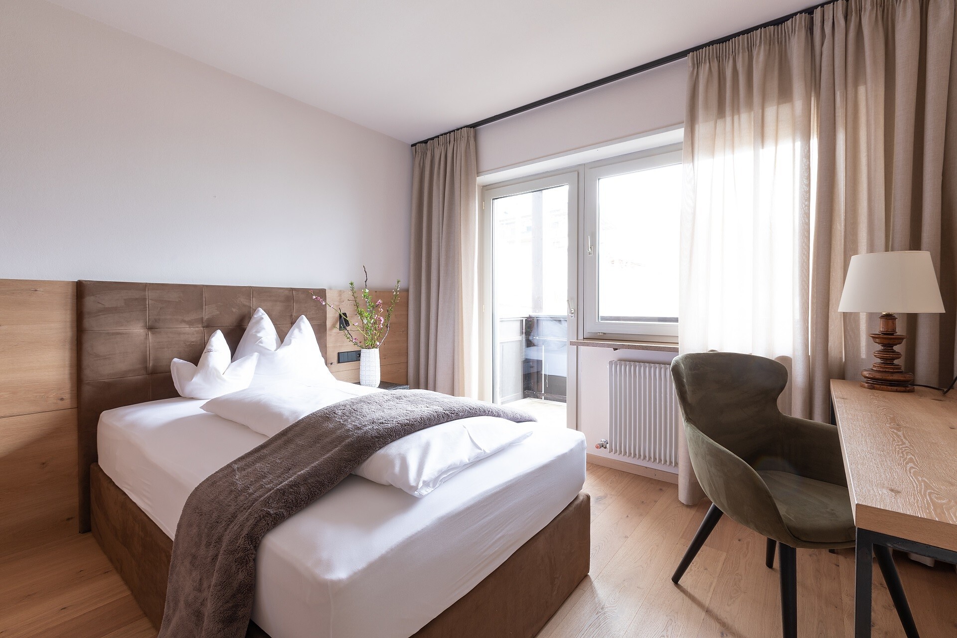 Suite, Doppelbett, Zustellbett, Babybett, Bettsofa, Balkon, Terrasse, Minibar, Safe, Dusche / Bad, Separates WC, Bidet, Haarfön, Bademantel, TV, Satellit/Kabel, WLAN, Internetanschluss, Haupthaus, Panoramablick, Südseite