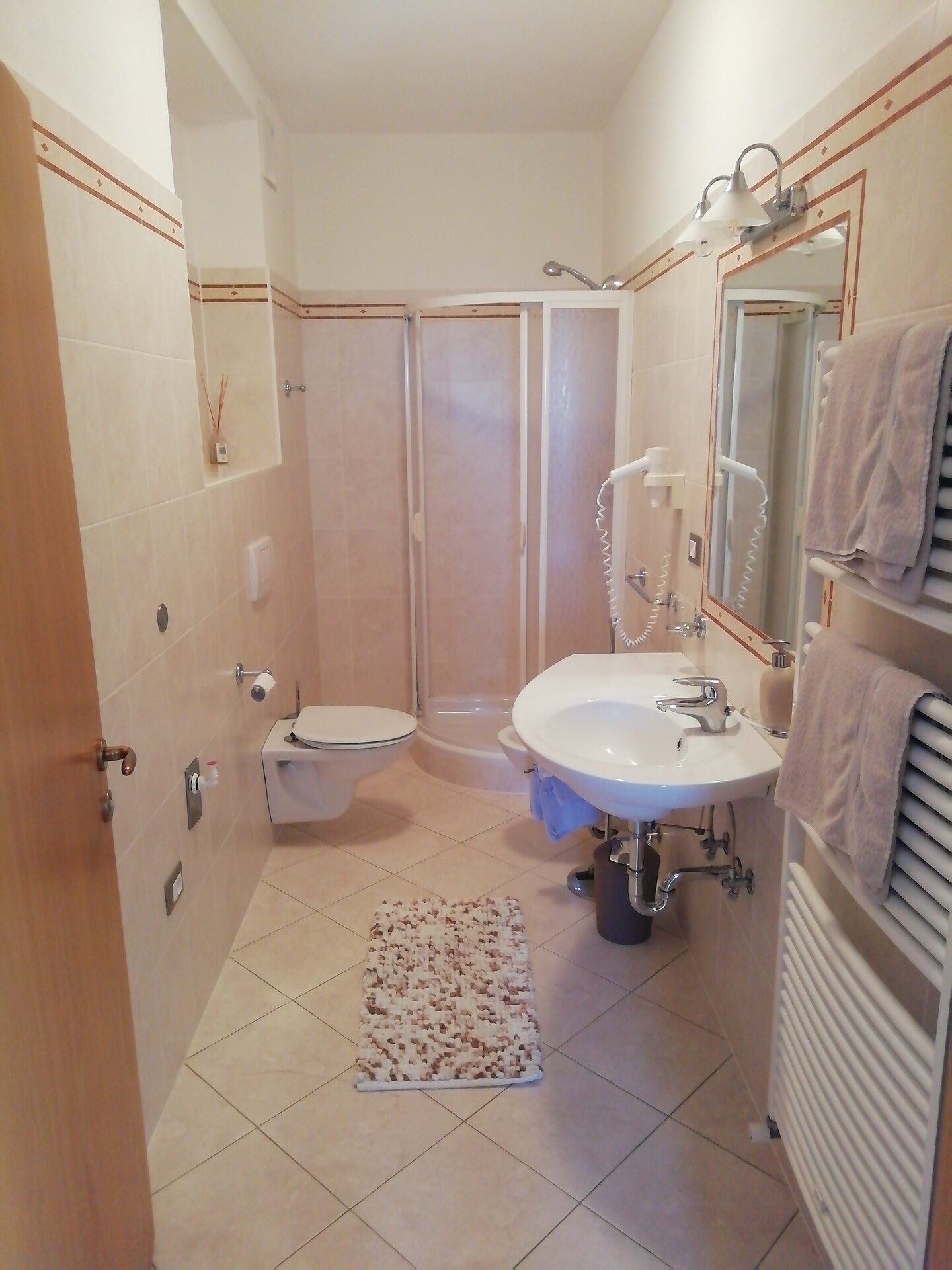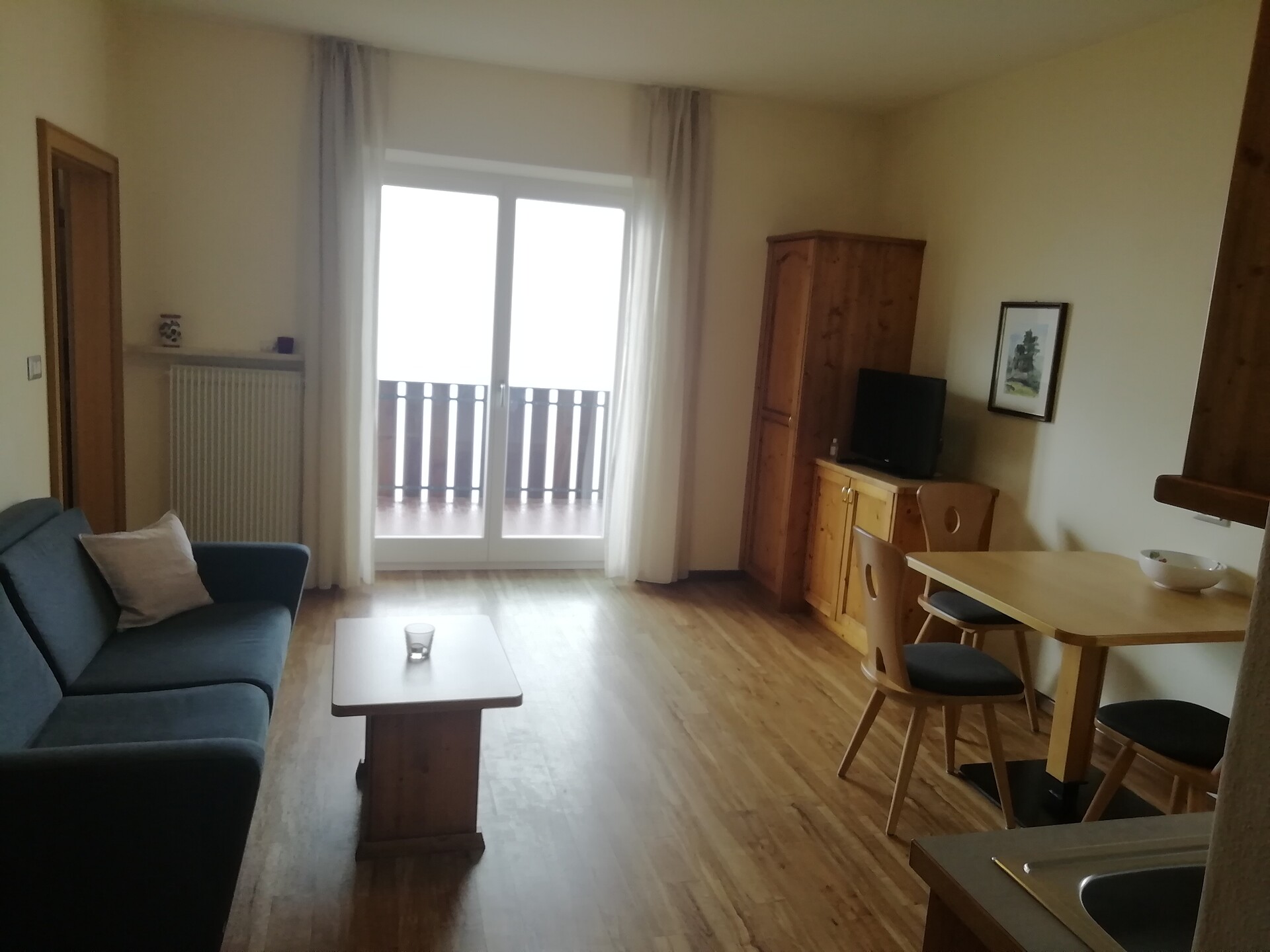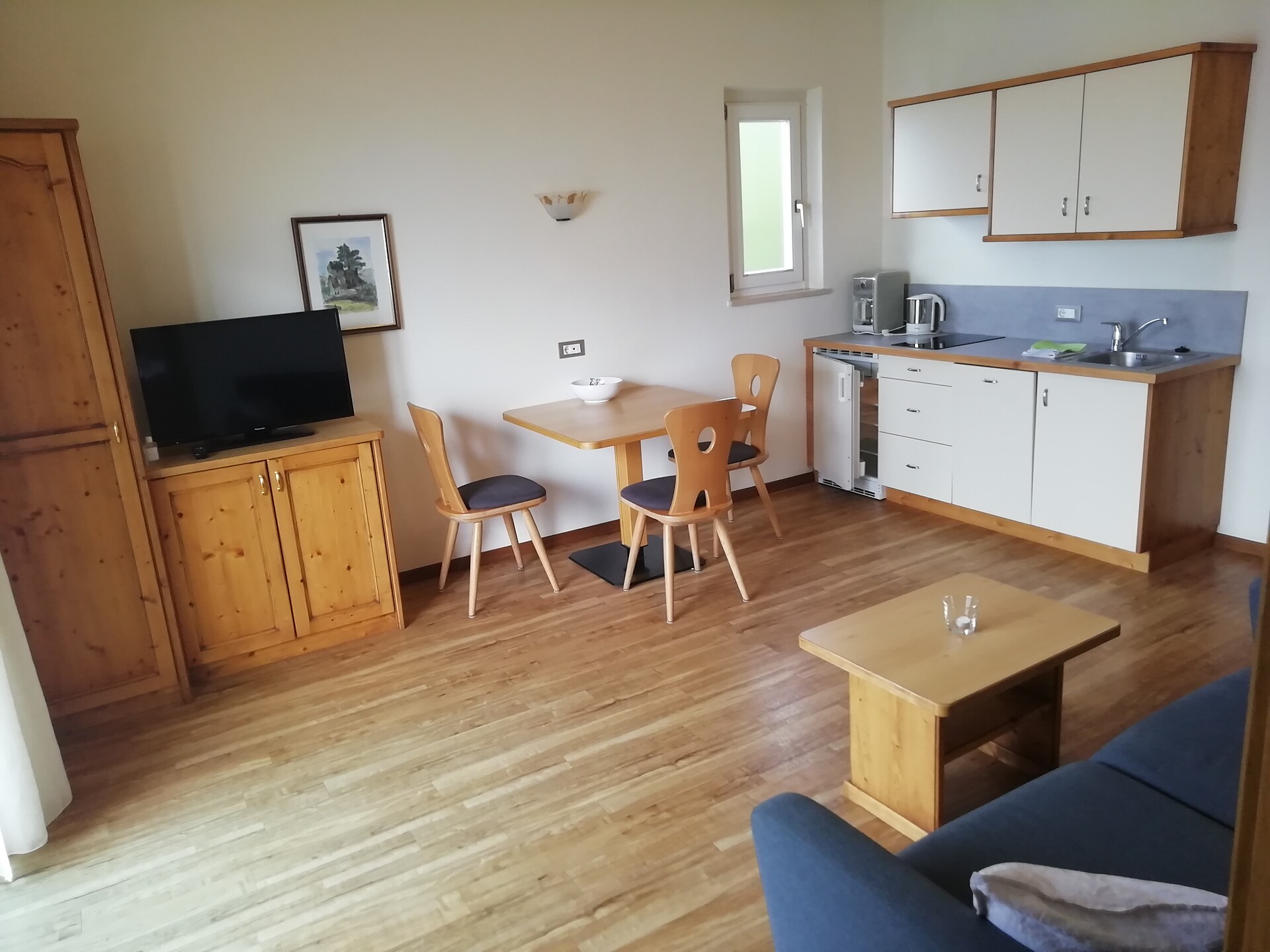Doppelbett, Doppelschlafcouch, Balkon, Bettwäsche vorhanden, Safe, Wohnküche, Kaffeemaschine, Elektroherd, Geschirrausstattung, Dusche/Bad, Bidet, Haarfön, Badetücher, TV, Satellit/Kabel, Internetanschluss, Reinigung auf Anfrage, Haupthaus, Südseite