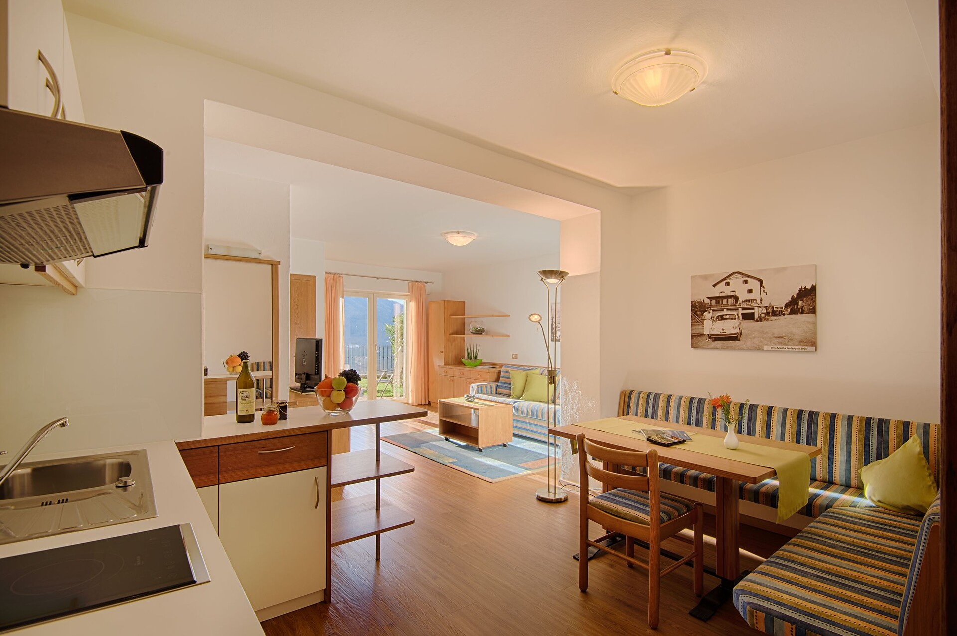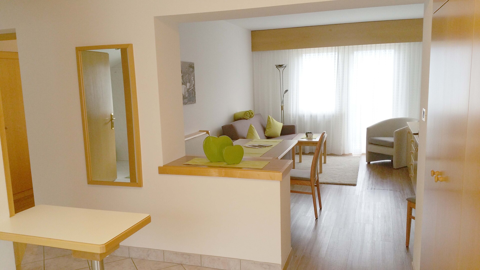 Unsere fünf Appartements sind geräumig hell und komfortabel eingerichtet. Sie verfügen über ein Doppelzimmer, großen Wohnraum mit ausziehbarer Couch, SAT-TV, Radio und Safe. Komplett eingerichtete Kochnische mit Kühlschrank, 2er Kochplatte, Kaffeemaschine und Geschirrspülmaschine, Geschirr, Besteck und Geschirrtücher.