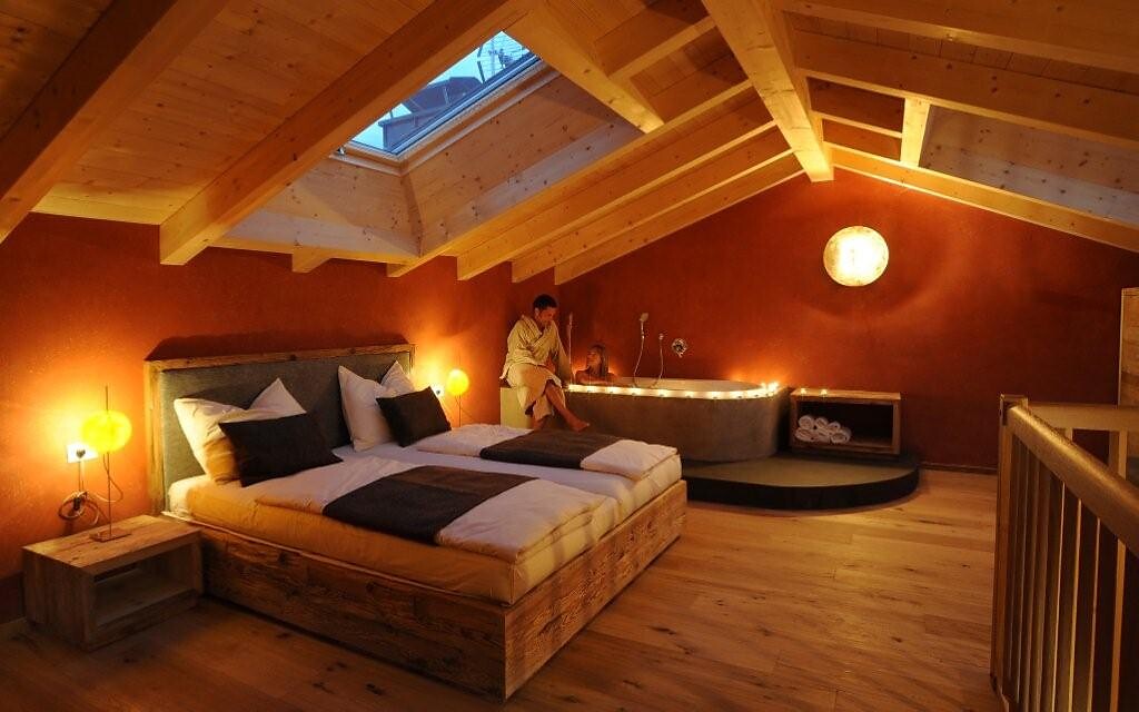 In warmem Rostrot und im Schlafzimmer mit einem Luxusbad ausgestattet ist unsere Herbstliebe genau das Richtige für glückliche Momente im Leben zu zweit. Die Wohnsuite mit offener Galerie bietet auf zwei Etagen und 49 m² Platz für 1 bis 2 Personen.