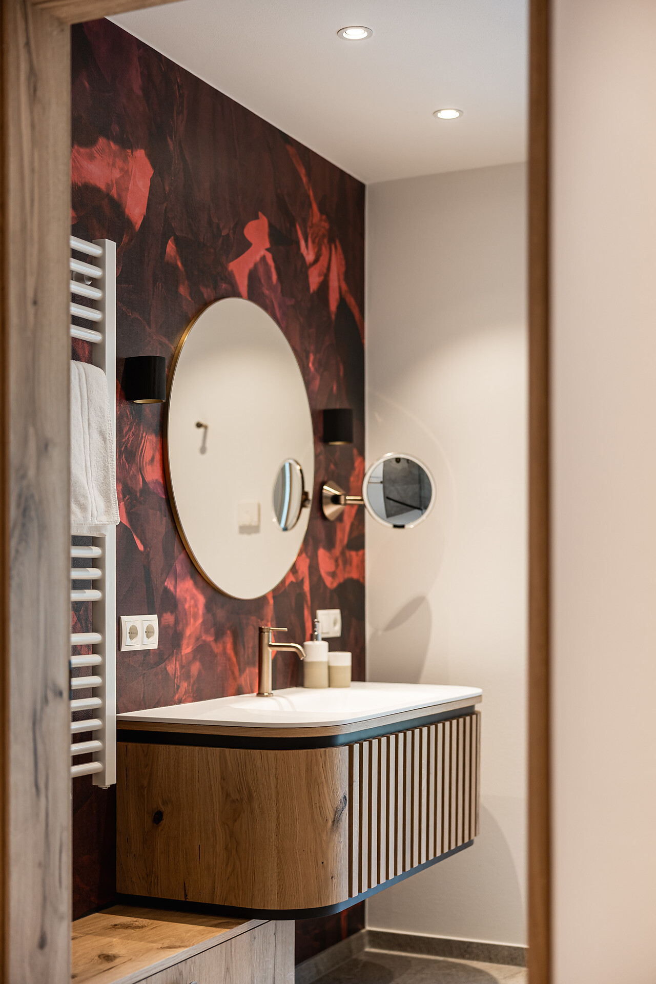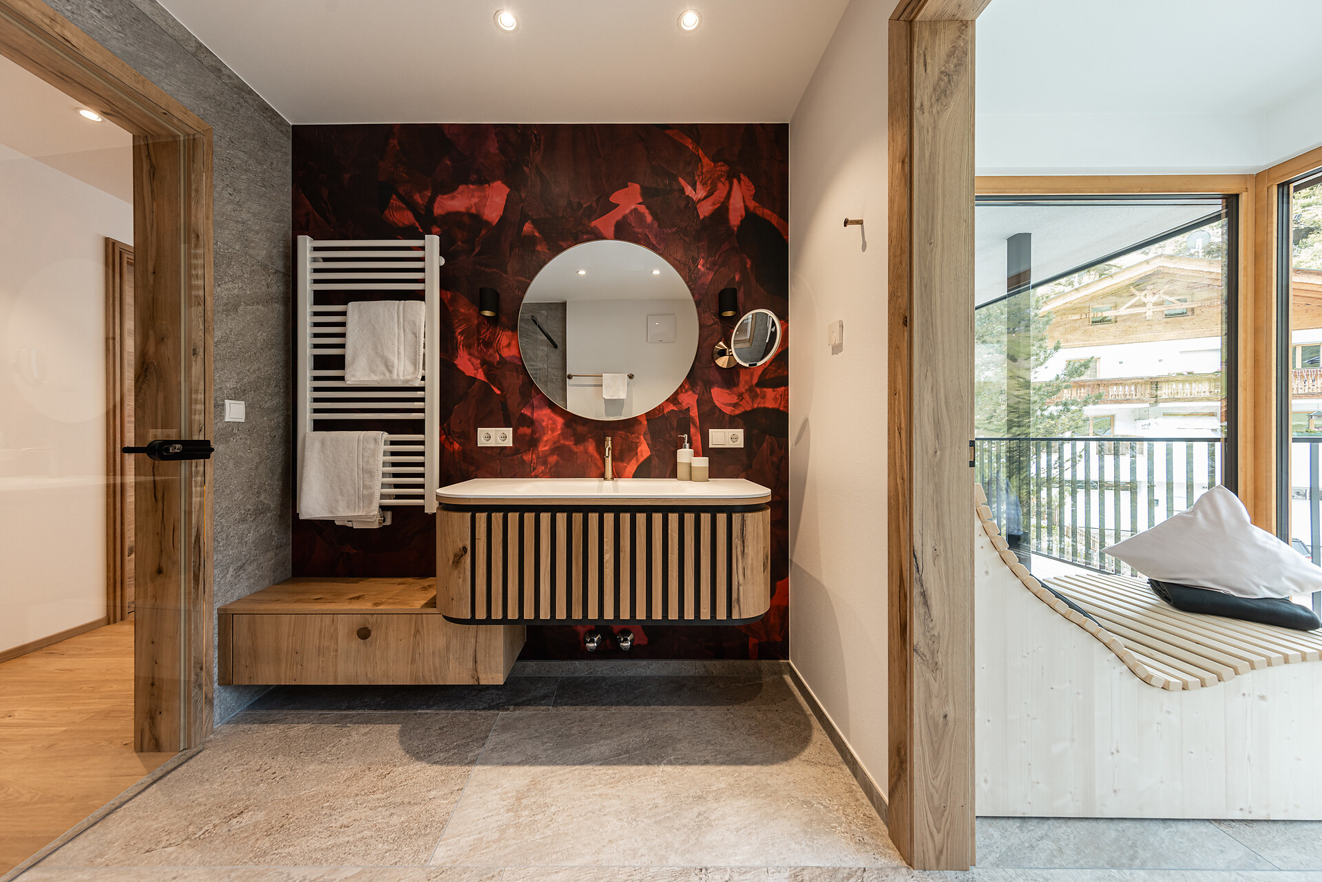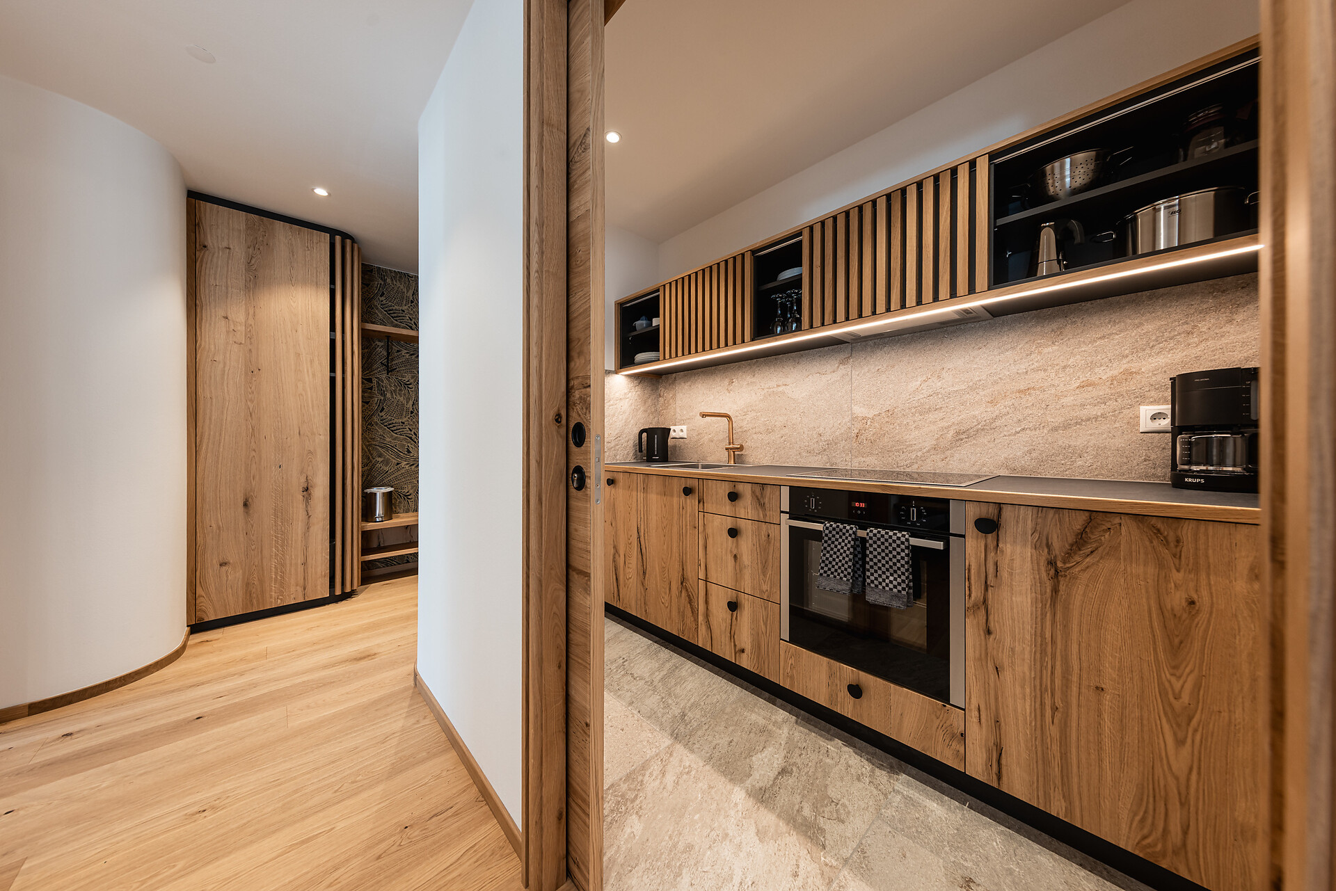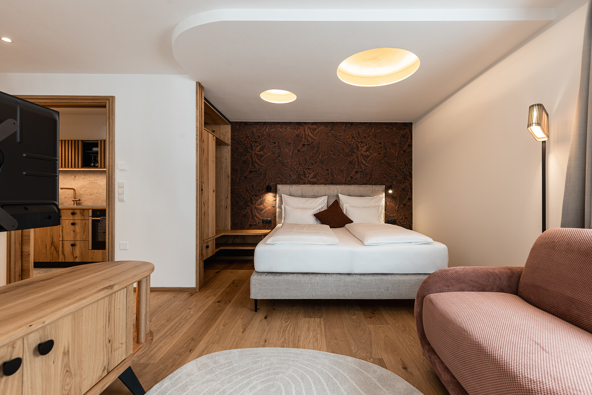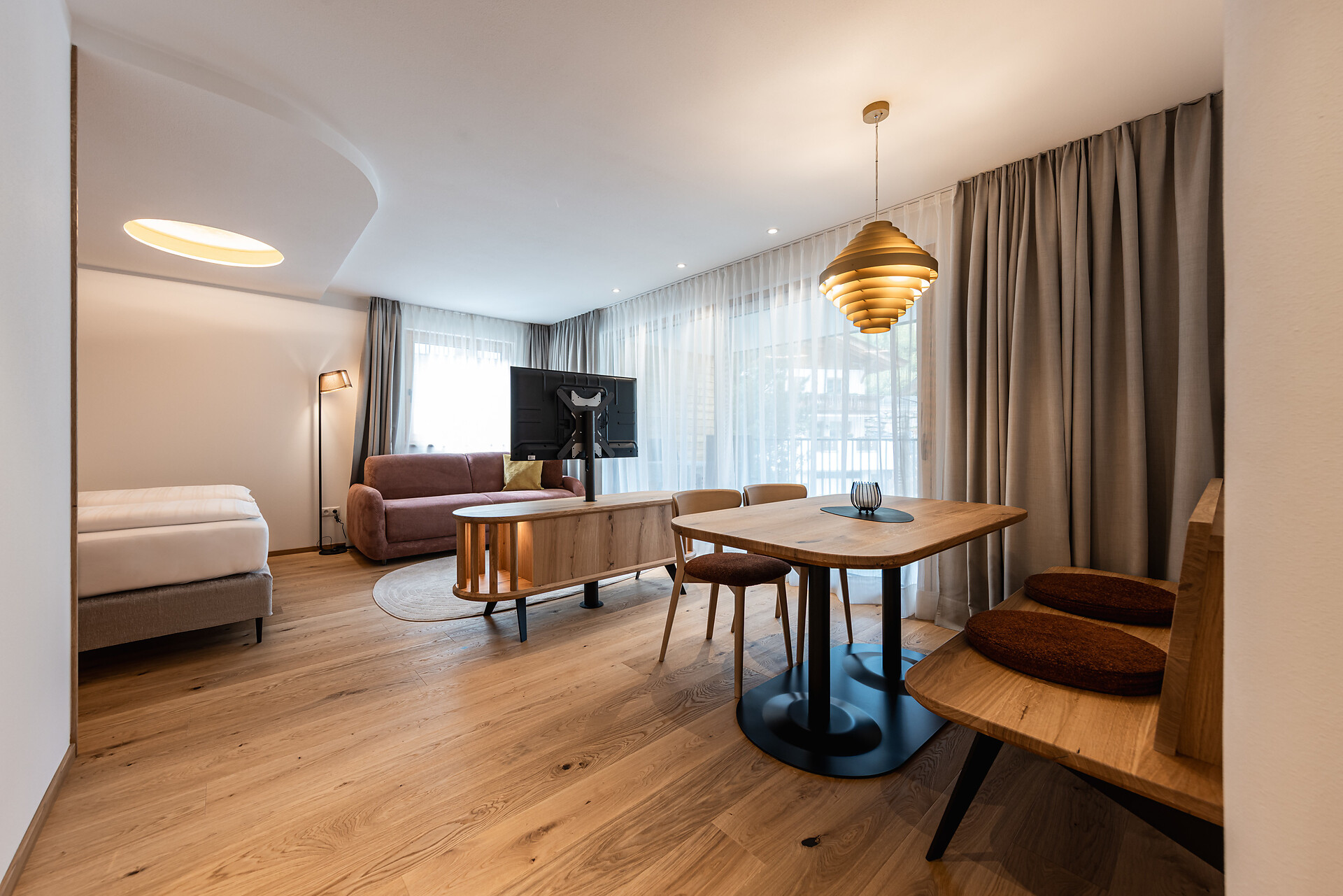 NEW - ab Juli 2025 - Die großzügige Alpin-Relax Suite bietet auf 45 m² Platz für 2 bis 4 Personen und besticht durch ihr edles Eichenholz-Design. Der Wohn-Schlafraum ist mit einem gemütlichen Doppelbett, einer Doppelschlafcouch und einer komfortablen Sitzgelegenheit mit Flachbildschirm ausgestattet – perfekt zum Entspannen nach einem aktiven Tag in den Bergen. Die abtrennbare Küche lässt keine Wünsche offen: Sie ist mit einer Filterkaffeemaschine, einem Glaskeramikkochfeld, einer Geschirrspülmaschine, einem Backofen-Mikrowellenherd, einem Kühlschrank mit Gefrierfach sowie auf Wunsch einem Toaster ausgestattet. So können Sie sich Ihre Mahlzeiten ganz nach Belieben zubereiten. Das moderne Badezimmer überzeugt mit einer komfortablen Dusche, einem Bidet und einem Föhn. Zusätzlich verfügt die Suite über einen Hoteltresor und eine individuell einstellbare Fußbodenheizung für höchsten Komfort. Das Highlight der Suite ist zweifelsohne die Terrasse, von der aus Sie eine atemberaubende Aussicht auf die umliegende Bergwelt genießen können. Ein weiterer besonderer Anziehungspunkt ist der Glaskubus mit zwei Infrarotliegen, der direkt vom Badezimmer aus zugänglich ist – der perfekte Ort, um nach einem aktiven Tag zu entspannen und neue Energie zu tanken.
