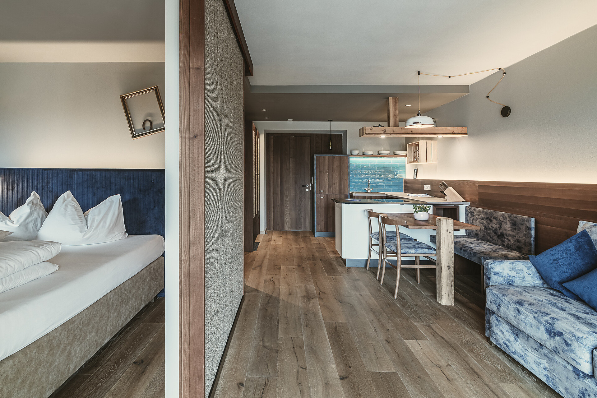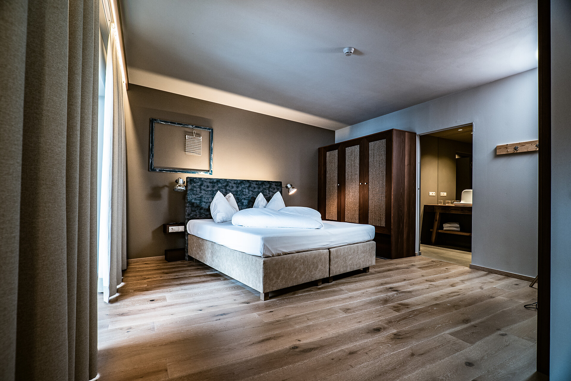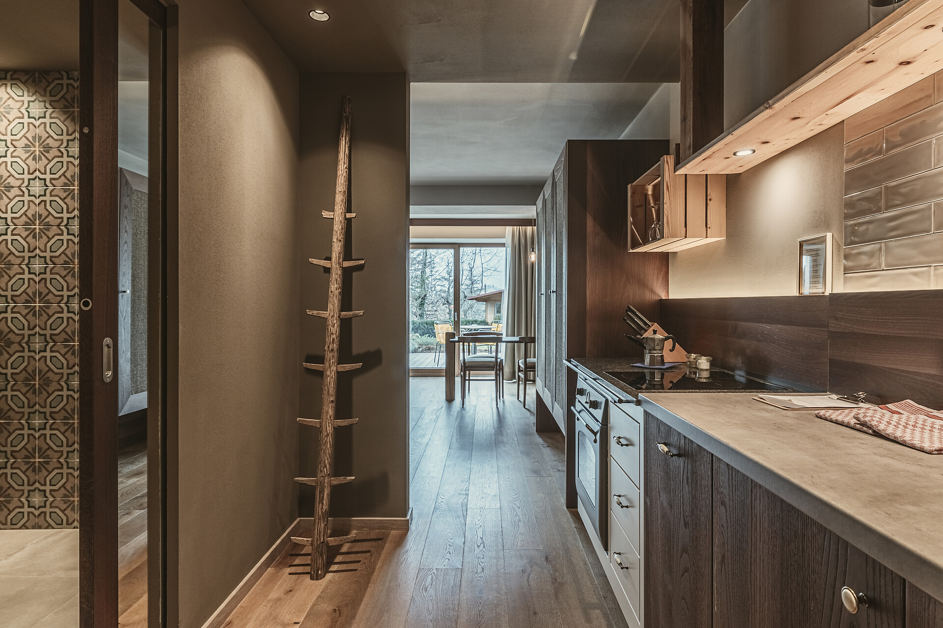 Im neuen Garni Hosler. 2 Schlafzimmer, 2 Bäder, 1 Wohnraum mit vollausgestatter Küche und Schlafsofa (mit Lattenrost und hochwertiger Matratze), Rooftop-Terrasse mit Kräuterbeet & privaten Plansch-Pottich. Im letzten Stock, mit erquickendem Bergblick. Plansch Plansch.