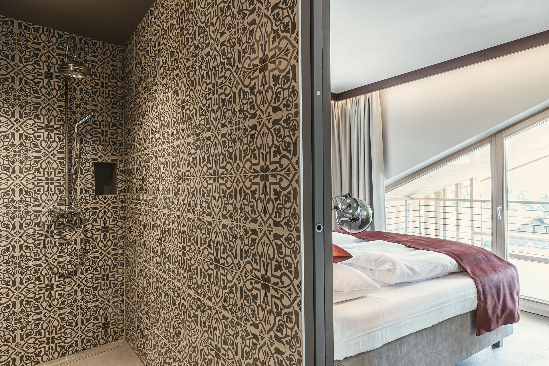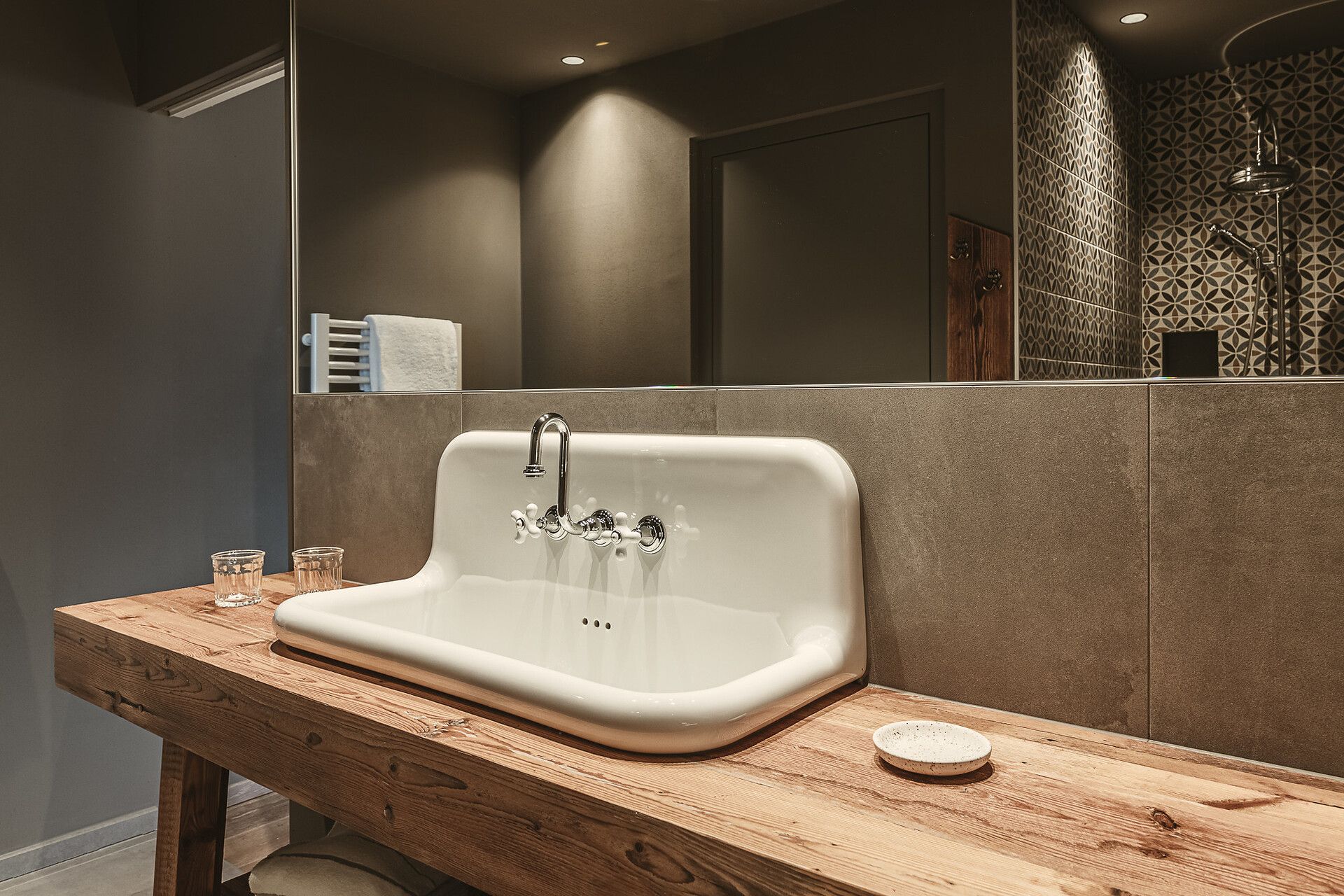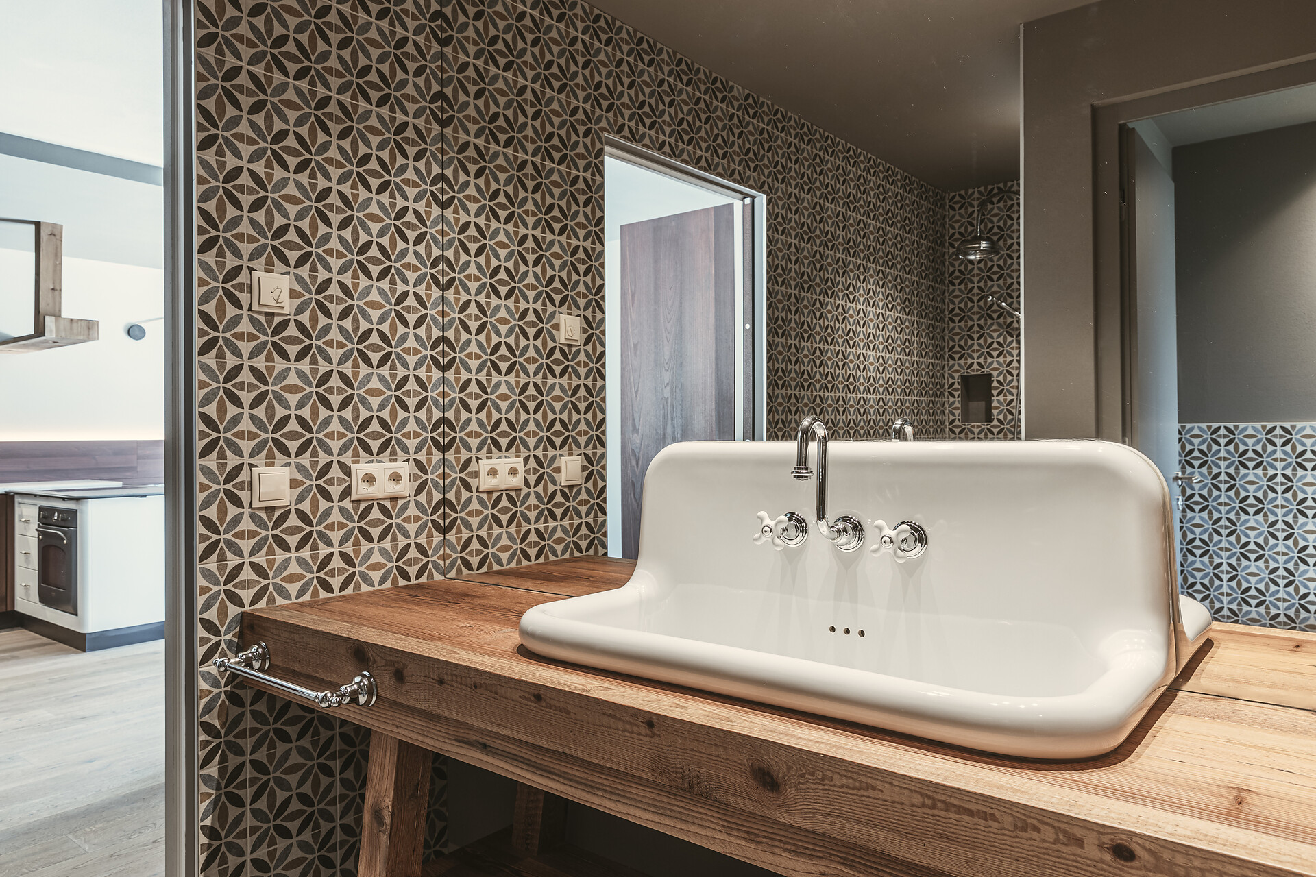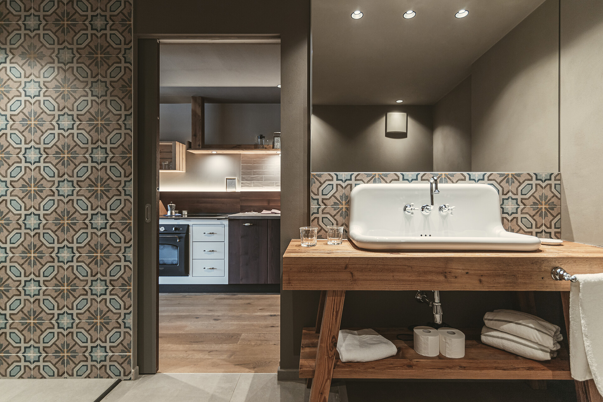 Im neuen Garni Hosler. 2 Schlafzimmer, 2 Bäder, 1 Wohnraum mit vollausgestatter Küche und Schlafsofa (mit Lattenrost und hochwertiger Matratze), Rooftop-Terrasse mit Kräuterbeet & privaten Plansch-Pottich. Im letzten Stock, mit erquickendem Bergblick. Plansch Plansch.