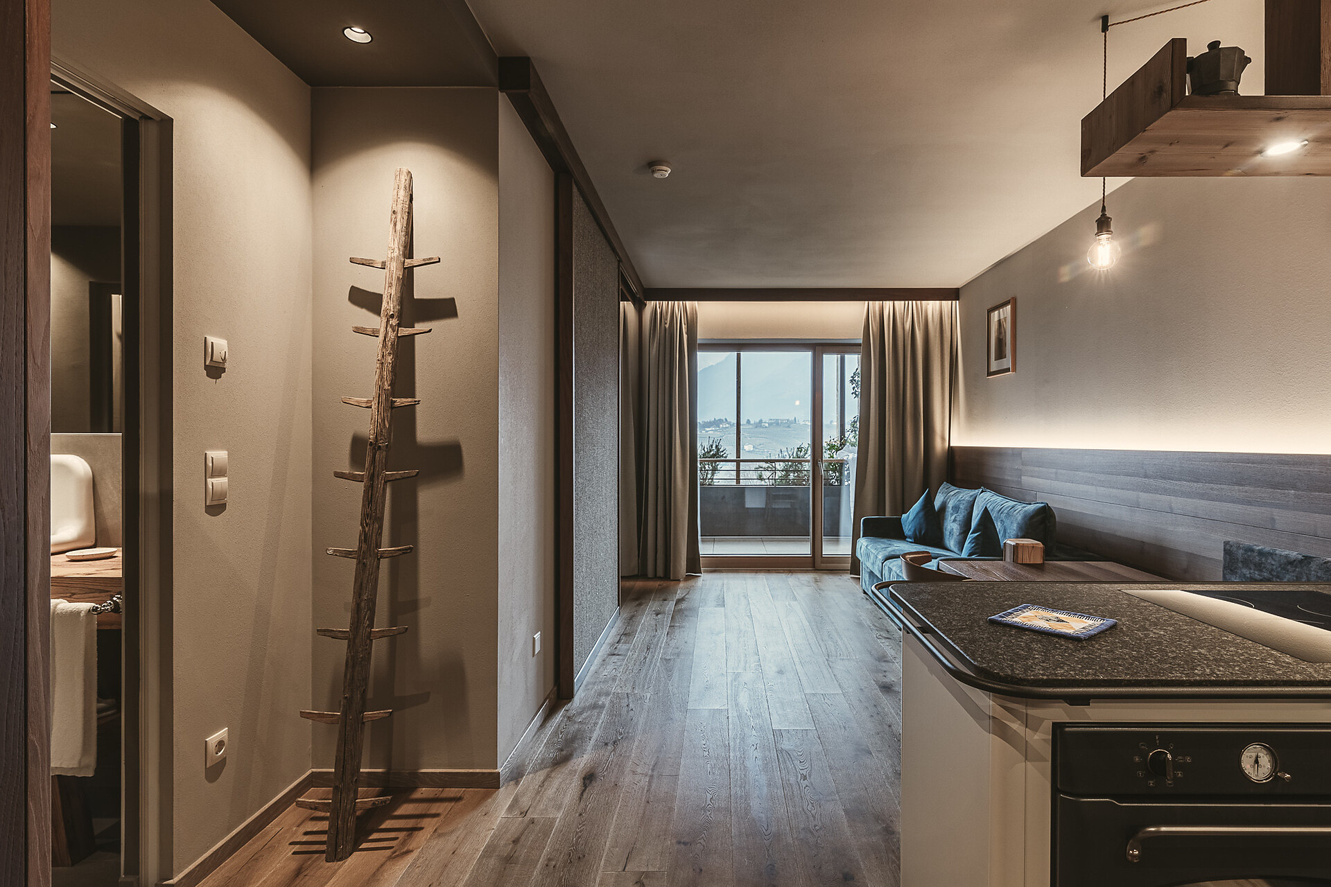Im neuen Garni Hosler. 1 Schlafzimmer mit Wohnraum & vollausgestatteter Küche, 1 Bad & Balkon. Eine schnuckeliges Liebesnest für Zeit zu Zweit mit Blickrichtung auf Meran 2000 (ostseitig)
