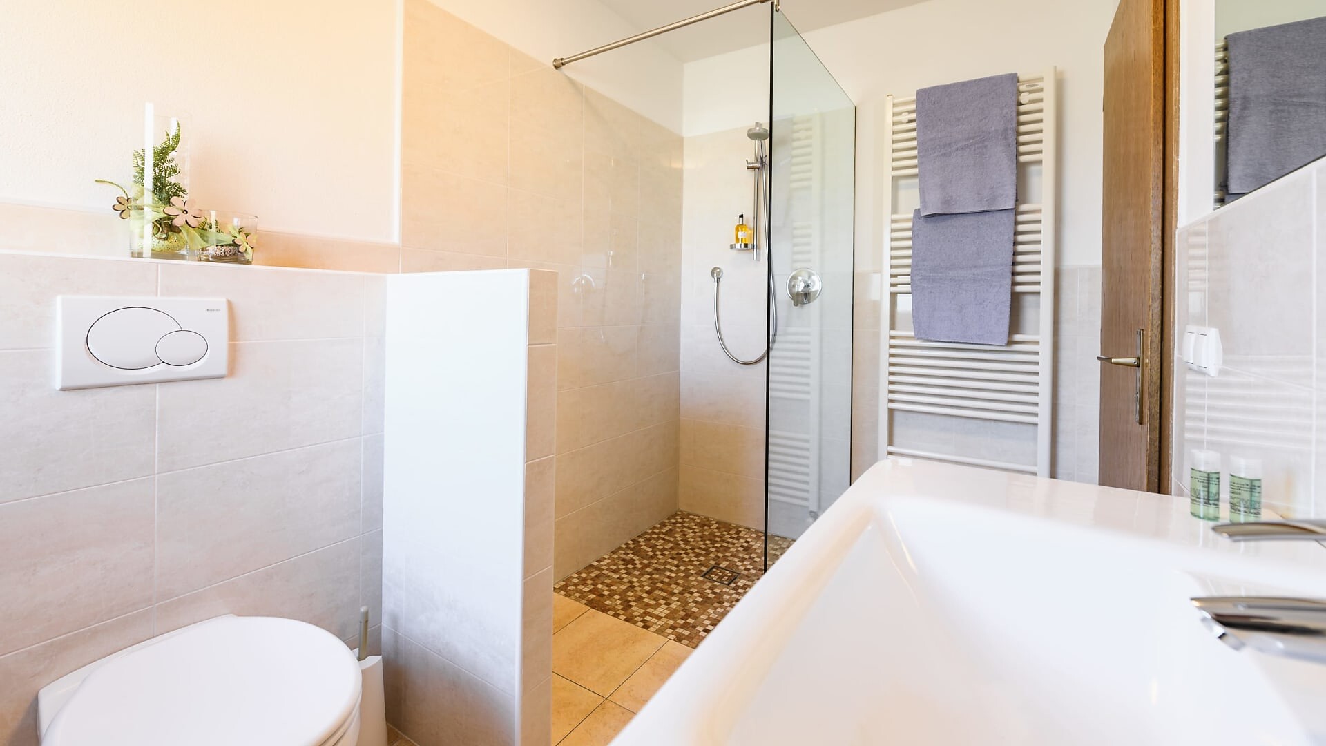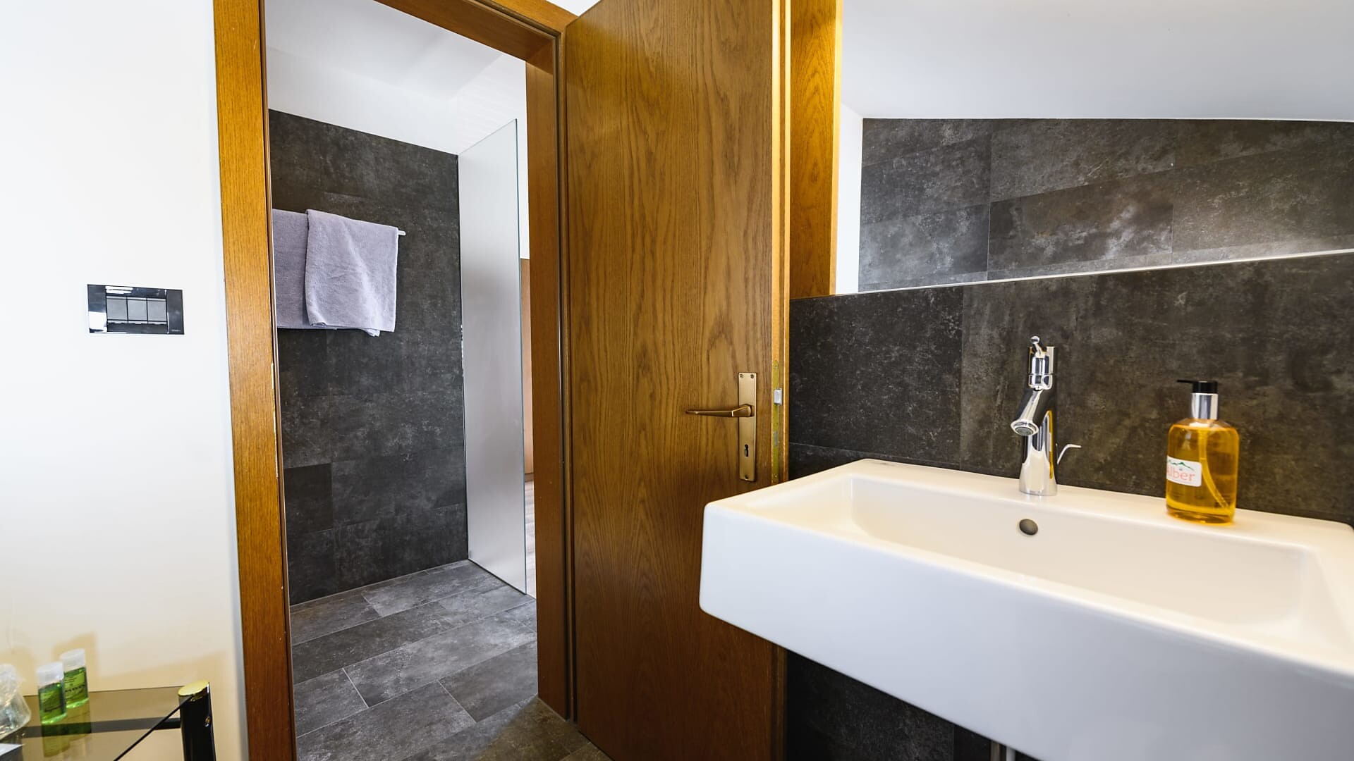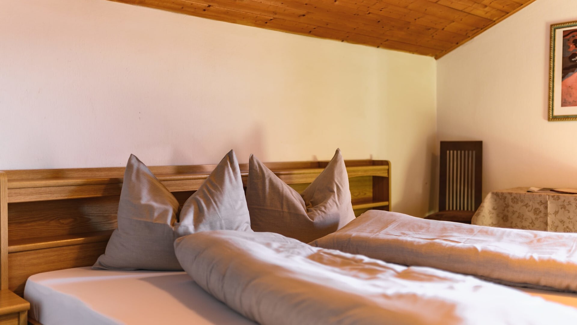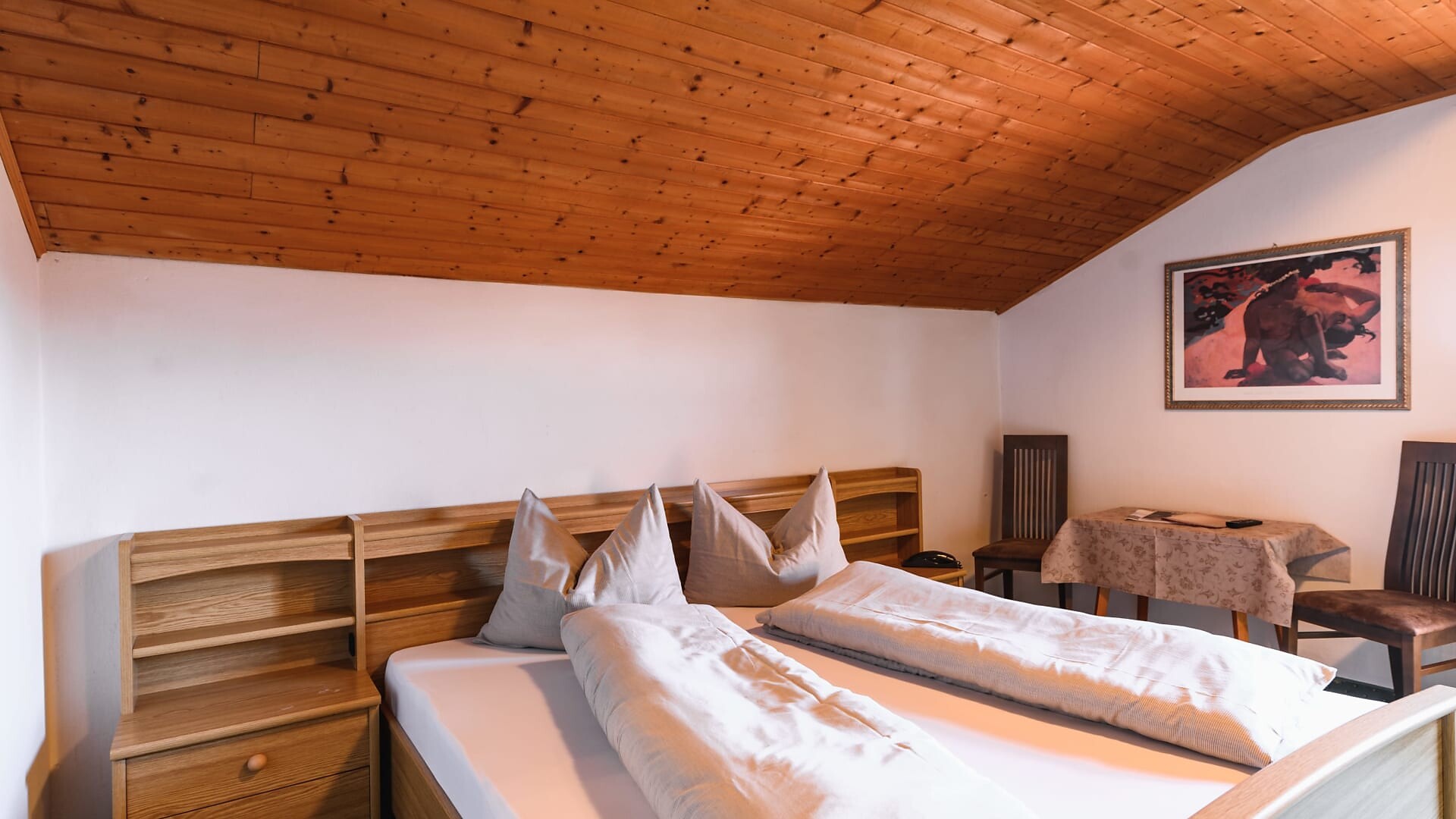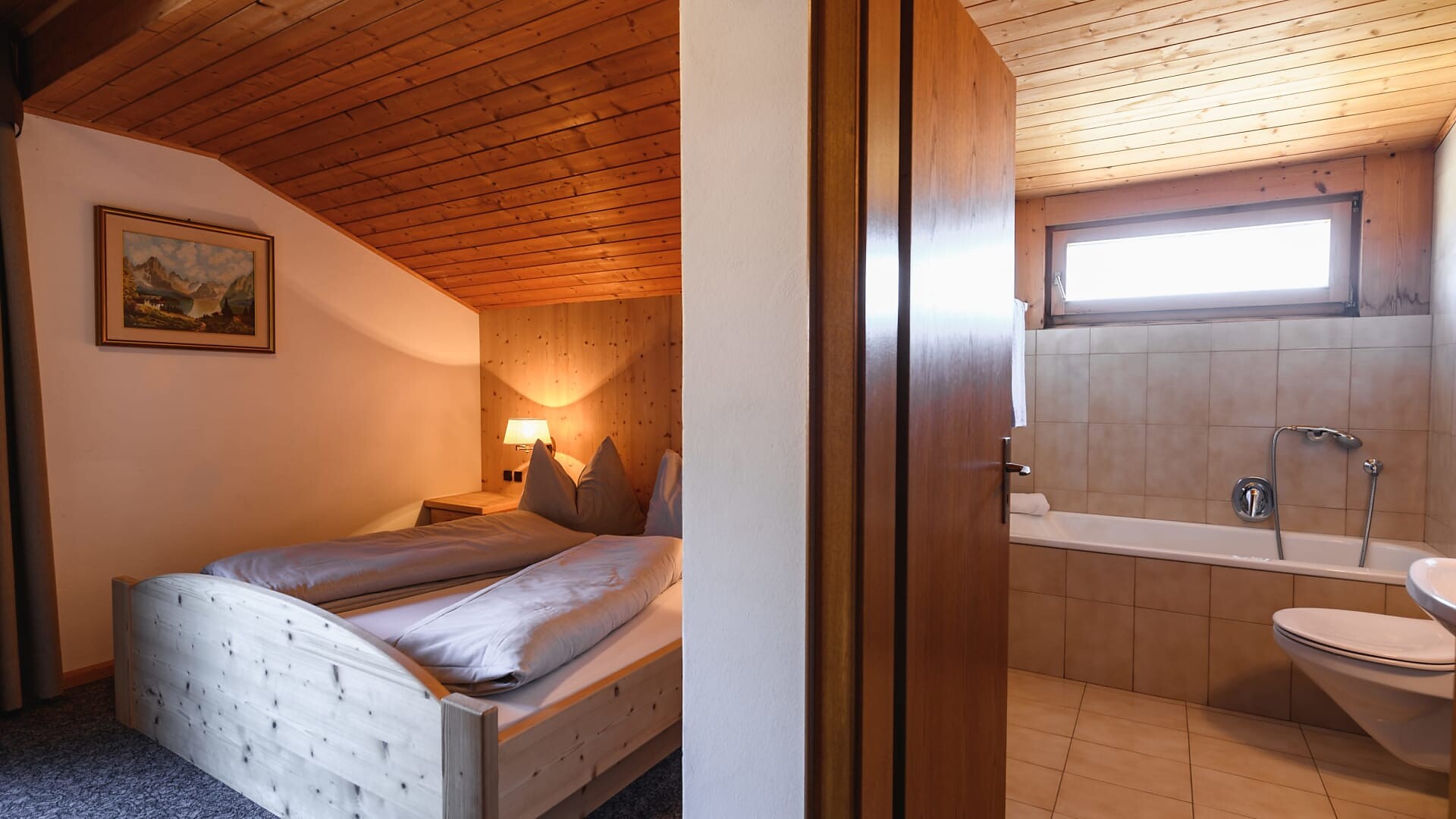 Renoviertes Doppelzimmer, neues Doppelbett, Holzboden, renoviertes Bad mit Dusche und WC, Fernseher und Südbalkon