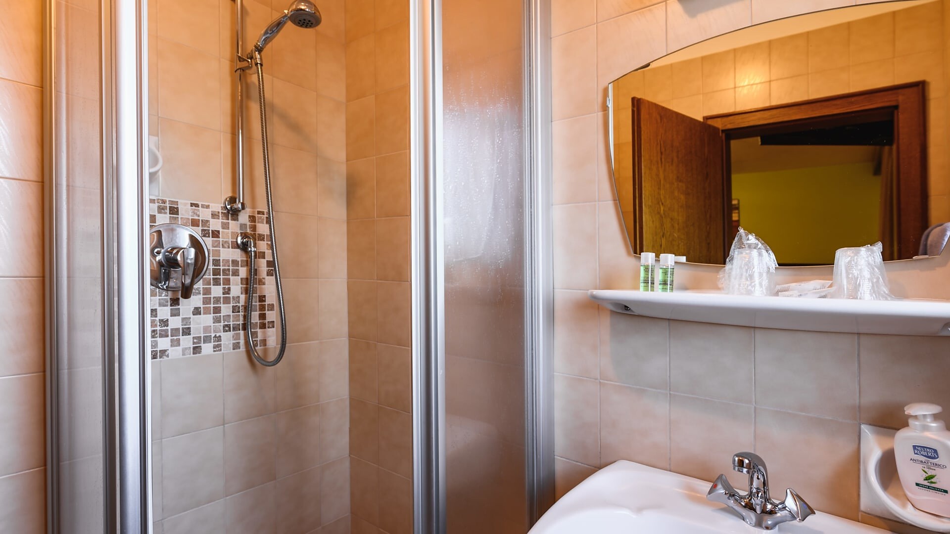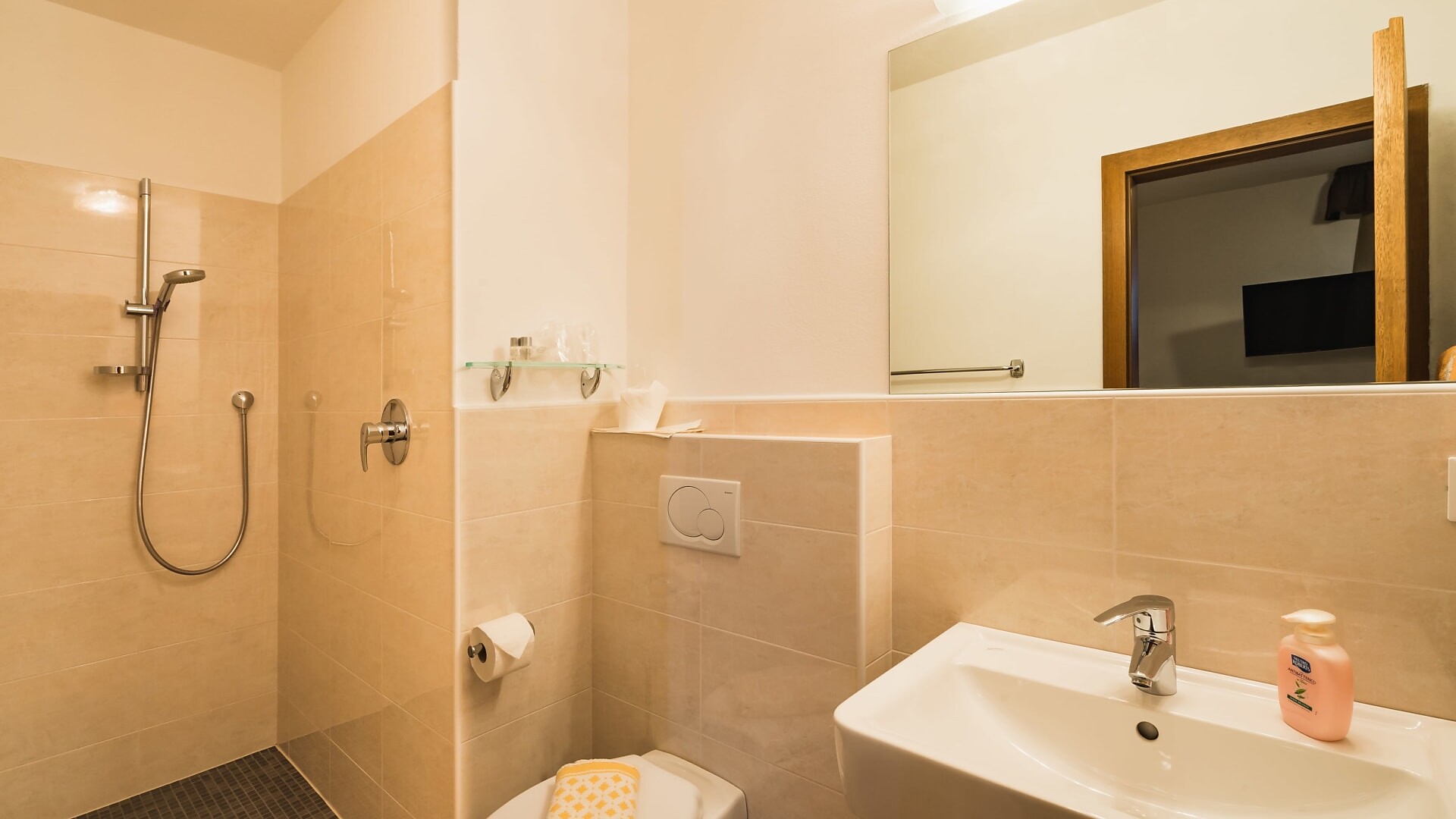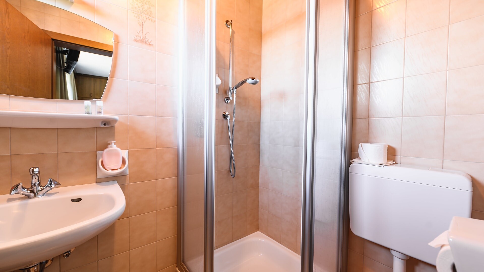 Renoviertes Doppelzimmer, neuer Holzboden, noch nicht renoviertes Badezimmer mit Dusche und WC, Fernseher, Nordbalkon