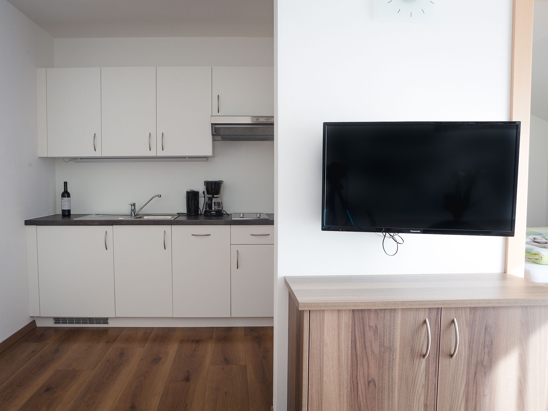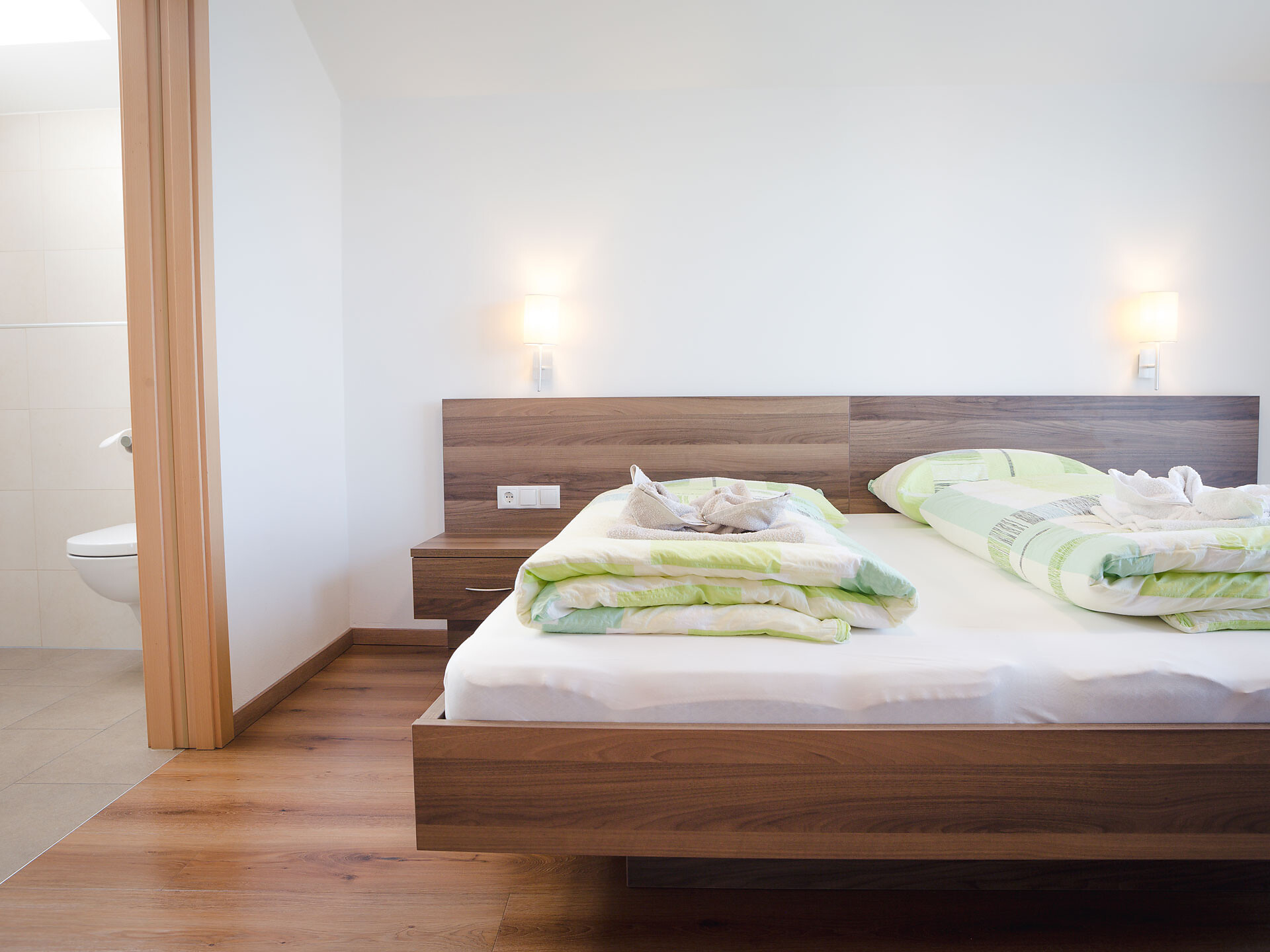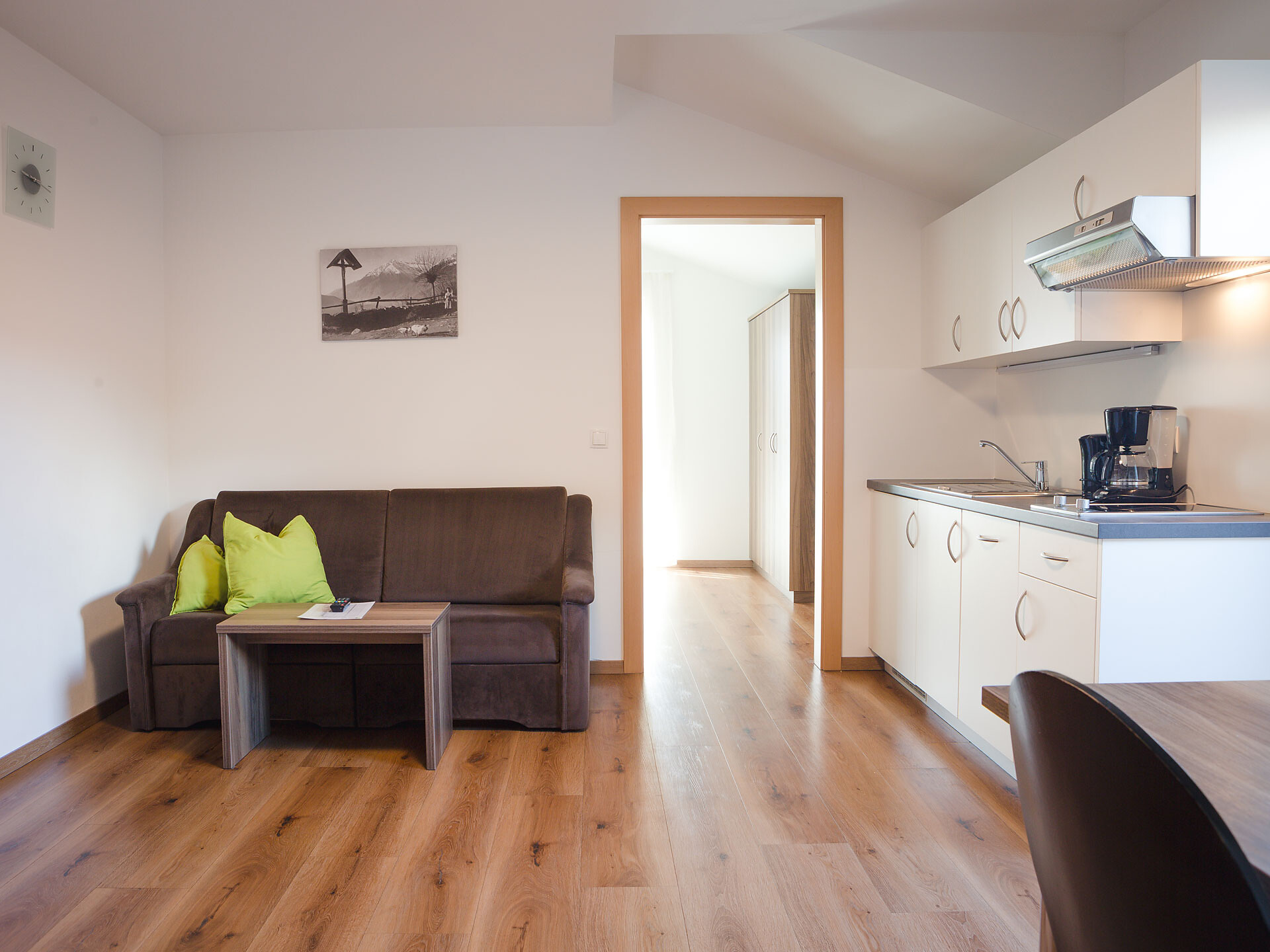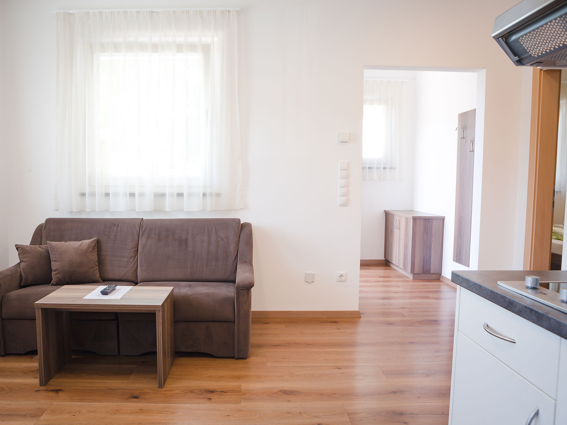 The Type A holiday apartment is on the 2nd floor and has a combined kitchen / living room, a separate bedroom with a double bed and wardrobe with integrated safe, plus a bathroom with accessible shower, hair dryer and WC. In the combined kitchen / living room there is a fully equipped kitchenette with an electric cooker, coffee machine, kettle and dishwasher. A small dining area, a closet and a double bed settee are also part of the combined kitchen / living room. There is, of course, a flat-screen TV with satellite connection. There is also a furnished south and west-facing balcony, a small clothes drying rack, bed linen, towels, free wireless internet access plus a vacuum cleaner. The holiday apartment is suitable for allergy sufferers. Smoking is forbidden in all of the holiday apartments. A cot and high chair are available on request.
