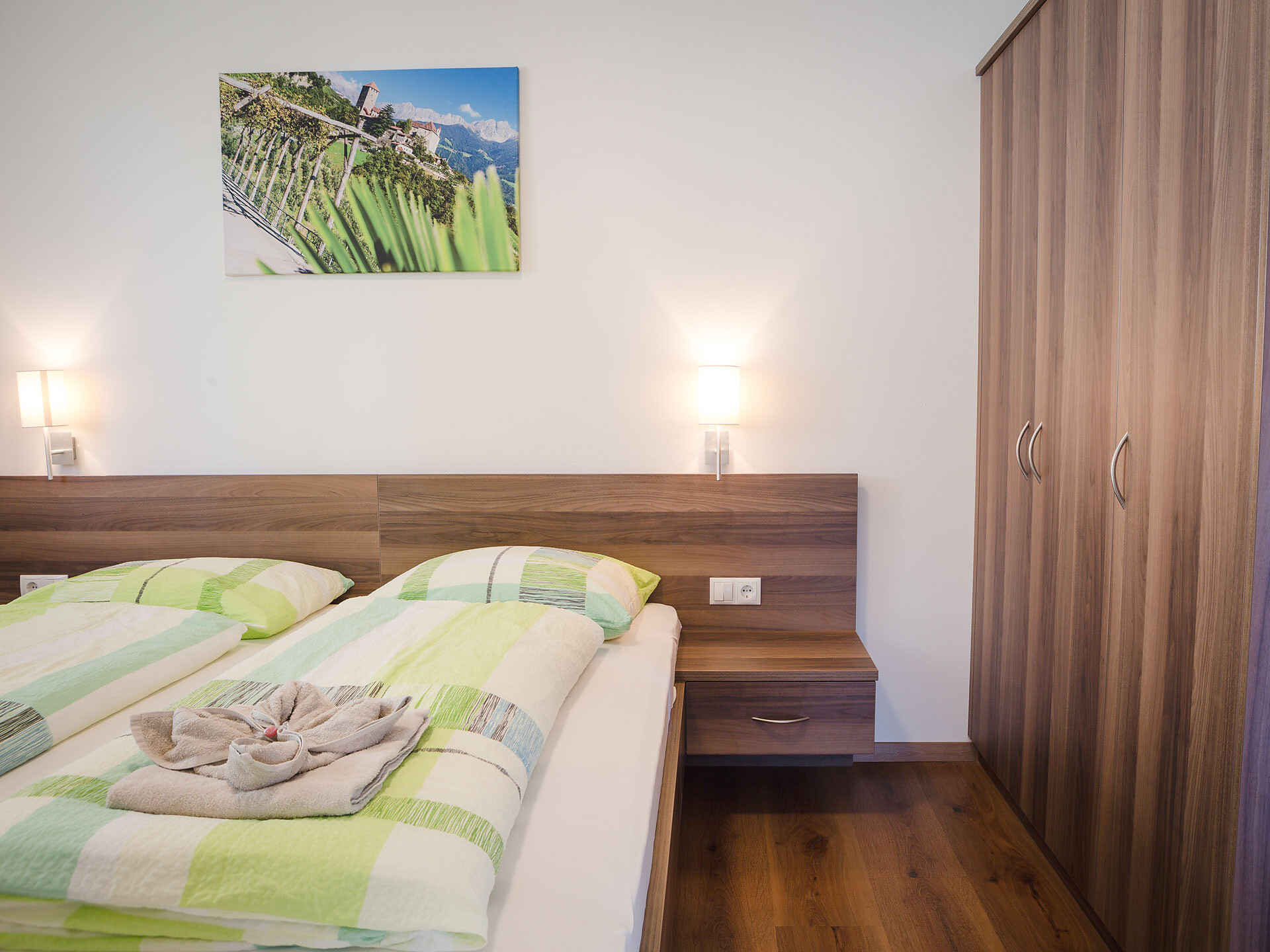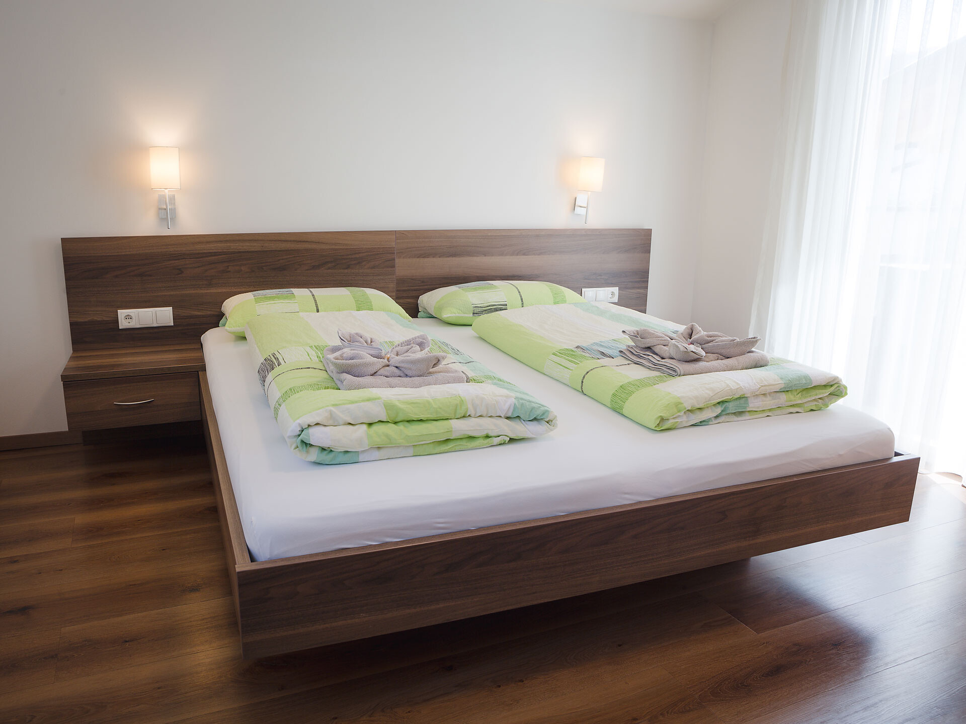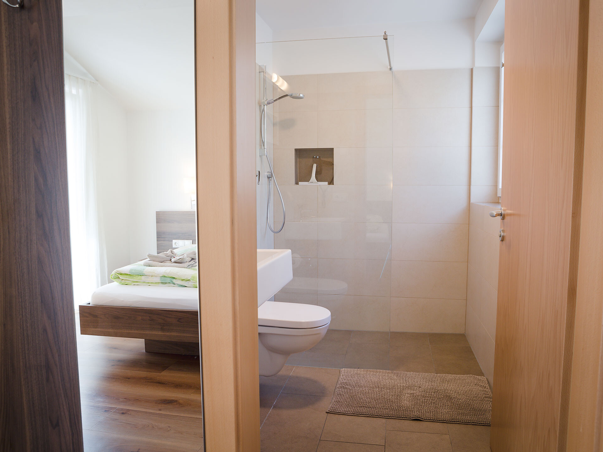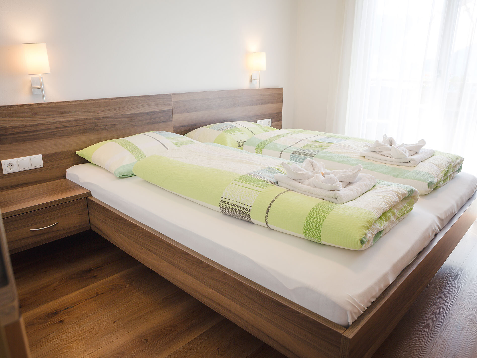 The Type A holiday apartment is on the 2nd floor and has a combined kitchen / living room, a separate bedroom with a double bed and wardrobe with integrated safe, plus a bathroom with accessible shower, hair dryer and WC. In the combined kitchen / living room there is a fully equipped kitchenette with an electric cooker, coffee machine, kettle and dishwasher. A small dining area, a closet and a double bed settee are also part of the combined kitchen / living room. There is, of course, a flat-screen TV with satellite connection. There is also a furnished south and west-facing balcony, a small clothes drying rack, bed linen, towels, free wireless internet access plus a vacuum cleaner. The holiday apartment is suitable for allergy sufferers. Smoking is forbidden in all of the holiday apartments. A cot and high chair are available on request.