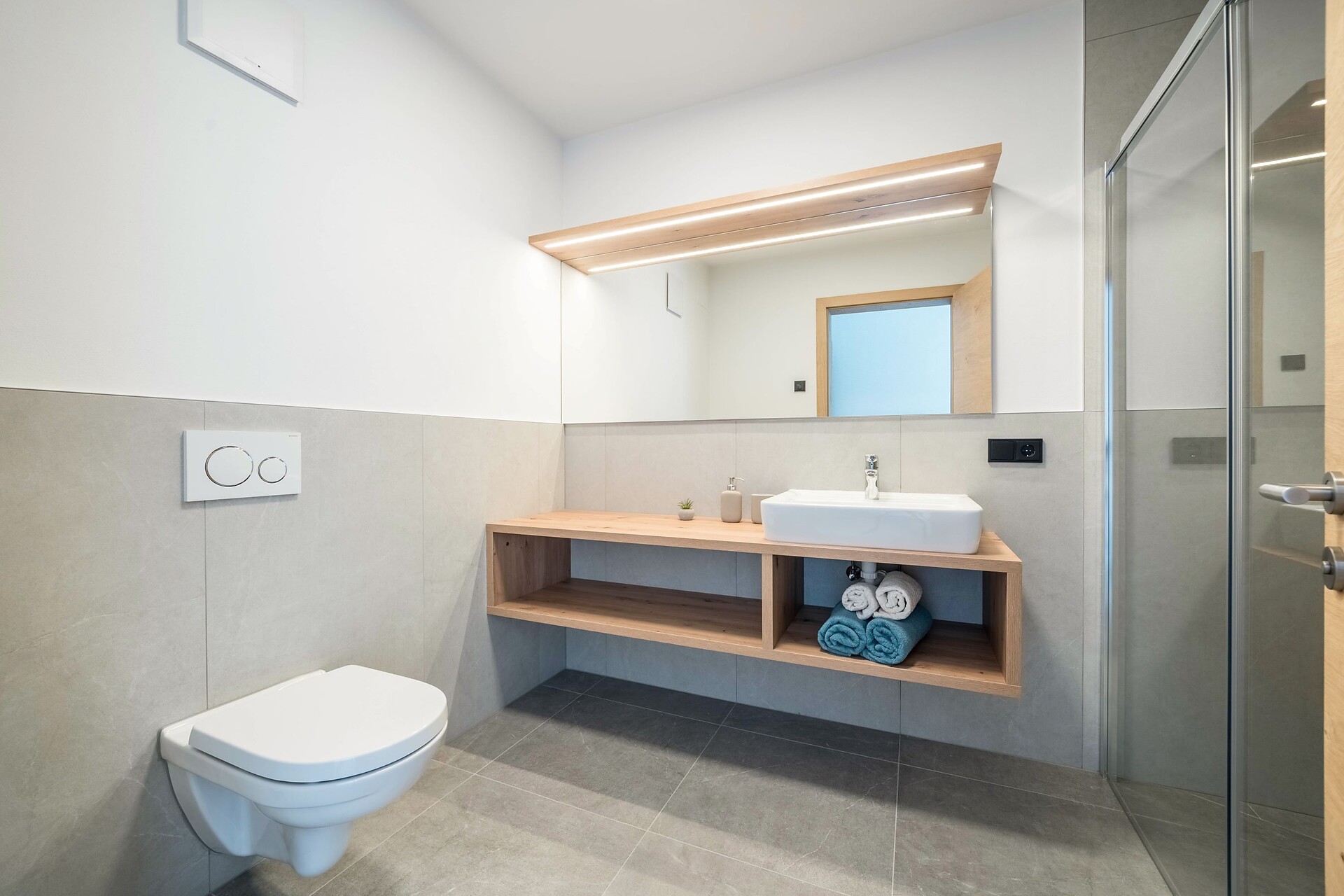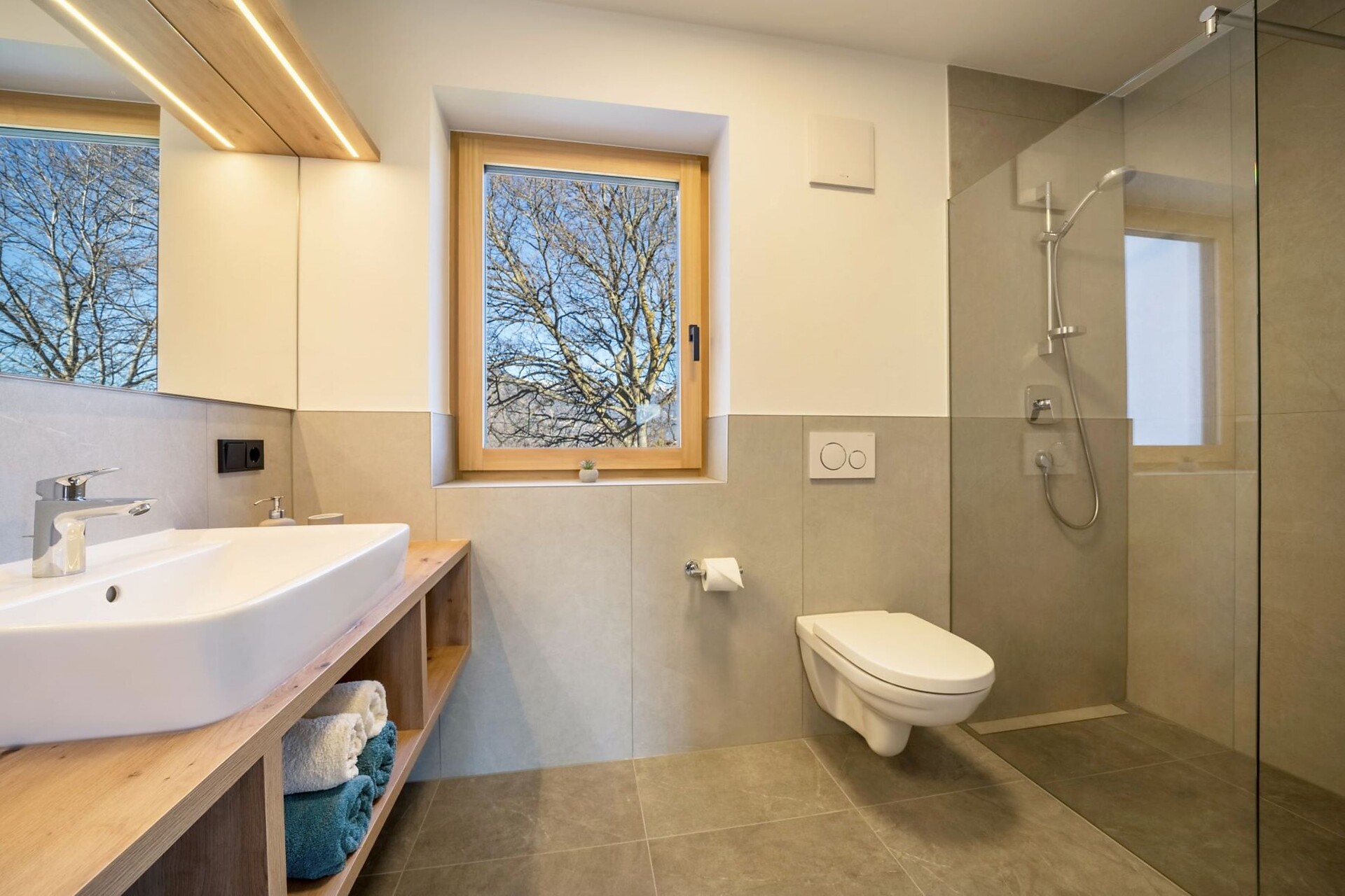 Light-flooded apartment with large windows and underfloor heating in all rooms. Bedroom with wooden floor, double bed and safe, living room with flat-screen satellite TV, comfortable couch and cozy dining table, fully equipped kitchenette with 4 hobs, dishwasher, sink, fridge with freezer compartment, coffee machine, kettle, crockery and cookware as well as various kitchen utensils. Modern bathroom with shower, WC, washbasin, hairdryer and hand and bath towels. Sunny balcony with a wonderful view of nature.