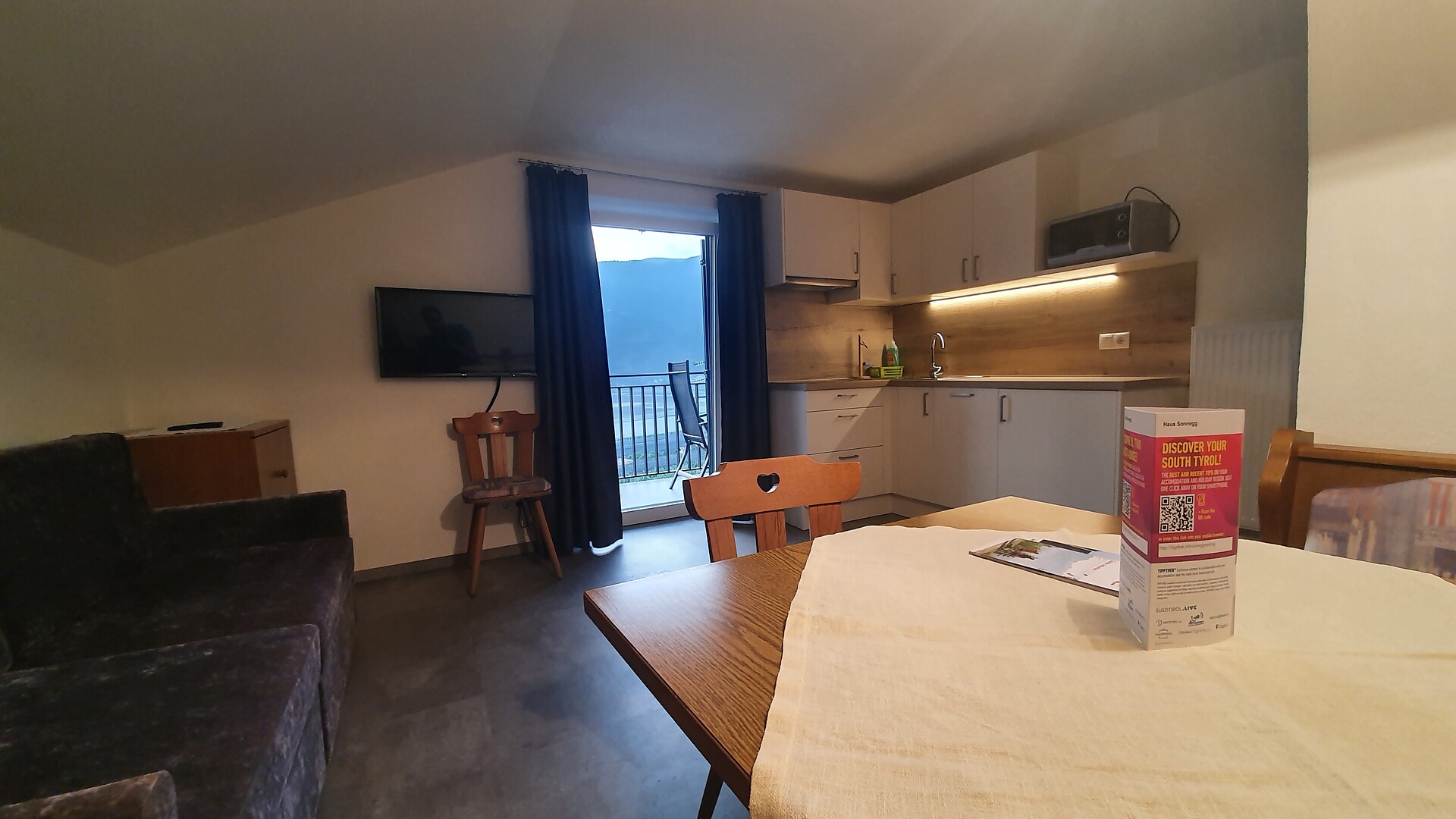 Double bed , Double sofa bed, Balcony, Terrace, Separate living area, Bed linen provided, Eat-in kitchen, Coffee machine, Dishwasher, Electric cooker, Cutlery provided, Hob, Water boiler, Oven, Shower/Bath tub, Hair dryer, Towels, TV, Satellite/Cable, WLAN, Final cleaning included, Main building, Panoramic view, South view