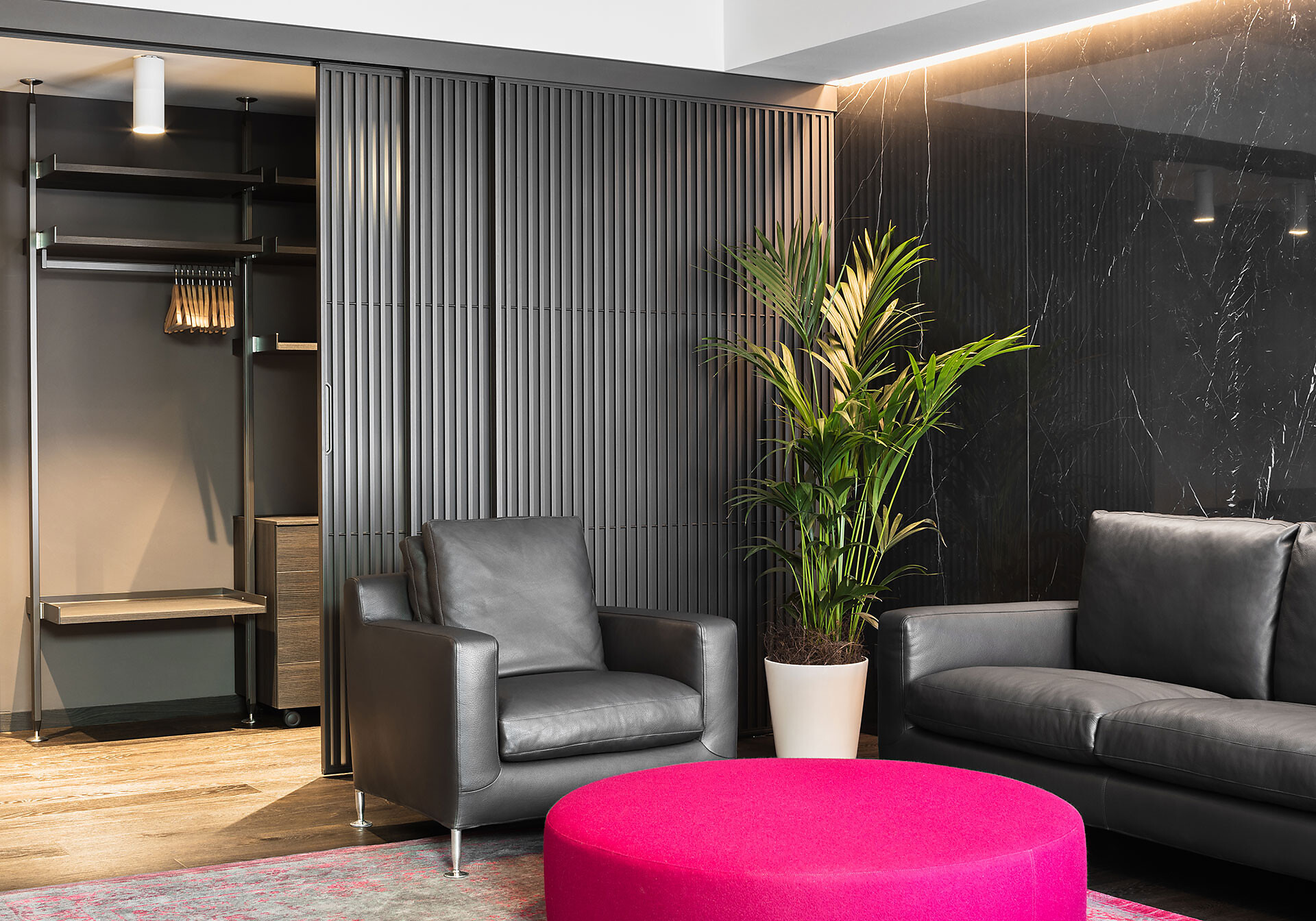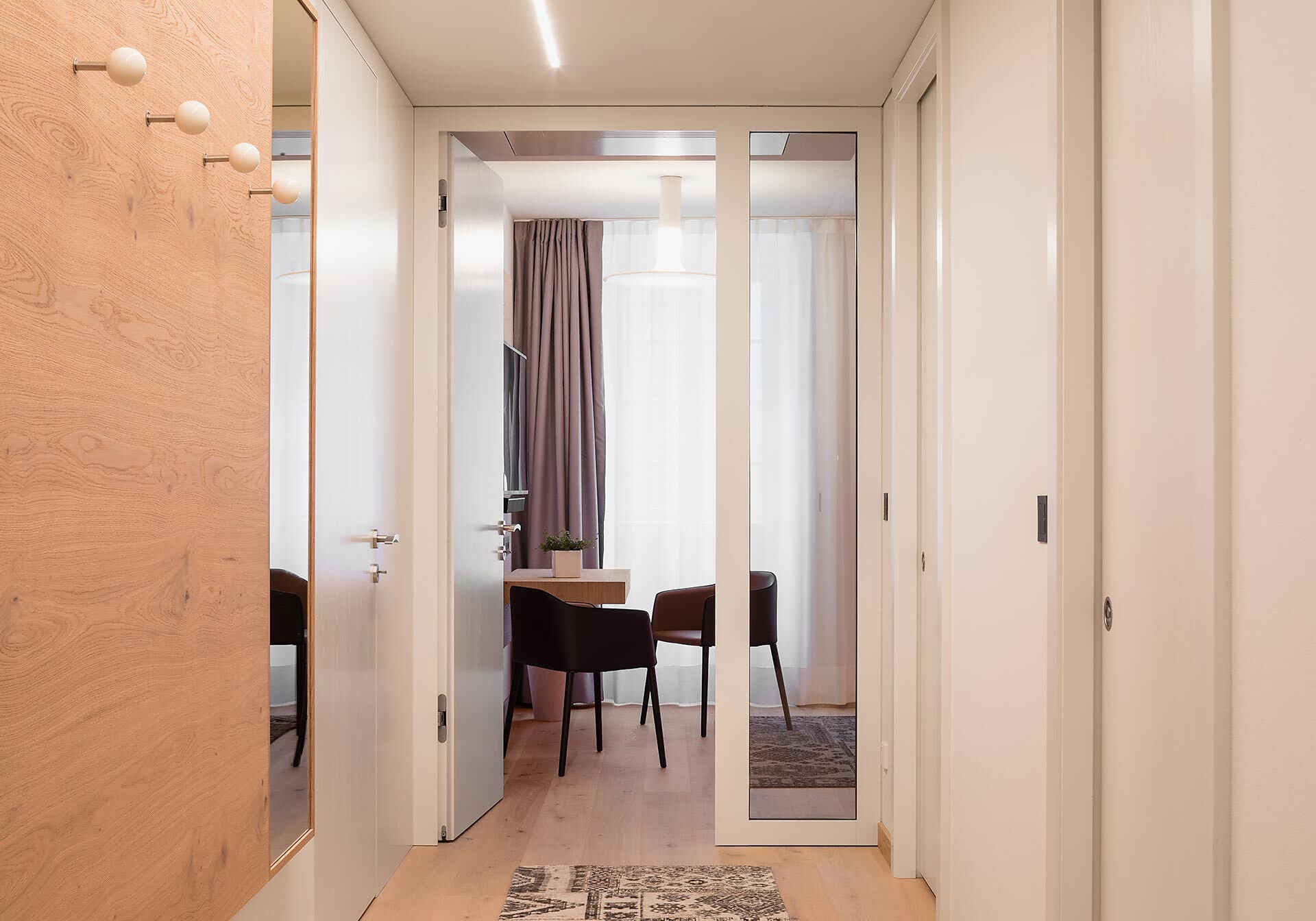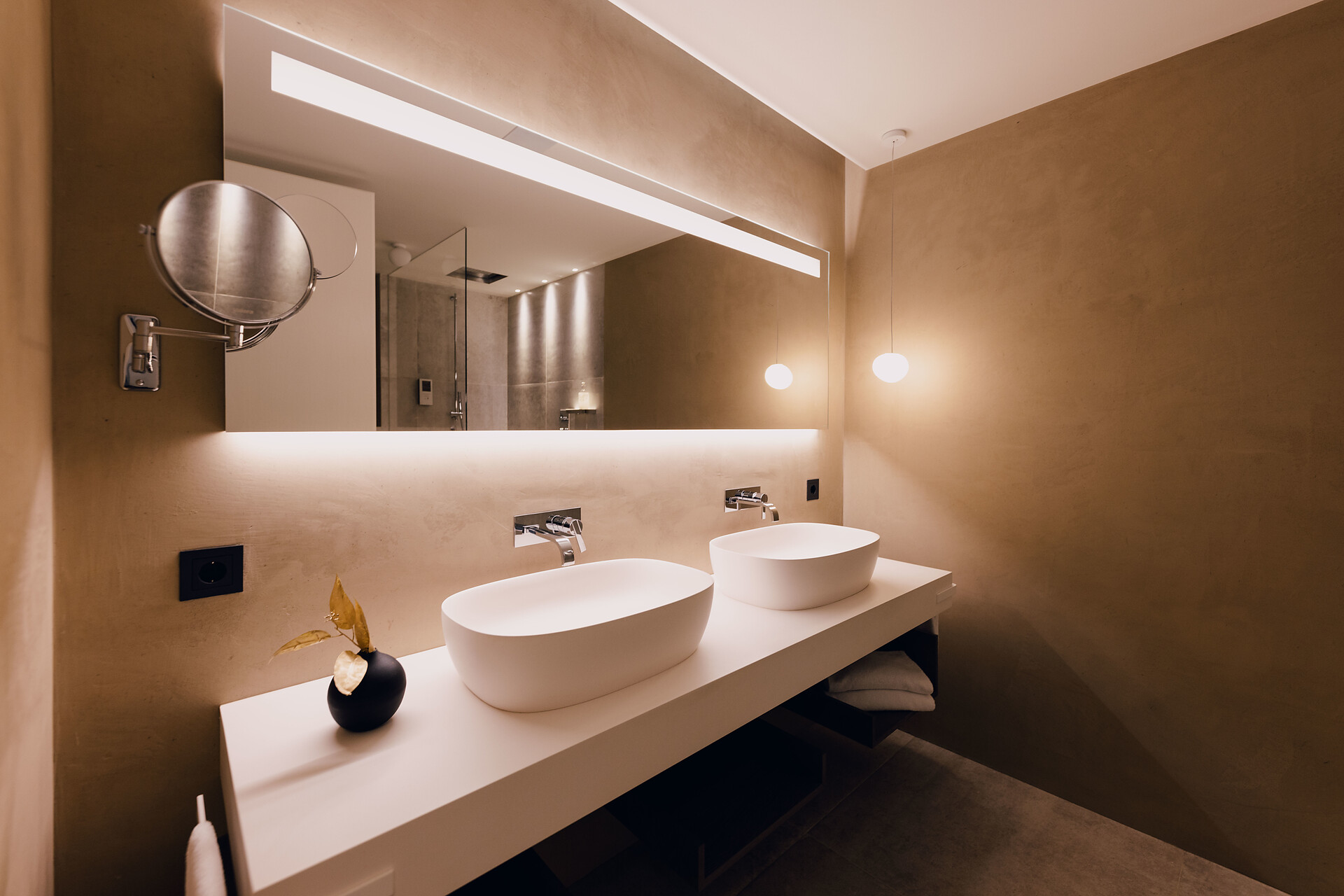 View towards Küchelberg and Tappeinerweg. Sleeping room with King Size bed, separate living room, large bathroom with shower, steam bath, bathtub and separate toilet. Cinema TV, hifi system, telephone, safe, fridge, Technogym hometrainer, wireless internet access and air conditioning.