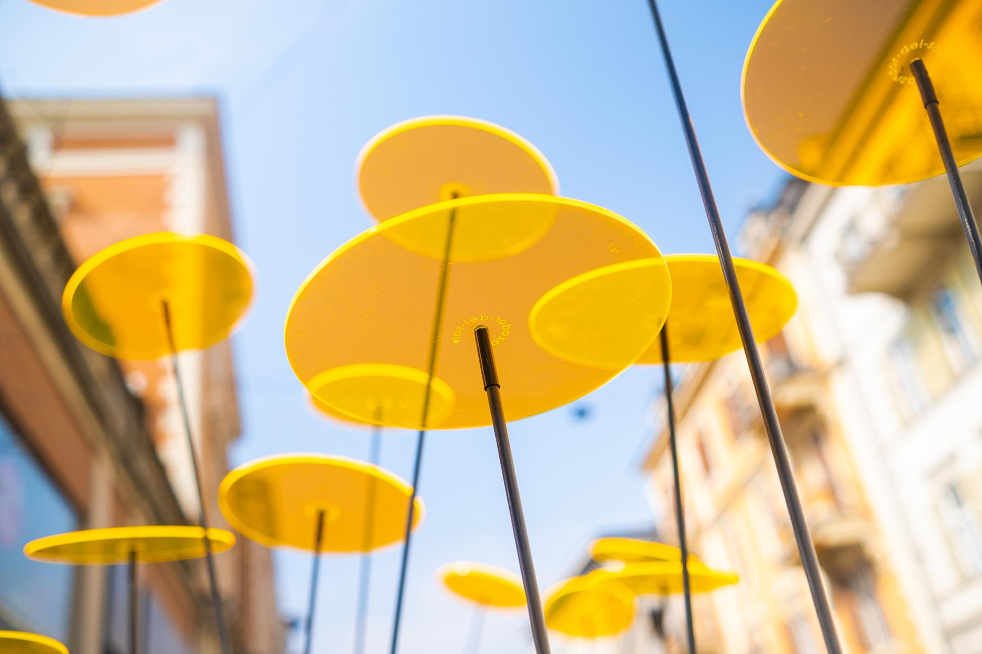 The Cazador-del-sol® are acrylic glass elements that catch the light and emit it again. They reach their greatest potential of radiance at dawn, when the sky is overcast and at dusk. The stem material is fibreglass so that it can move in the wind.