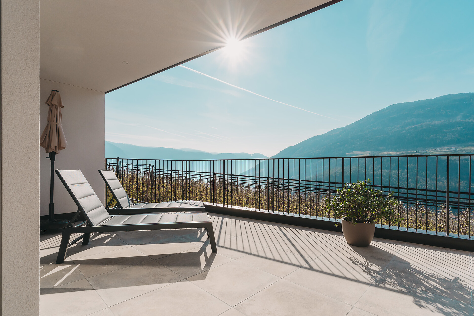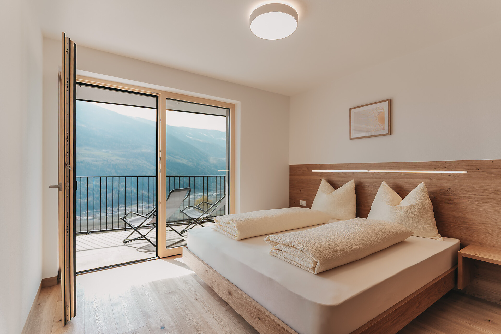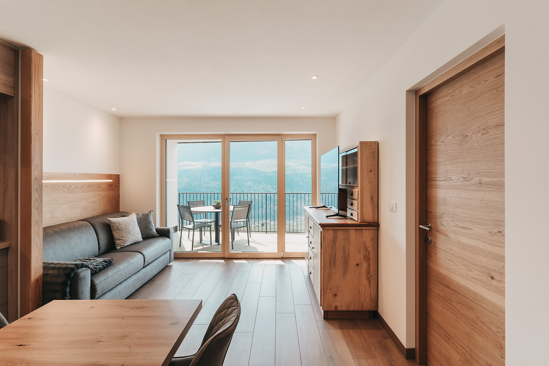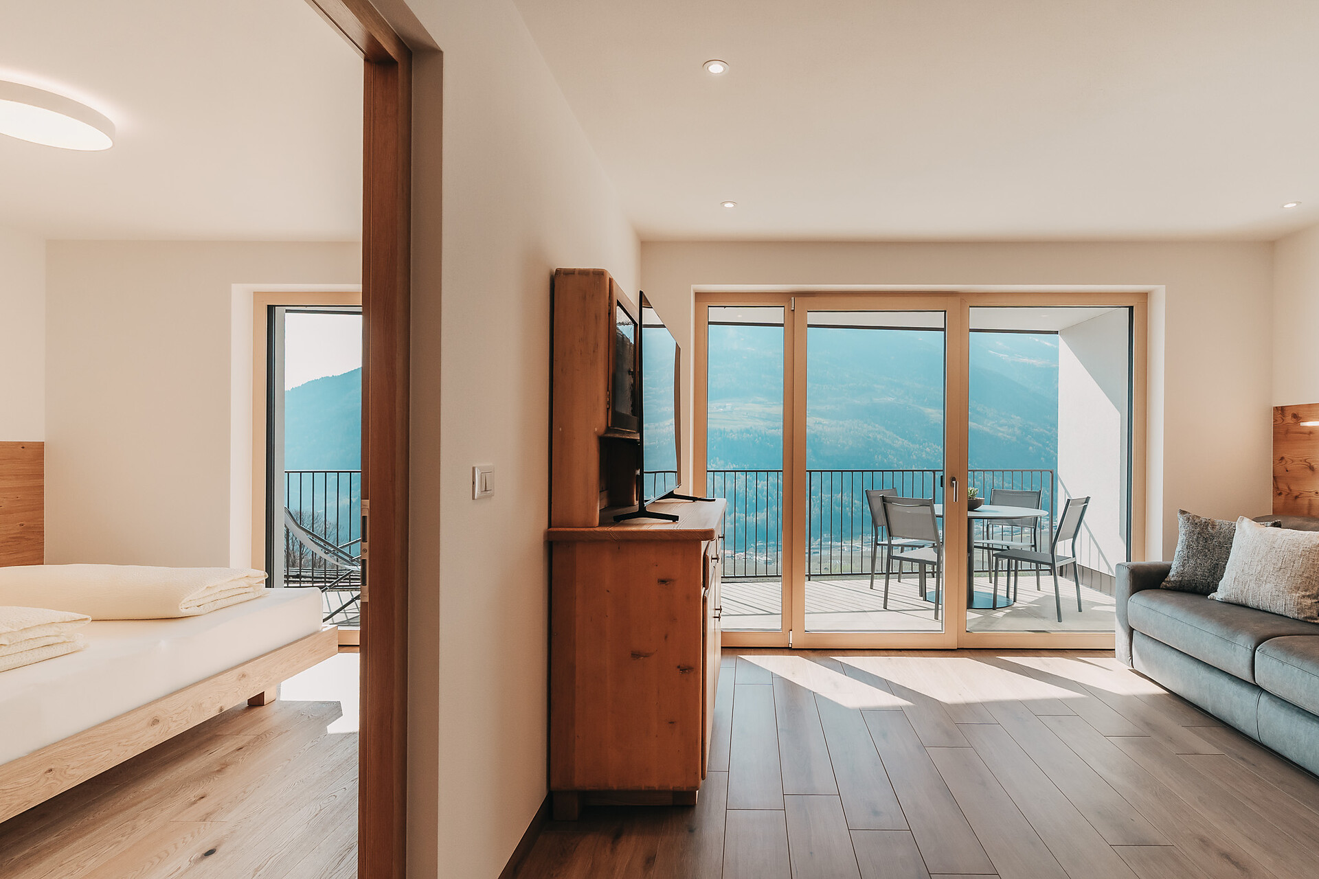 The high-quality, stylish and naturally furnished holiday flat offers a living area with a pull-out sofa bed, a fully equipped kitchen, a bedroom, a bathroom and a covered balcony with adjoining terrace (28 m²) and a fantastic view. All rooms, except the bathroom, face south.