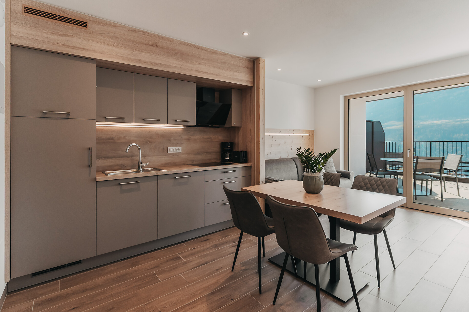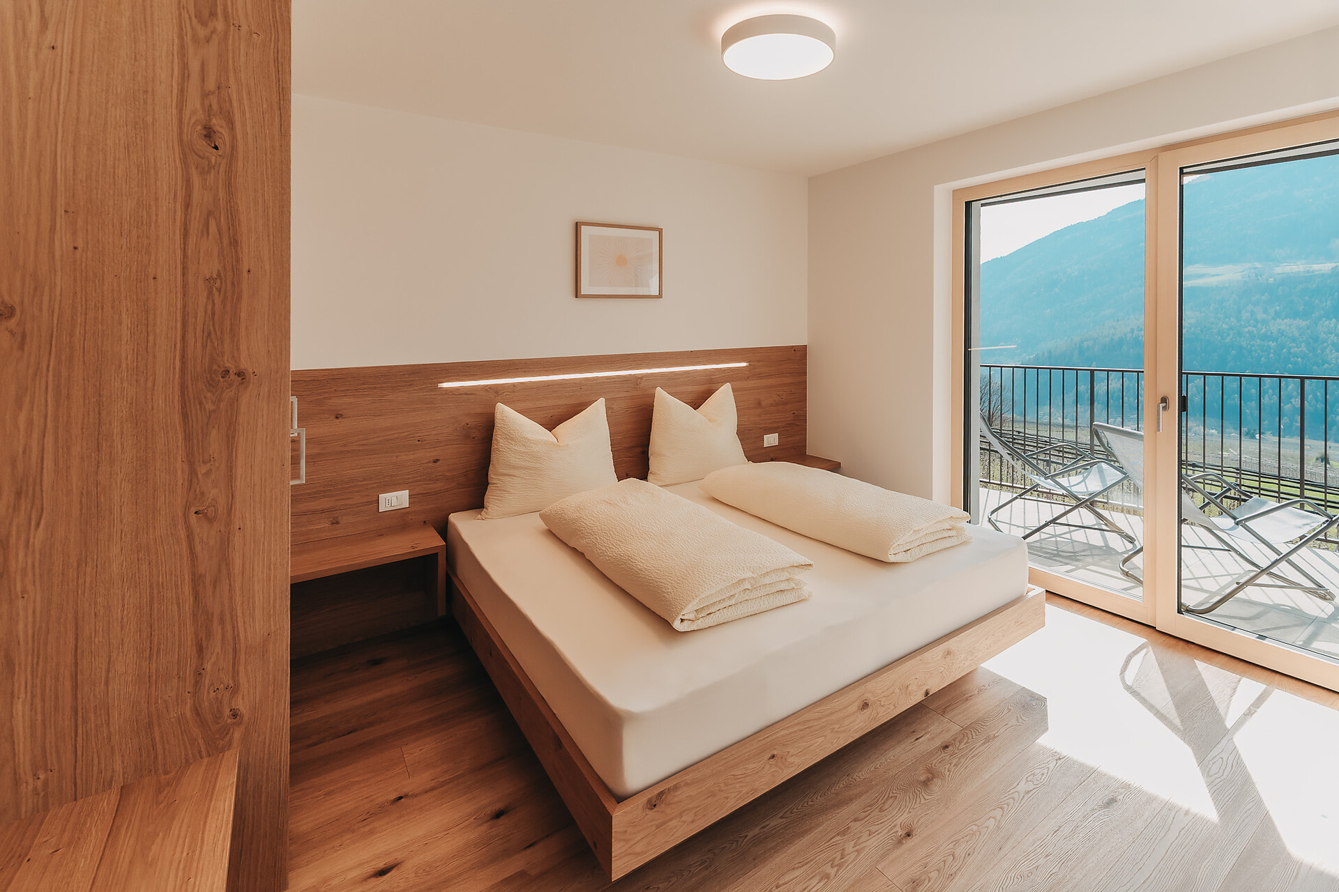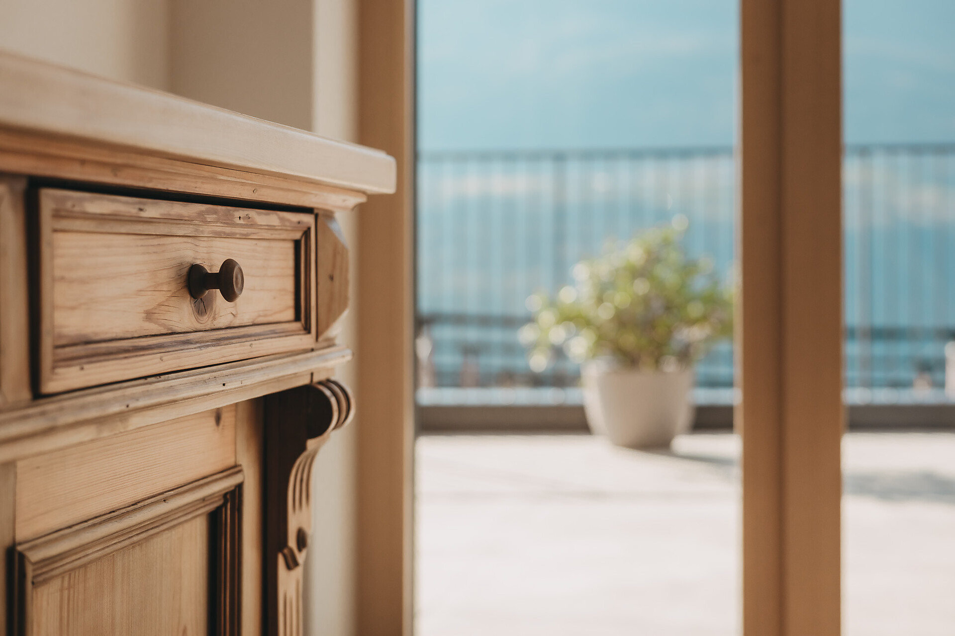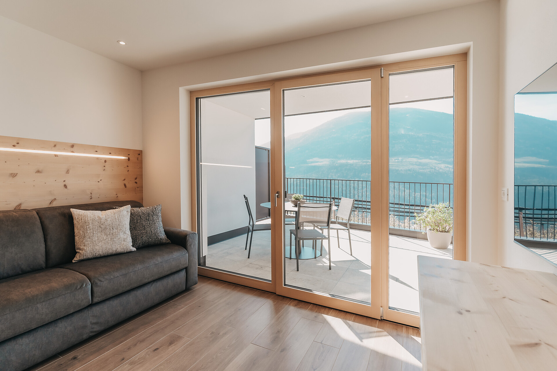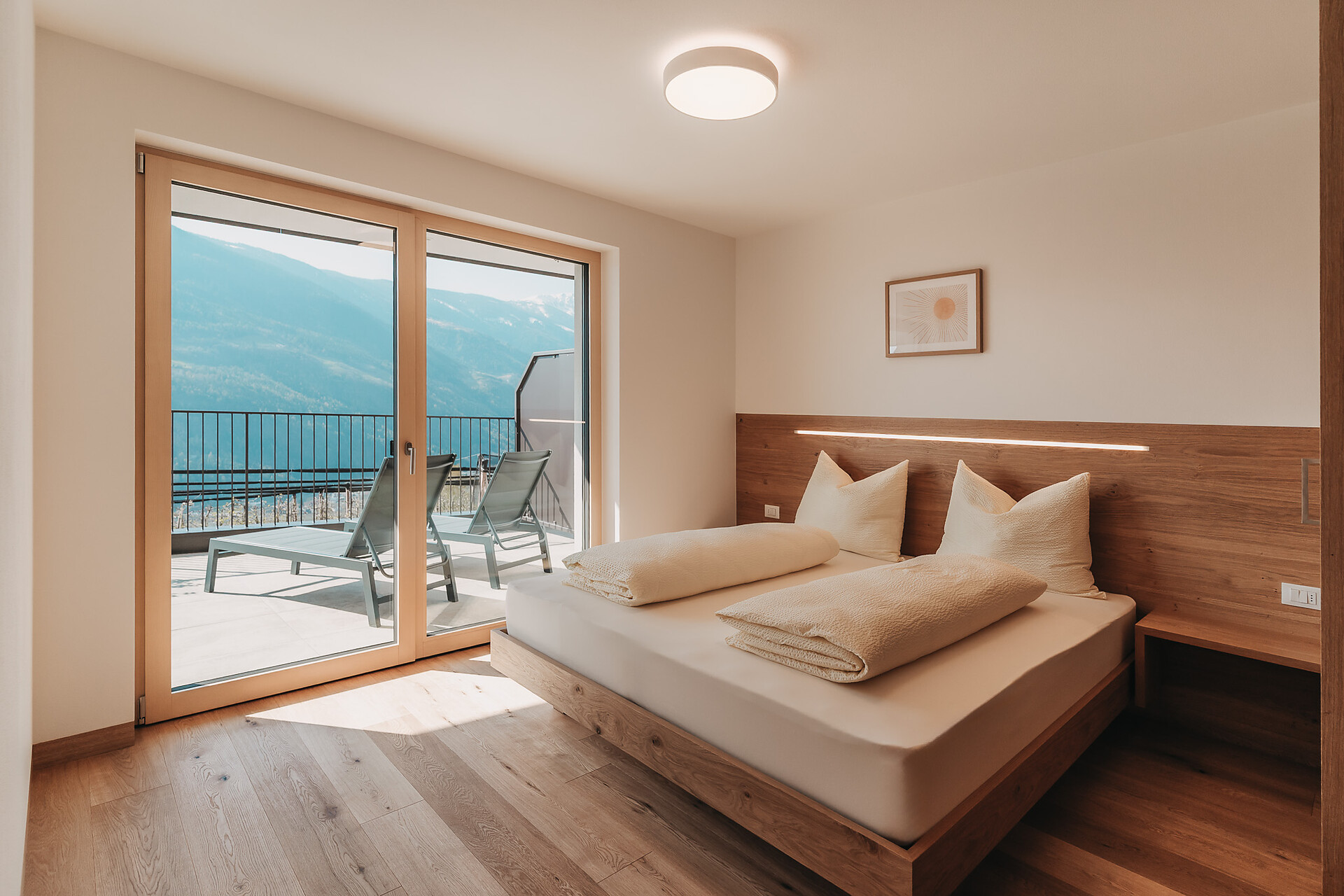 The high-quality, stylish and naturally furnished holiday flat offers a living area with a pull-out sofa bed, a fully equipped kitchen, a bedroom, a bathroom and a covered balcony with adjoining terrace (28 m²) and a fantastic view. All rooms, except the bathroom, face south.