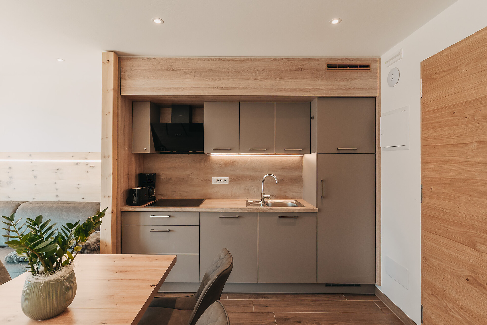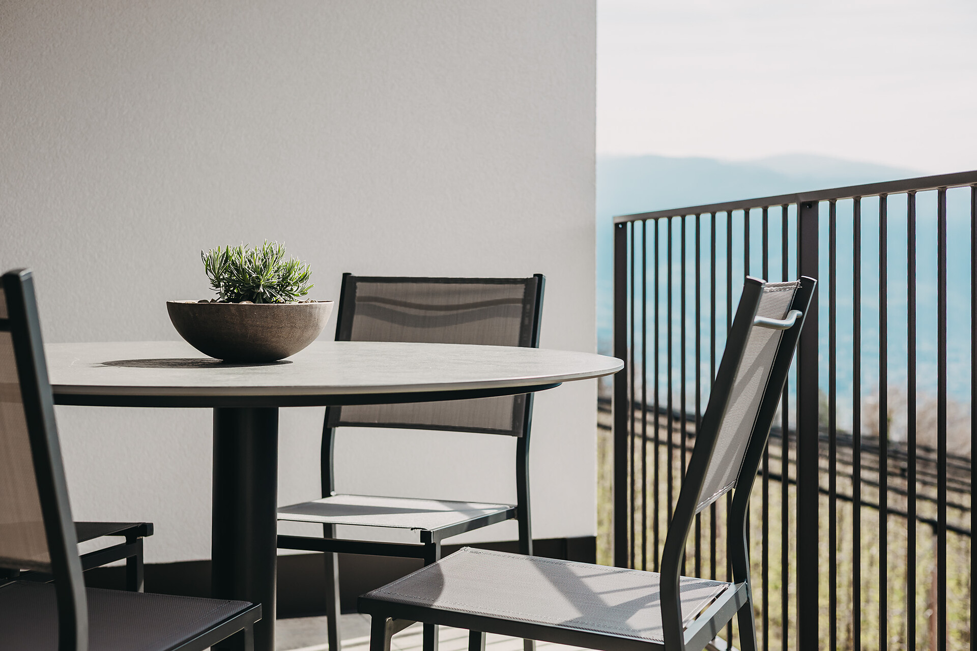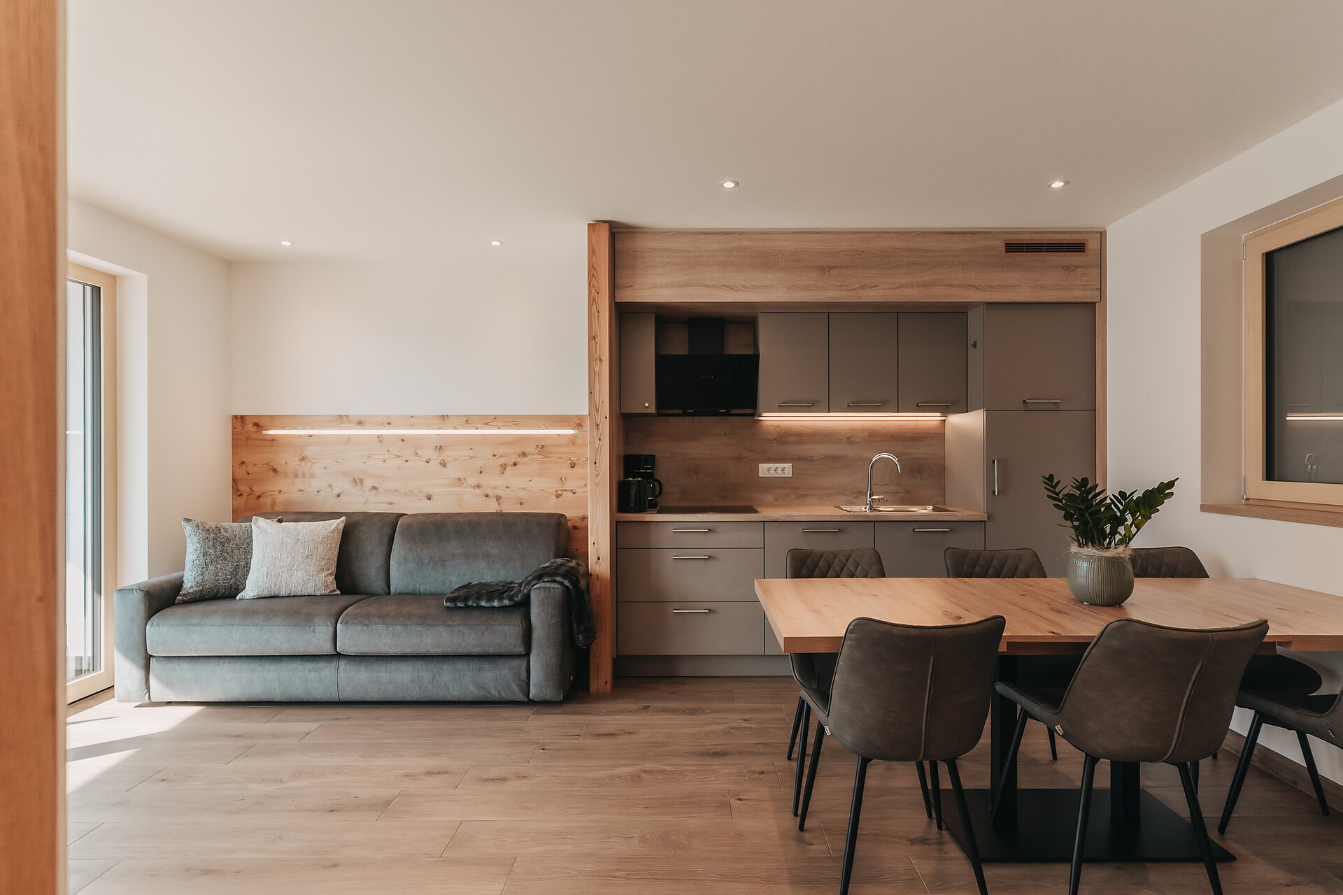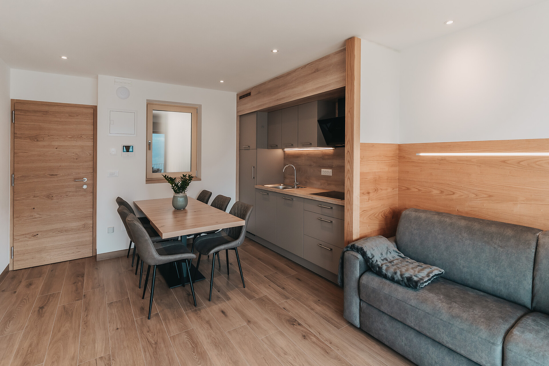 The high-quality, stylish and naturally furnished holiday flat offers a living area with a pull-out sofa bed, a fully equipped kitchen, a bedroom, a bathroom and a covered balcony with adjoining terrace (28 m²) and a fantastic view. All rooms, except the bathroom, face south.